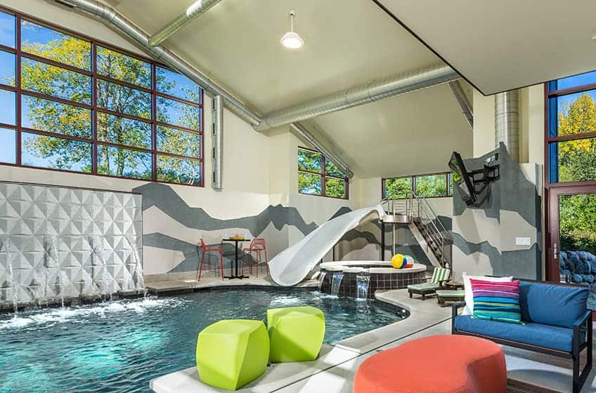 Pools designed for recreation offer amenities that bring energy and excitement to outdoor living. Slides or twisty waterslide styles deliver the rush of sliding into deeper water. Deck mounted accessories invite friendly games of basketball or volleyball. Careful depth planning accommodates diving boards, while splash pads and fountains add interactive fun. These features are built for action, so the pool becomes the center of play and connection for all ages.