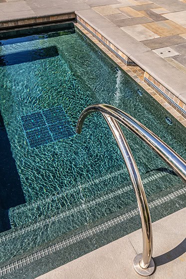 Safety is a key consideration in thoughtful pool design, especially for families with children, pets, or frequent guests. A first step is local zoning requirements that regulate enclosures and setbacks to ensure your pool is as safe as it is enjoyable. Fencing, self-latching gates, and raised spa edges help reduce risks by creating clear physical boundaries. Steps and stairs enhanced with a tile edge, railings, depth planning, and slip-resistant surfaces make entering and exiting the pool safer and more comfortable. Automated safety covers not only keep debris out but also provide a secure surface strong enough to walk on—helping prevent accidental falls into the water.