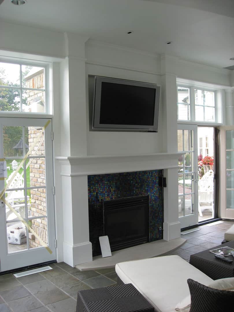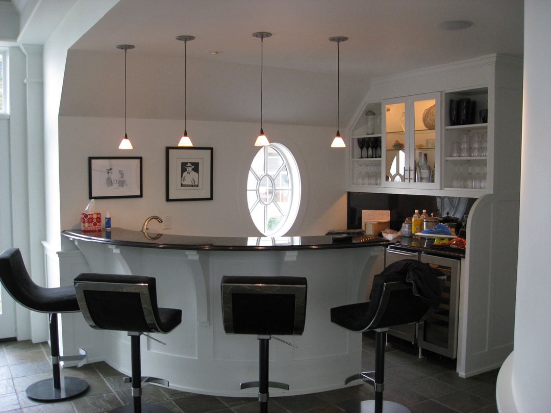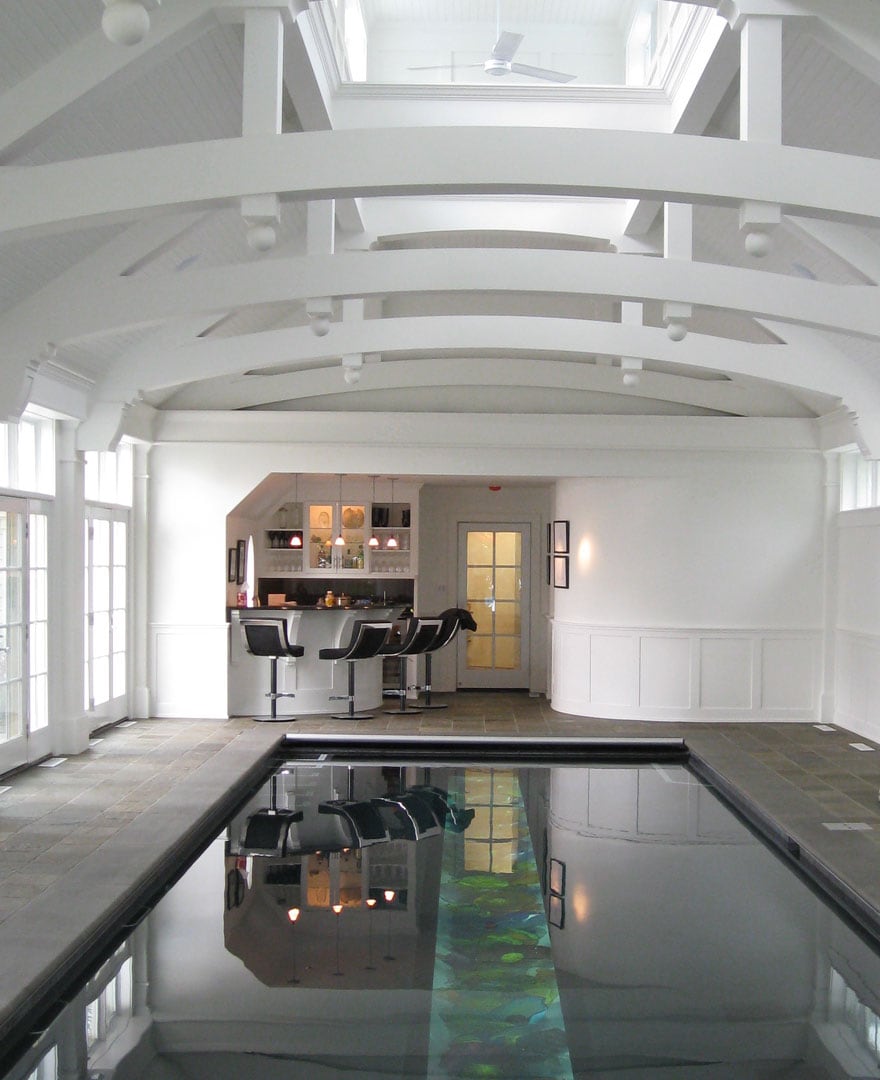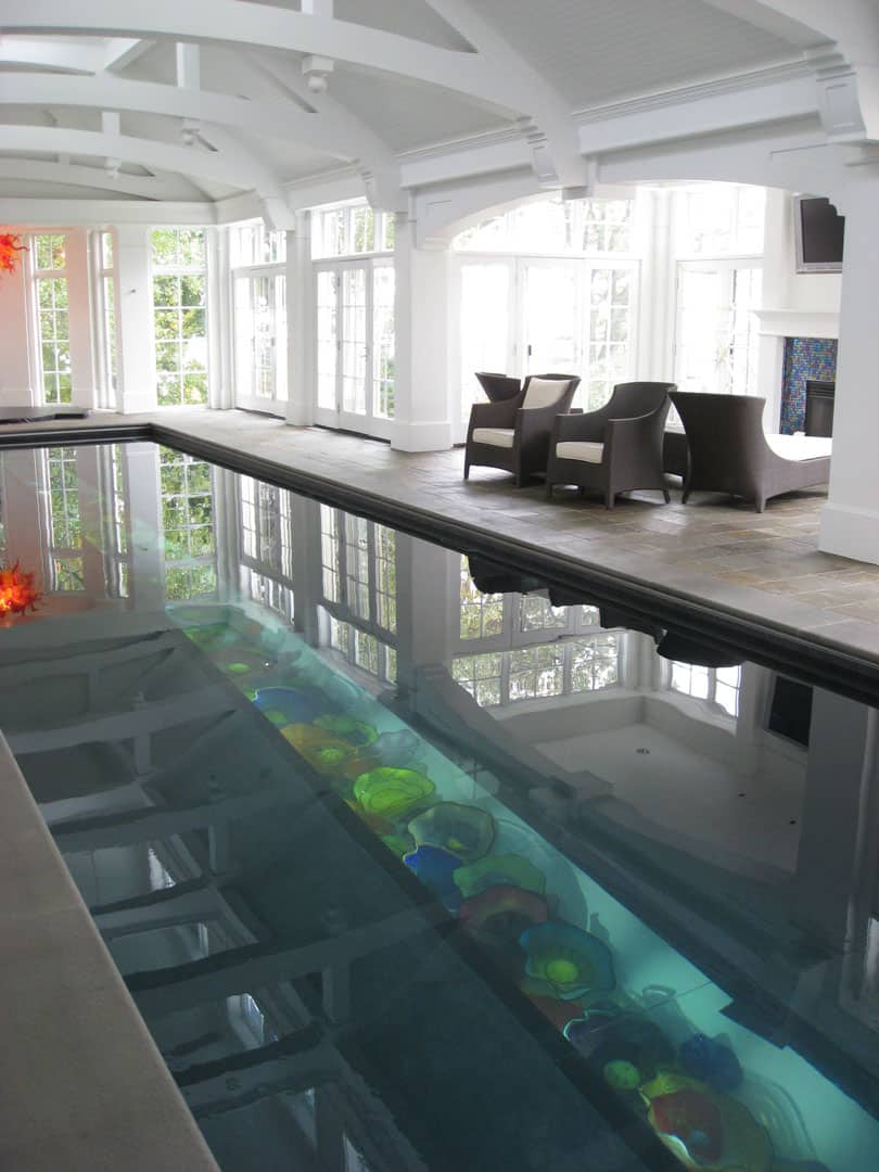 Free flowing access to the full Wet Bar Beverage area and exterior Sun Terrace adjacent to the indoor Living area promote a social atmosphere that revolves around the pool. The fully appointed Bath and Changing Area provide the upscale amenity of a world class spa to visitors and homeowners alike. French Doors open to the Garden and Terrace, connecting to the Lake view beyond. Upper transom and clerestory windows bathe the interiors with natural light and diminish the separation between indoors and outdoors. Perimeter glass affords views of the extensive lawn and gardens that surround the addition. Inspired by the owner’s passion for art glass, the design incorporates both hanging and underwater glass sculptures. The black plaster pool provides a contrasting back drop for the underwater self-illuminated glass sculptures that emulate a lush coral reef while providing a unique lane marker. The water naturally magnifies this artistic feature, charging the pool area with a lively energy.