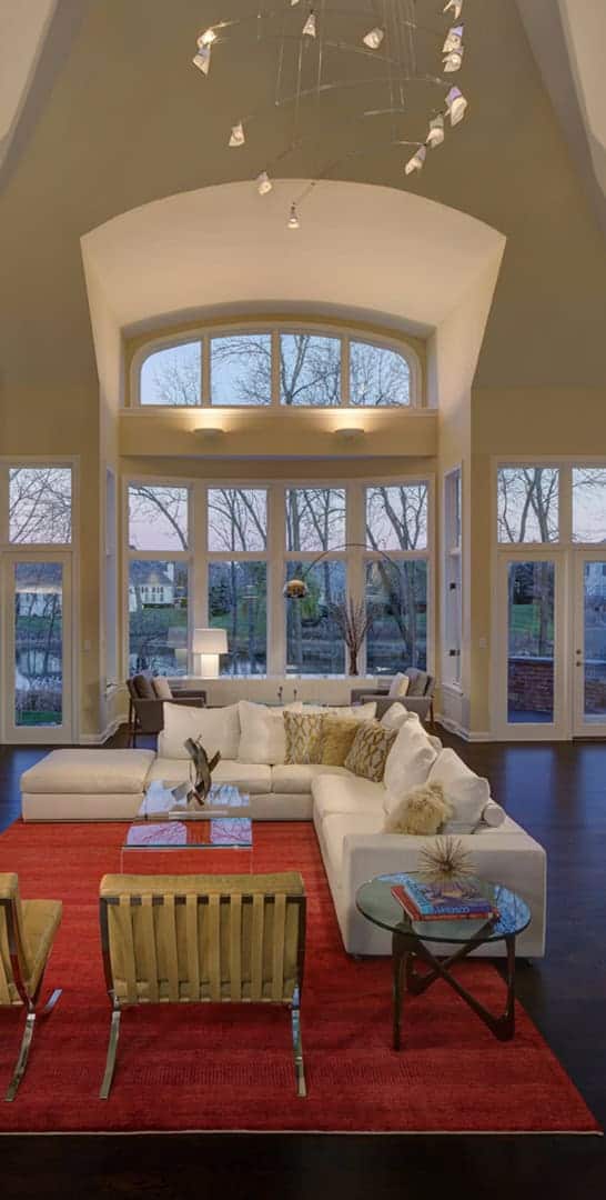 Strong horizontal details such as door and cabinet hardware, the use of ledge stone at the bar and fireplace, exaggerated mantel, and raised hearth create cohesiveness across the space. The entry to the home opens to the two-story Great Room that feels more human-scale by using area rugs and furniture groupings to break down the space. Elements of natural materials combined with organic, geometric and horizontal patterns show the integration of nature. Furniture has historical or European provenance, which adds to the mid-century modern style with the use of the accent color orange to subtly link rooms together.
