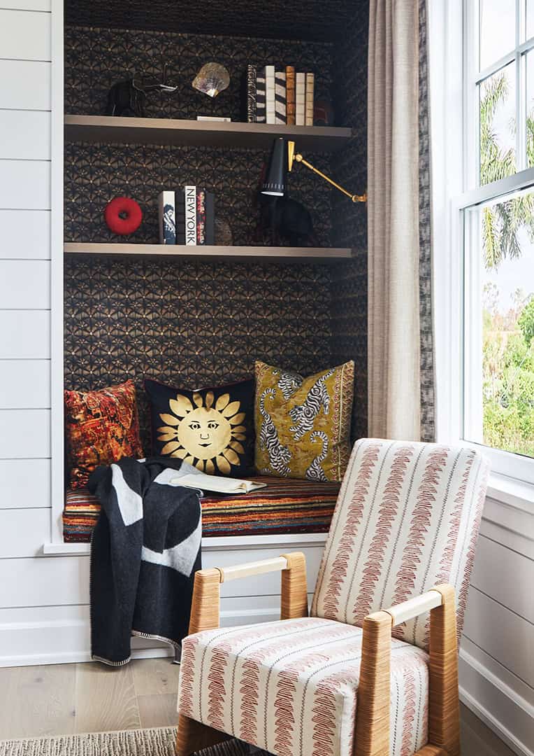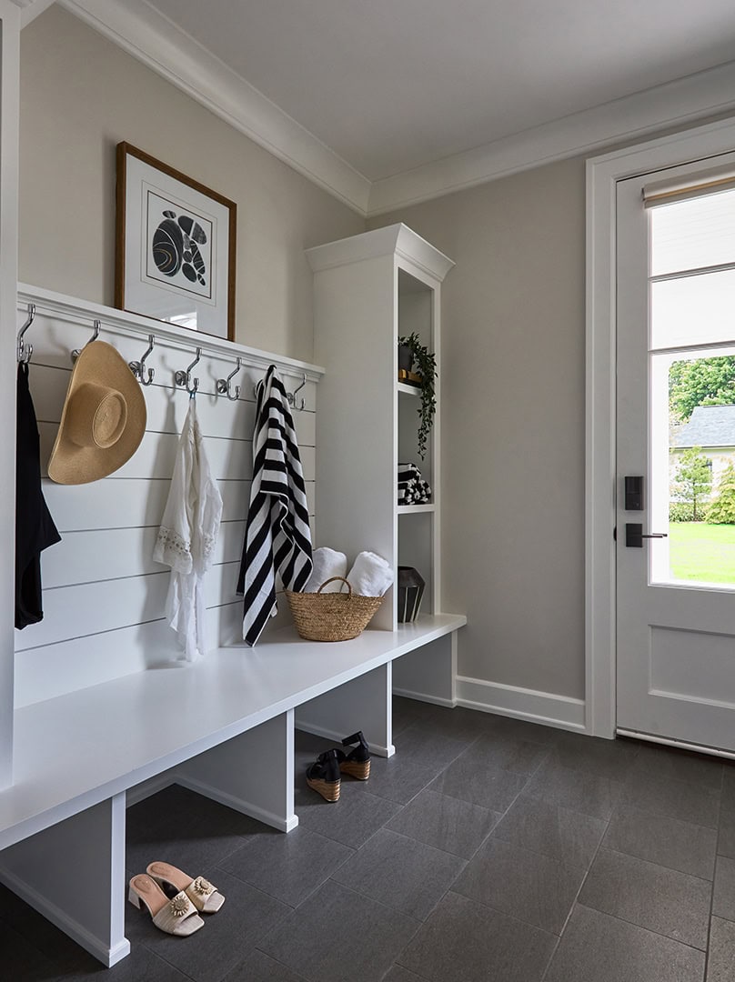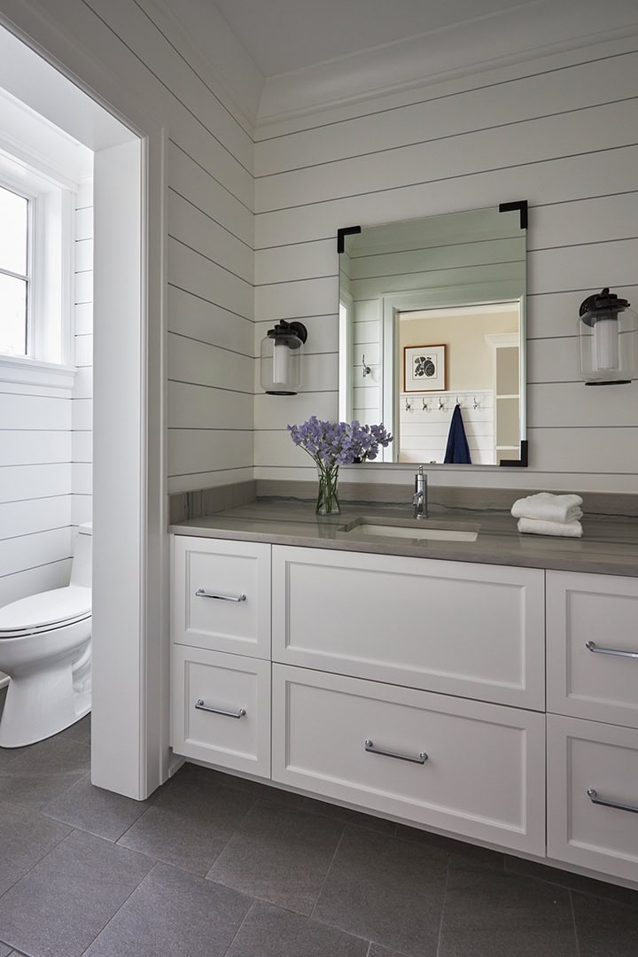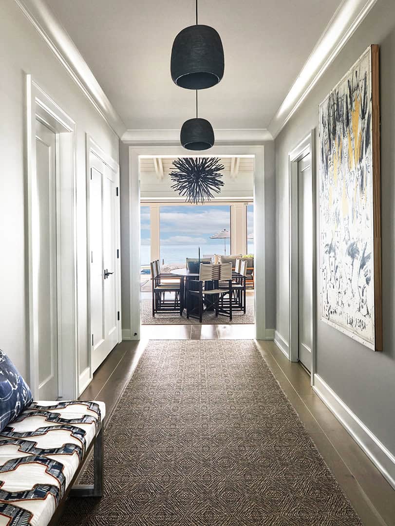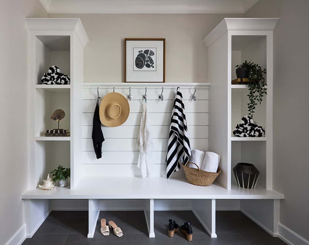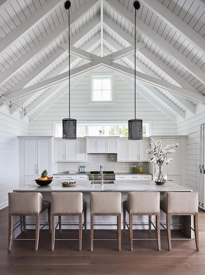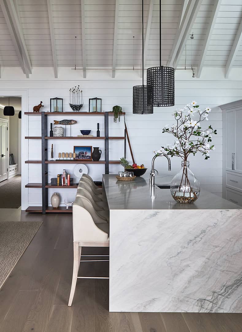 The interior design was carefully considered, featuring shiplap walls, ceiling beams and a dedicated art wall created to highlight an oversized David Yarrow photograph. The relaxed yet refined style evokes a casual, coastal aesthetic that complements the lakefront setting.