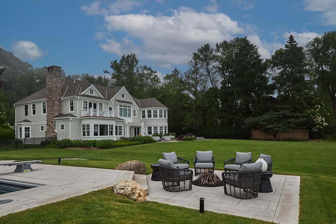 Outdoor amenities promote an active lifestyle with a raised spa and a pool with an auto cover that has a full-depth design suitable for the diving board, basketball, and swimming. An adjacent outdoor kitchen, grill, and pizza oven connect cooking with recreation. A remote-start firepit and discreet landscape lighting integrated into speaker-equipped bollards enhance evening ambiance and safety.