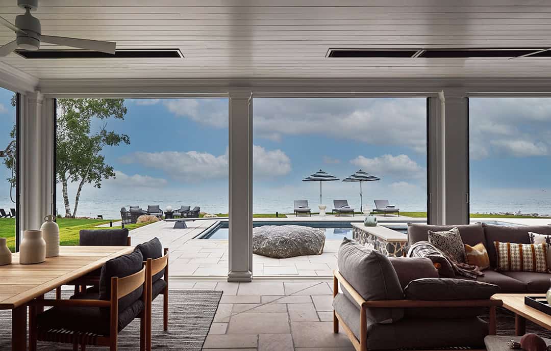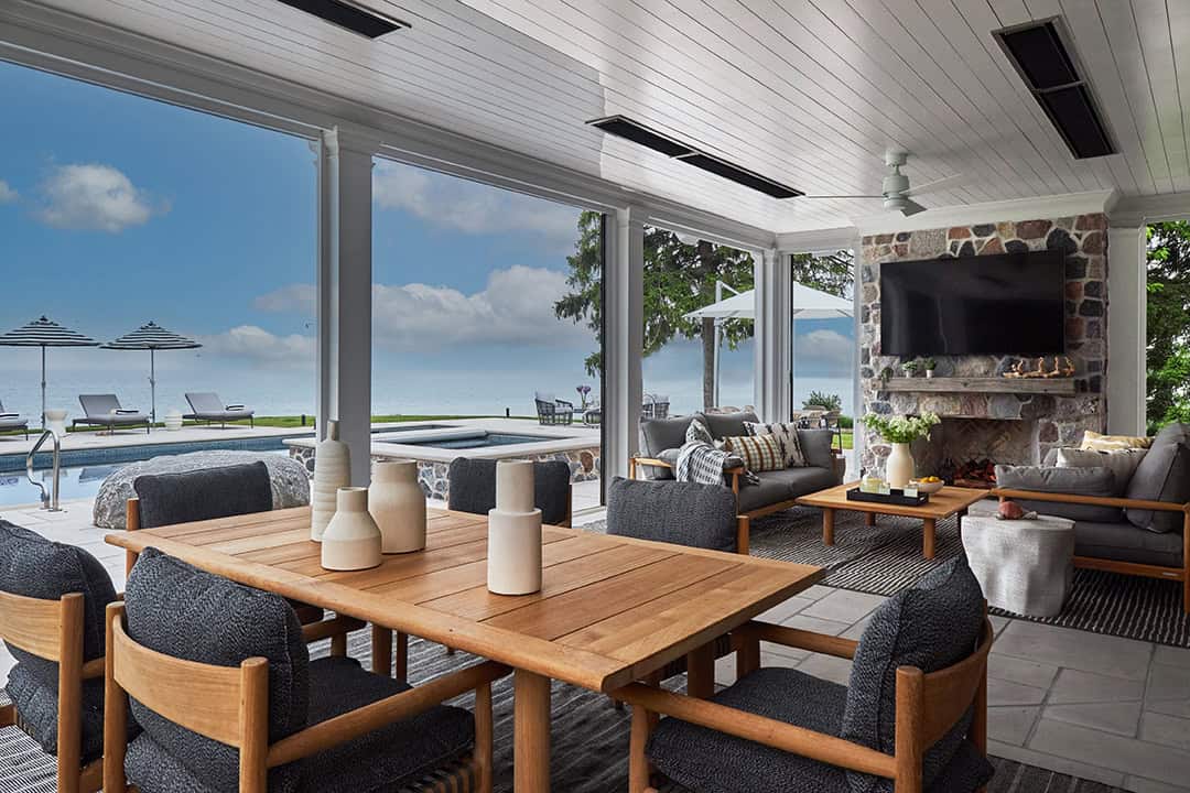 The open-concept kitchen, dining, and living area was designed for entertaining, with generous proportions and thoughtful flow for any sized gathering. The screen porch functions as an extension of the living space, outfitted with a retractable screen system, multi-slide doors, and radiant heaters, creating functionality throughout the seasons.