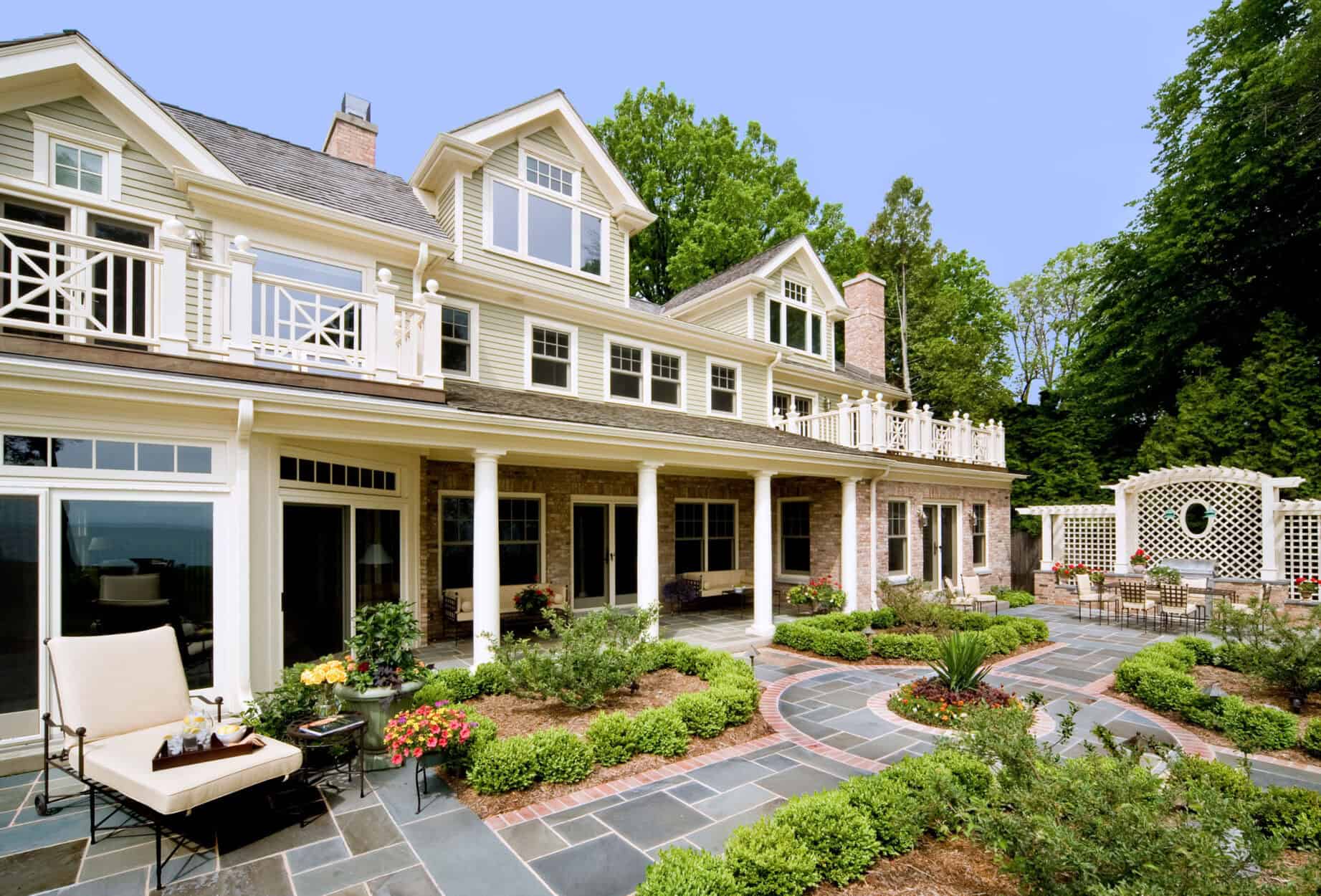 Utilizing the skeleton of the original building our team created a new consistent architectural language that holds the new and existing components together. On the exterior, the new entry courtyard welcomes and guides one to the new columned Front Entry. New exterior skin details support the true colonial nature of the home. The interior was completely remodeled and expanded. The room locations were reorganized and take advantage of natural light and the expansive lake views.