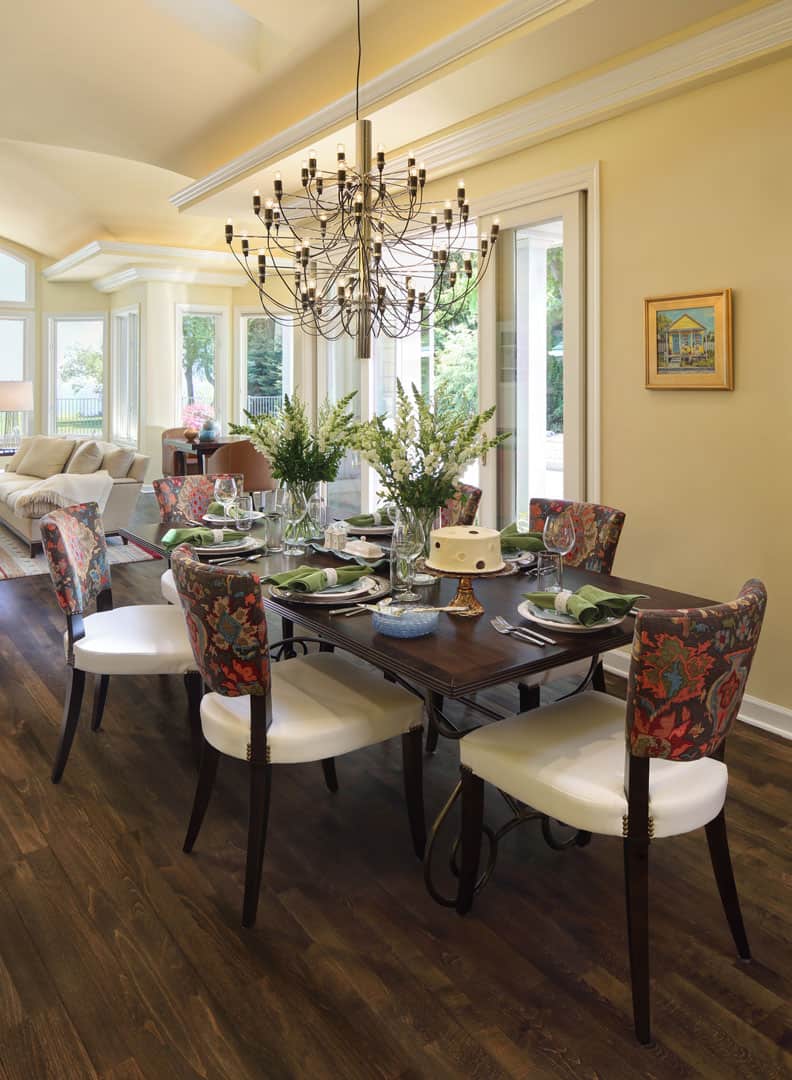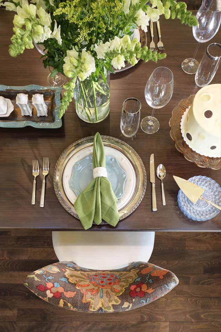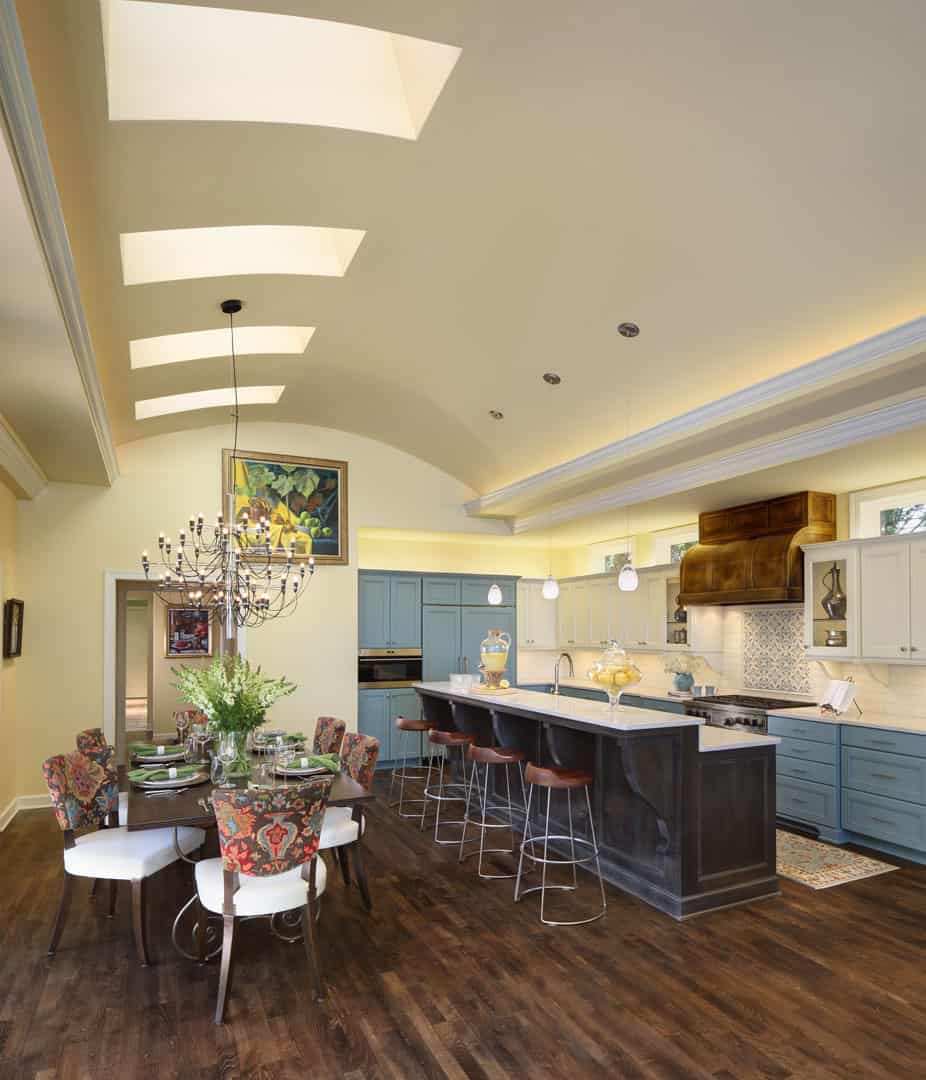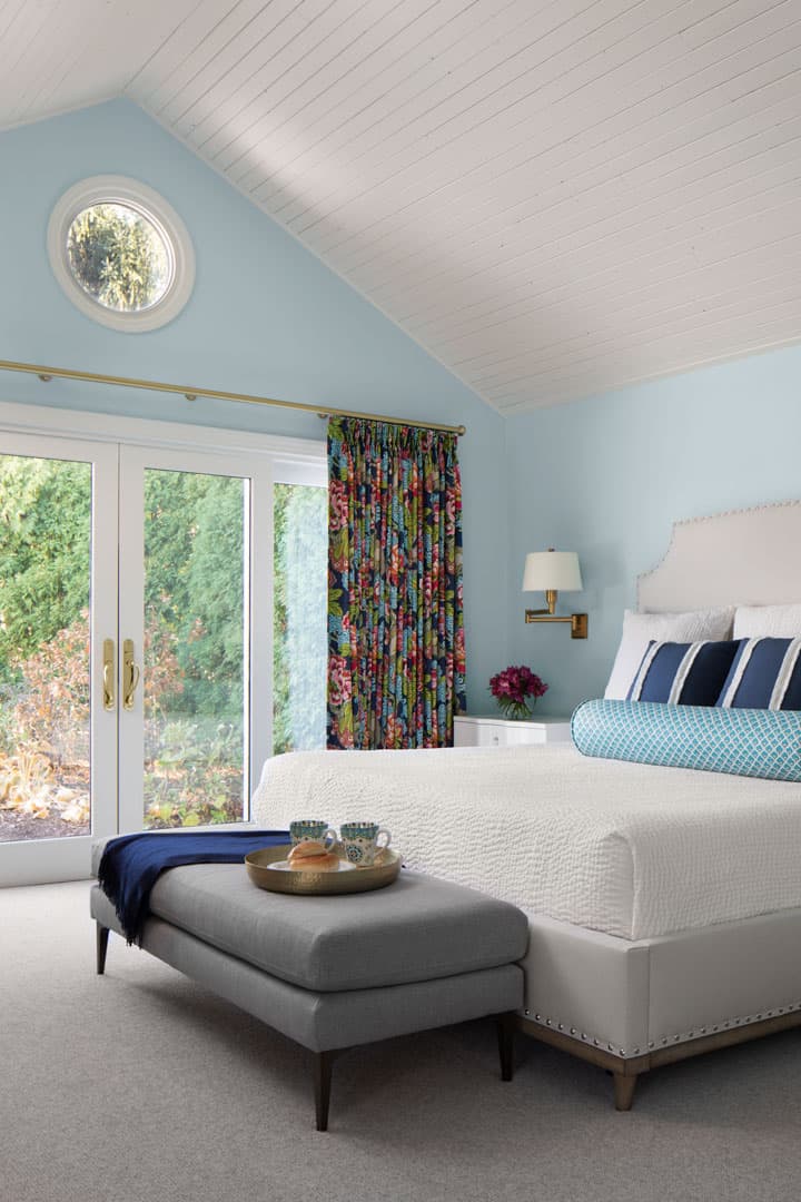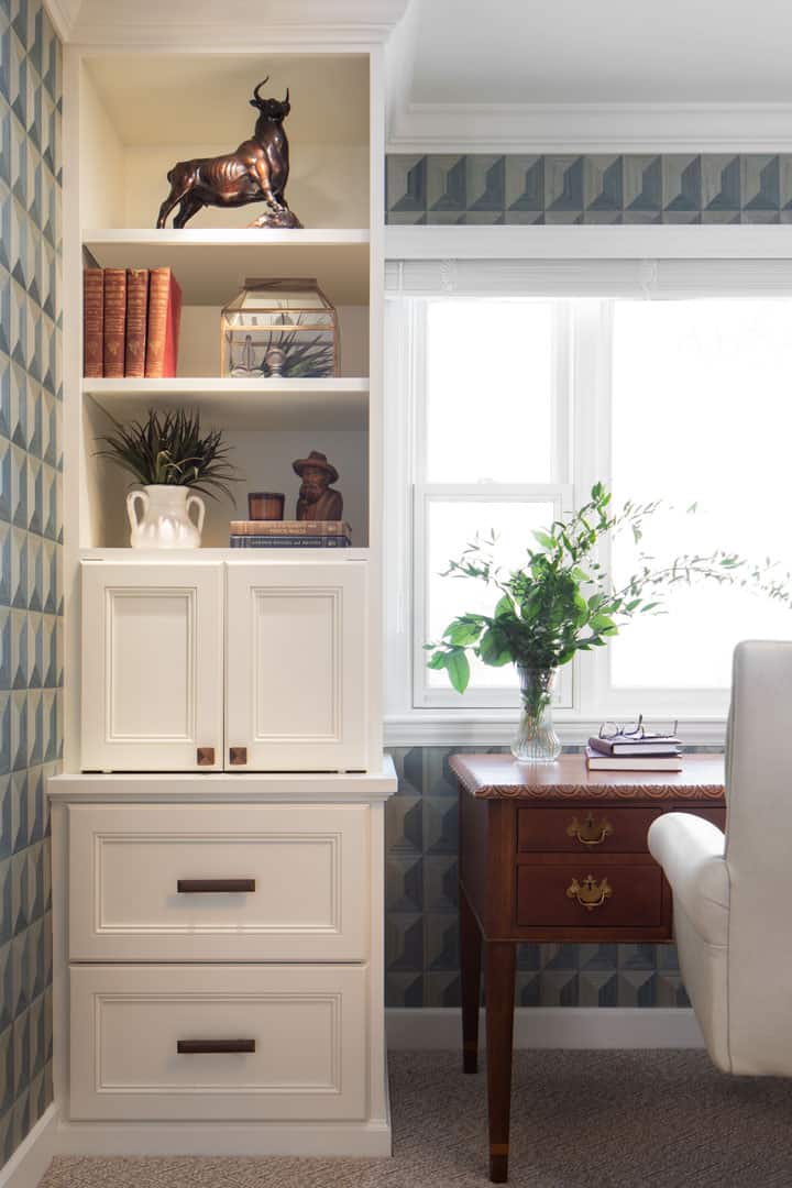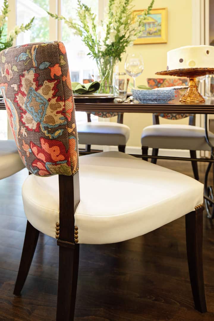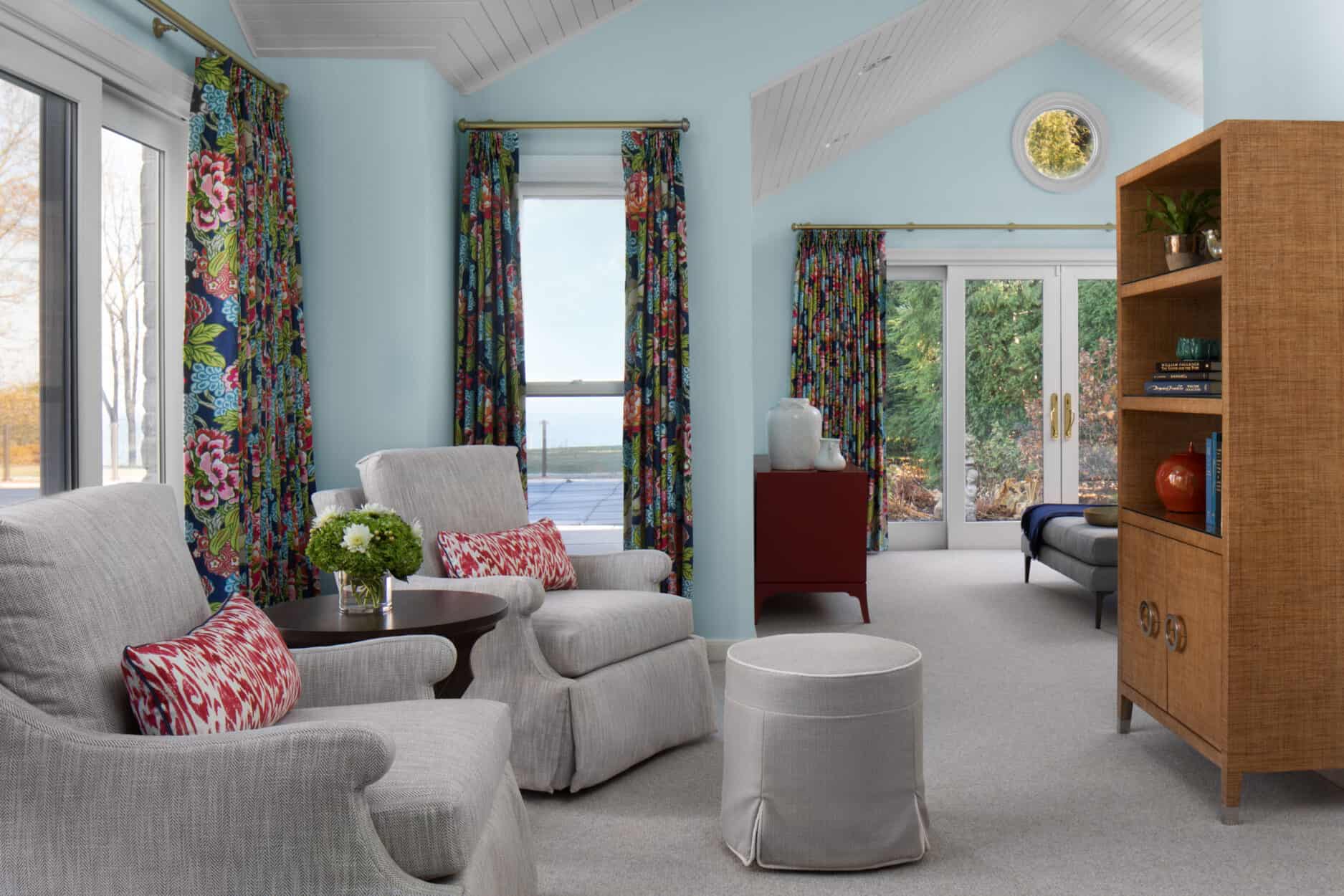 Phase I of the whole house transformation was the fresh new kitchen that supports a love of lake living, a happy color palette and large family gatherings. What was originally an L-shaped design was re-imagined to enhance function, integrate with the Family Room, and reflect back the brightness of the lake. The interior design greatly enhances the vaulted ceiling and included new clerestory windows, cove lighting and decorative light fixtures. Modern touches blend seamlessly with vintage elements to create a sense of history for a client with eclectic sensibilities. In Phase II, the existing plan had an underutilized entrance, so opening the foyer to create a natural promenade to the living room and views beyond make for an impressionable greeting. The client’s love for color was tastefully woven throughout the home. Modern fabrics and wall-covering in colorful florals and dimensional patterns are supported by vibrant furniture pieces and complimentary accessories. A light a cheerful palette provided consistency throughout. Making the overall scheme cheerful with a splash of drama enlivened the design and brought a cohesive finish throughout, resulting in a refreshed home to be enjoyed into their next phase of life.