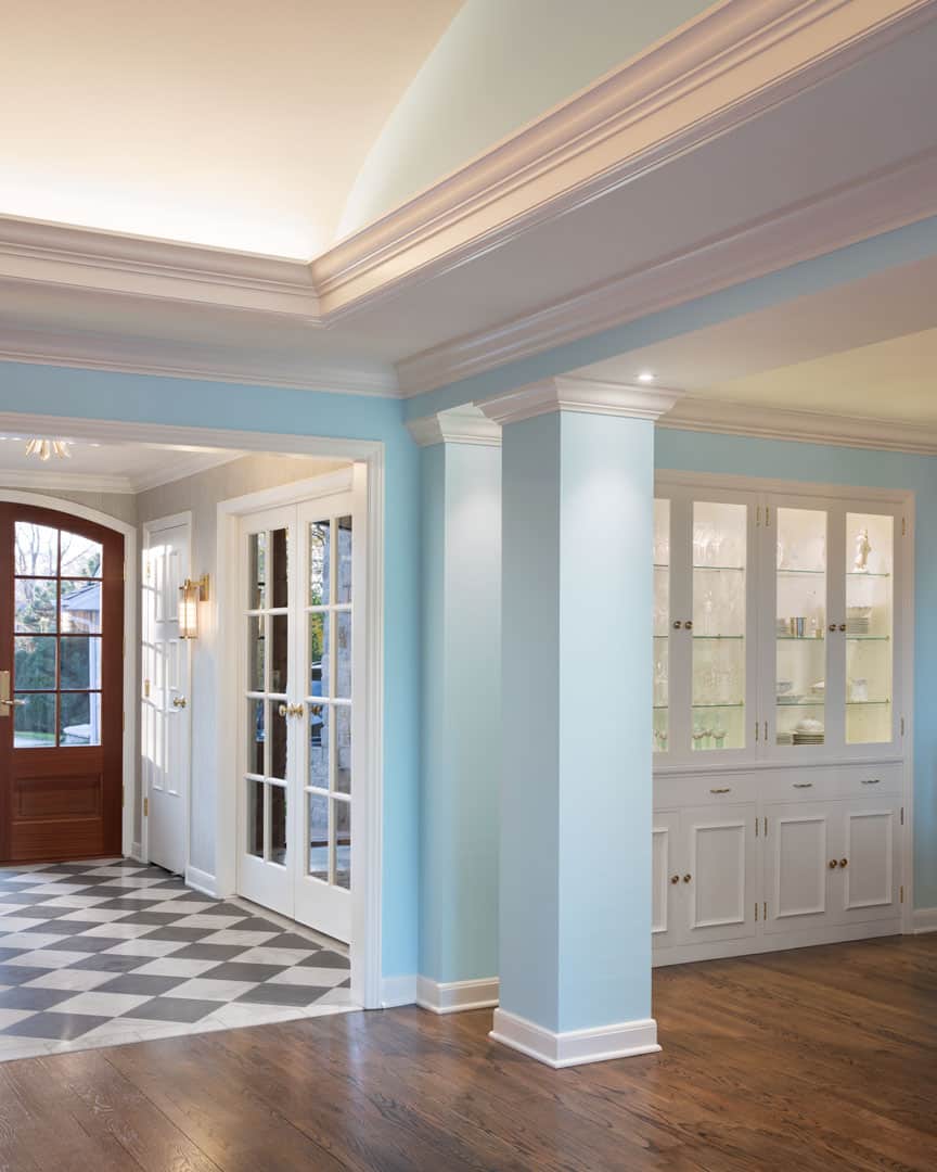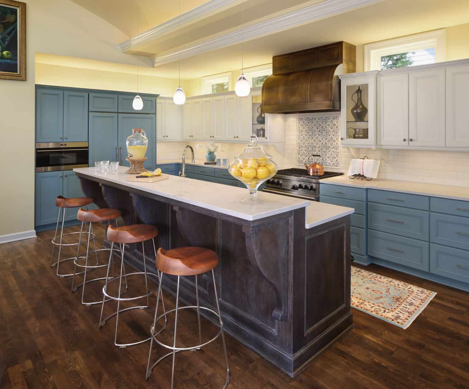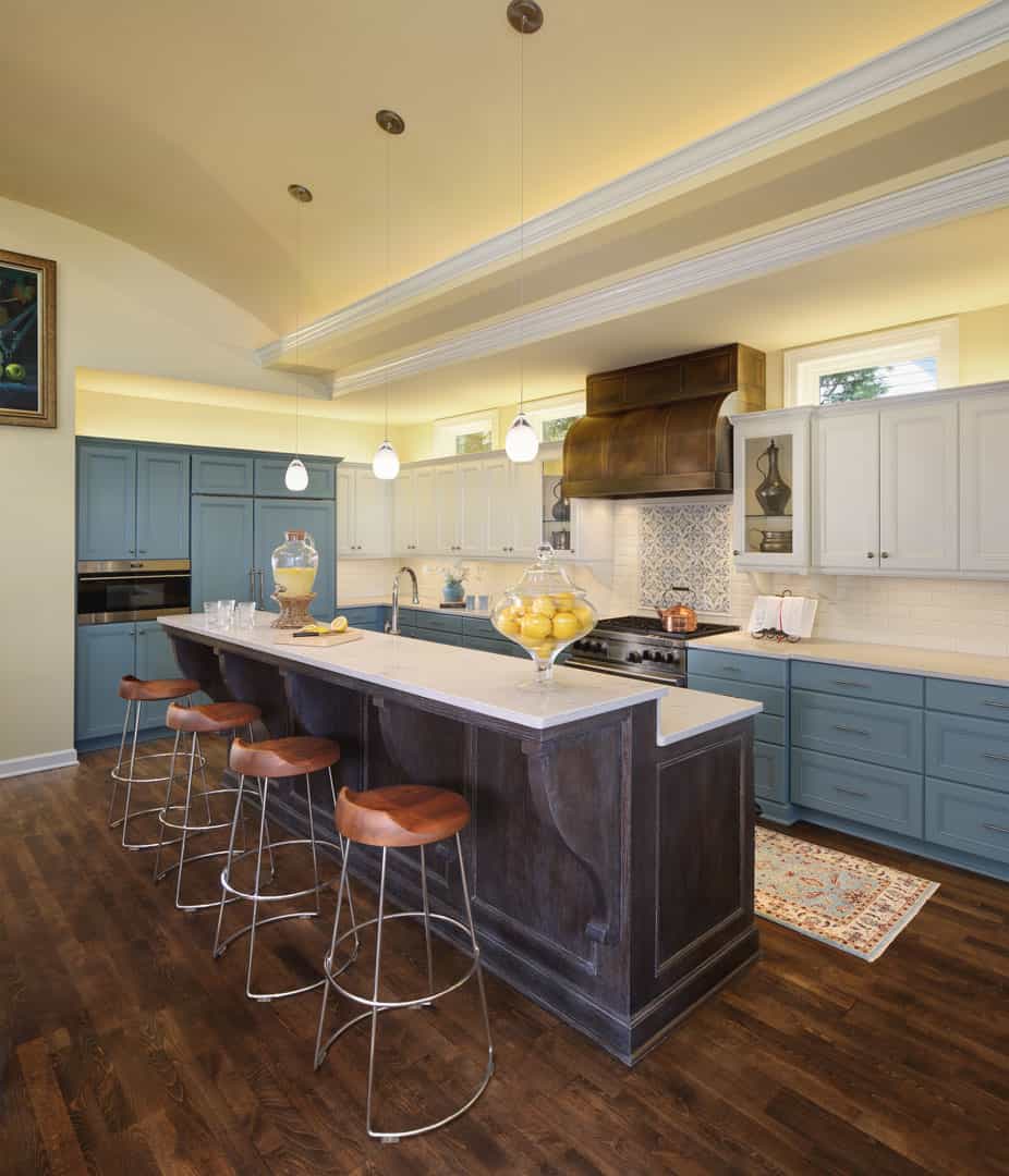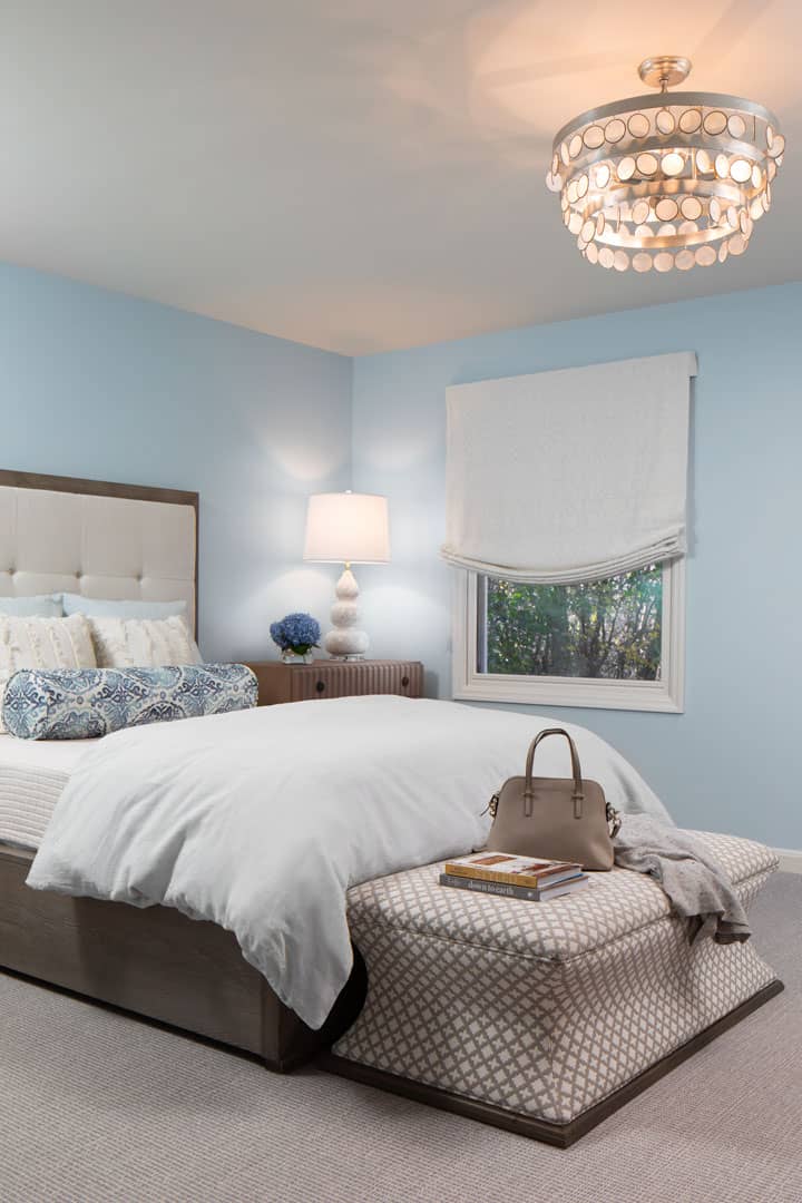 The challenges were improving the layout, uniting the style with previous remodels, and using color to compliment the client’s personality to better reflect its Lake Michigan locale. To achieve unity with previous remodels, we balanced modern and traditional elements. To complement existing polished brass hardware, we intentionally mixed metals introducing elements of nickel among lighting, drapery and hardware creating a collected look.