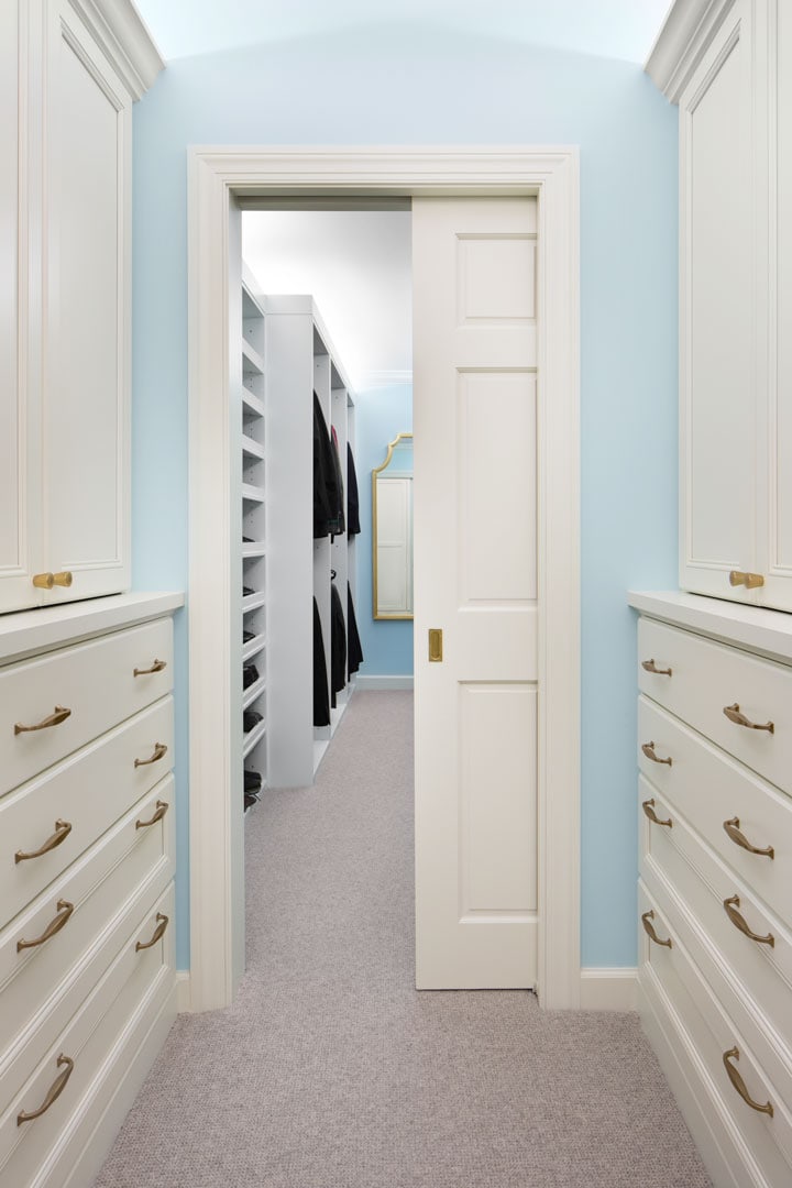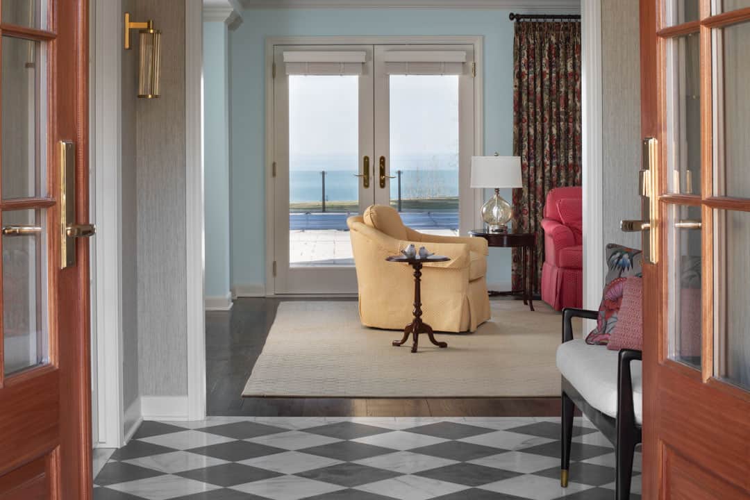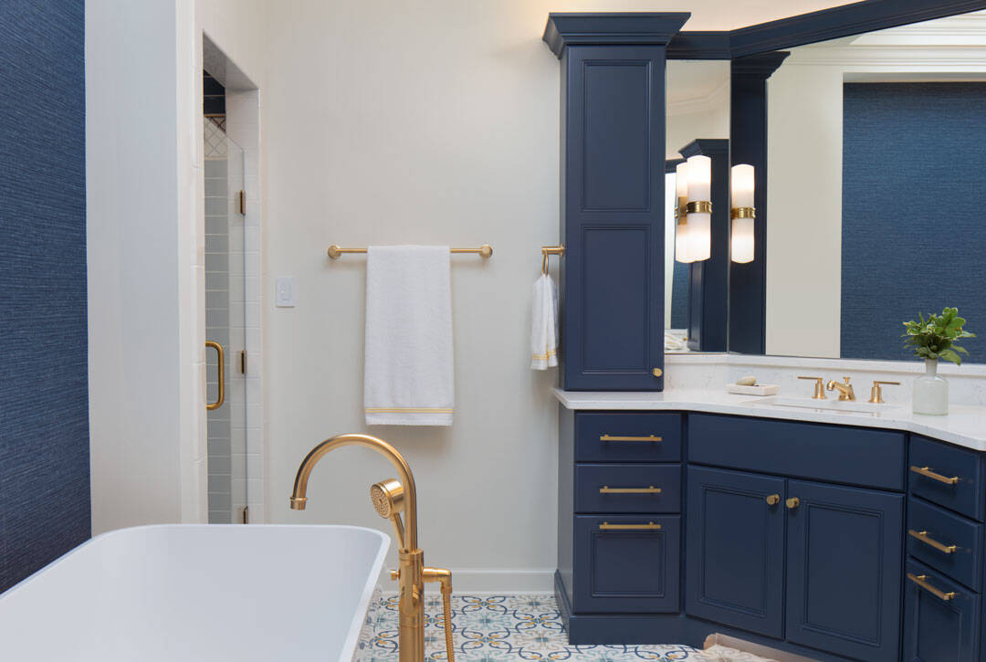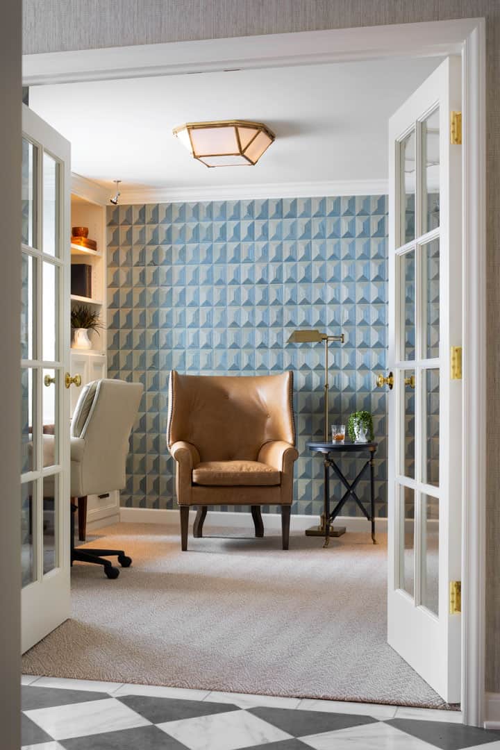 The challenges were improving the layout, uniting the style with previous remodels, and using color to compliment the client’s personality to better reflect its Lake Michigan locale. To achieve unity with previous remodels, we balanced modern and traditional elements. To complement existing polished brass hardware, we intentionally mixed metals introducing elements of nickel among lighting, drapery and hardware creating a collected look.