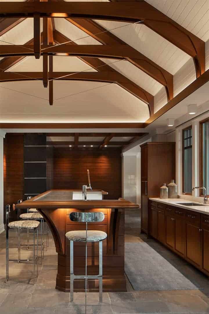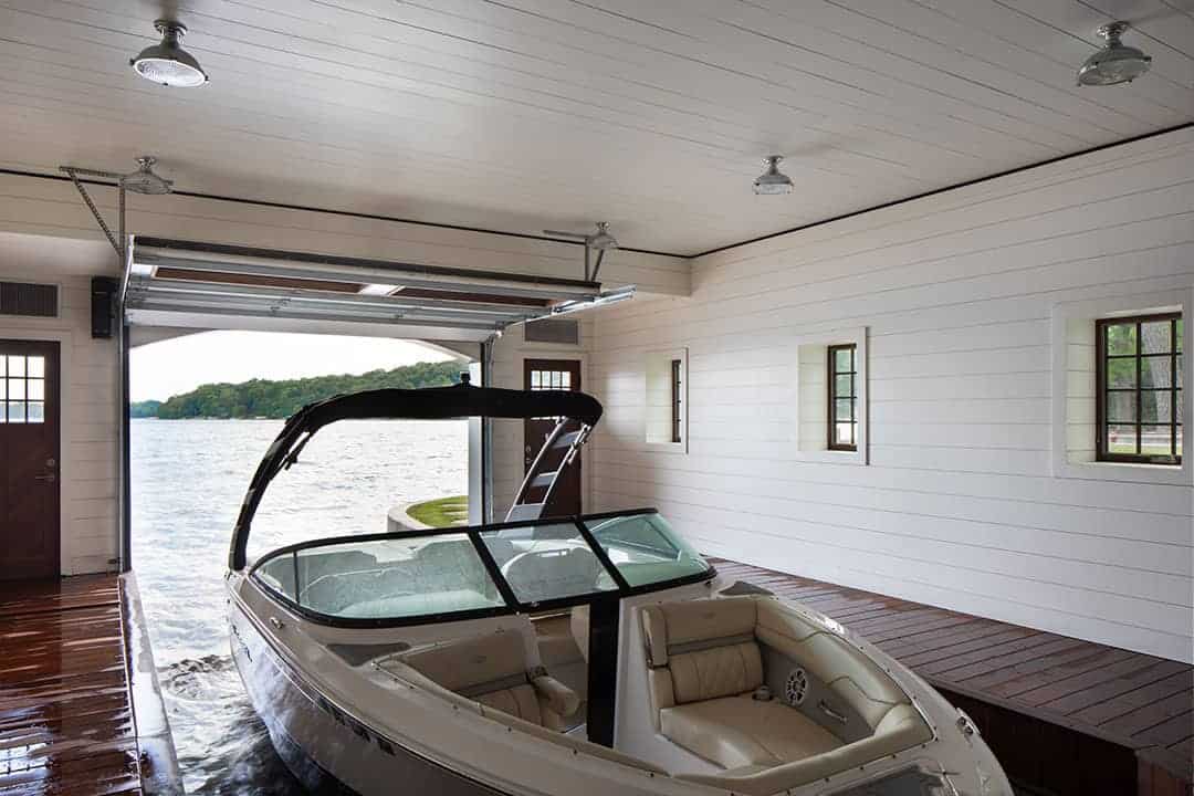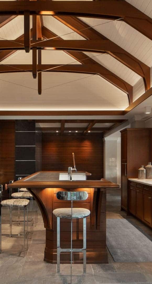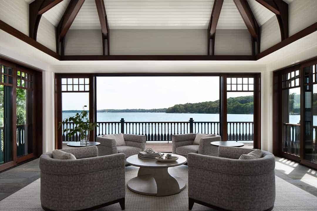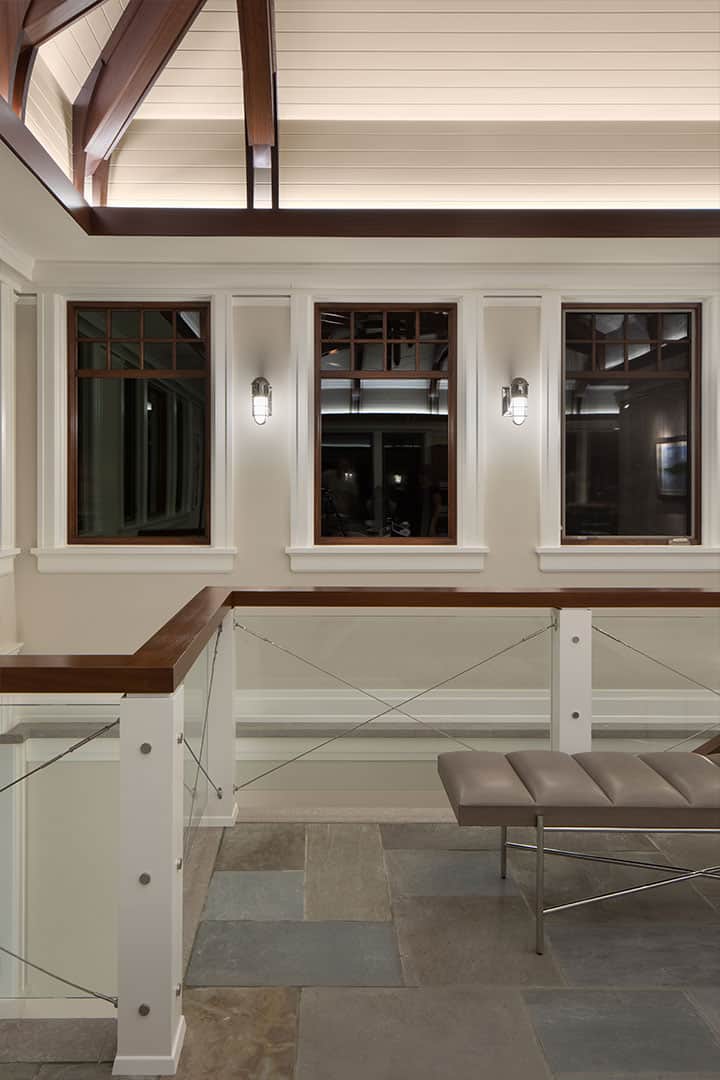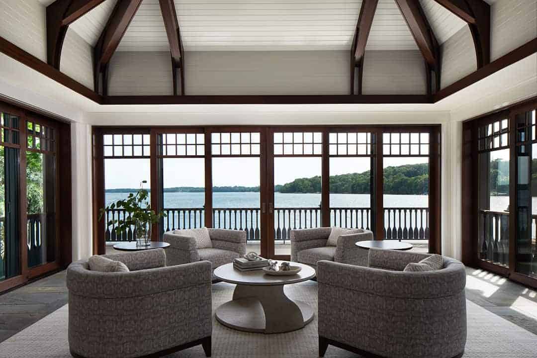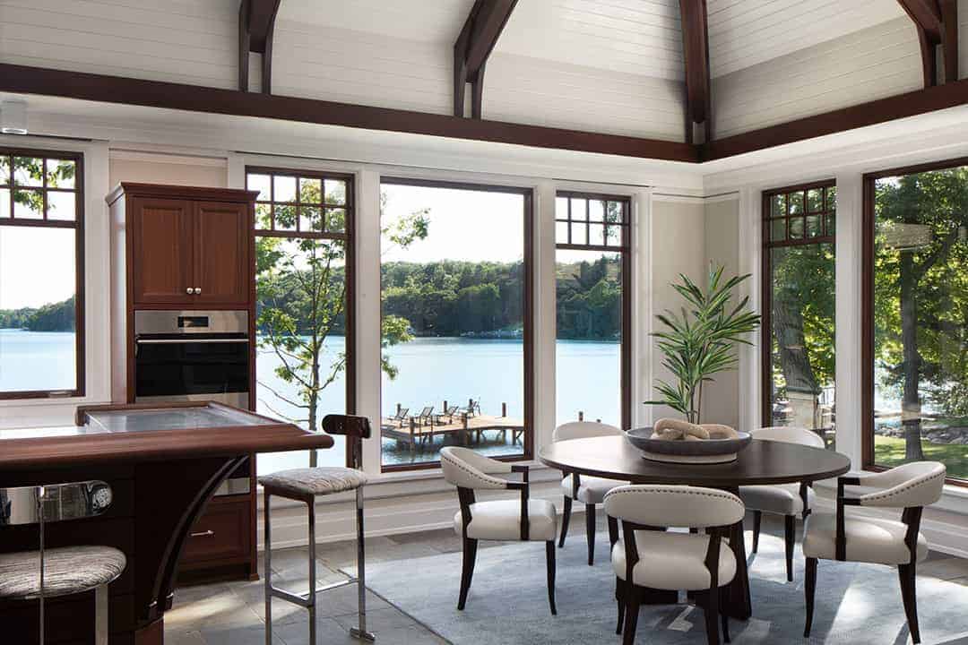 A sophisticated design scheme of mahogany and chrome spotlights the abundance of amenities for the ultimate lake living lifestyle. A color palette of blues and lighter woods provide a variation in warmth and texture. The theming holds nautical undertones in the wood beams, oar shaped balusters, high-gloss white millwork, gunmetal window sashes, tension cable, zinc countertops, and polished chrome to produce a refreshed swanky vibe. Materials and finishes were selected with durable elegance in mind that stand up to lake-splashed children and pets, or smartly dressed business colleagues and guests.