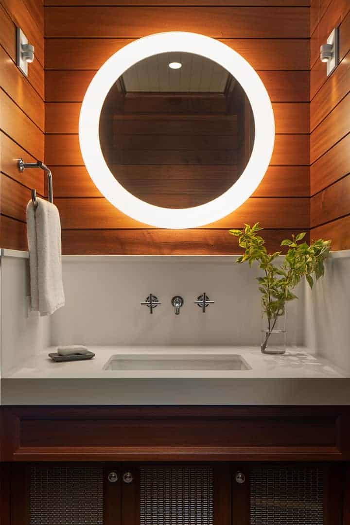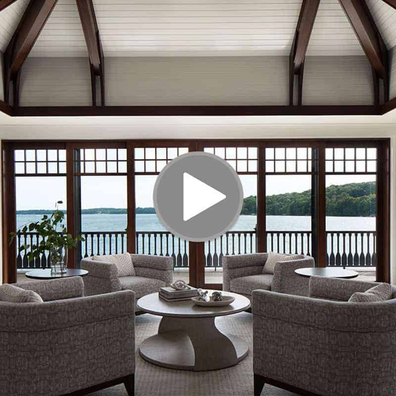 The Lake Beverage area includes a cozy corner for gaming and socializing. A full-service hospitality bar, complete with beer tap, has the functionality for easy entertaining and dining. The open connection of the floorplan creates an easy flow. The Lounge offers a swanky duet before the gas fireplace that is layered with a black granite surround. The Lake Room provides additional seating options, and a pop-up TV is concealed inside a custom console. The Lake Deck is cantilevered, an essential design element that reaches out over the water. Views are maximized as multi-slide doors open and extend the room outside. Centrally located, a nautical Powder Room is concealed in the accent wall’s horizontal wood panel. The wood panel continues within, and the circular mirror and lantern sconces relate to a ship’s porthole.