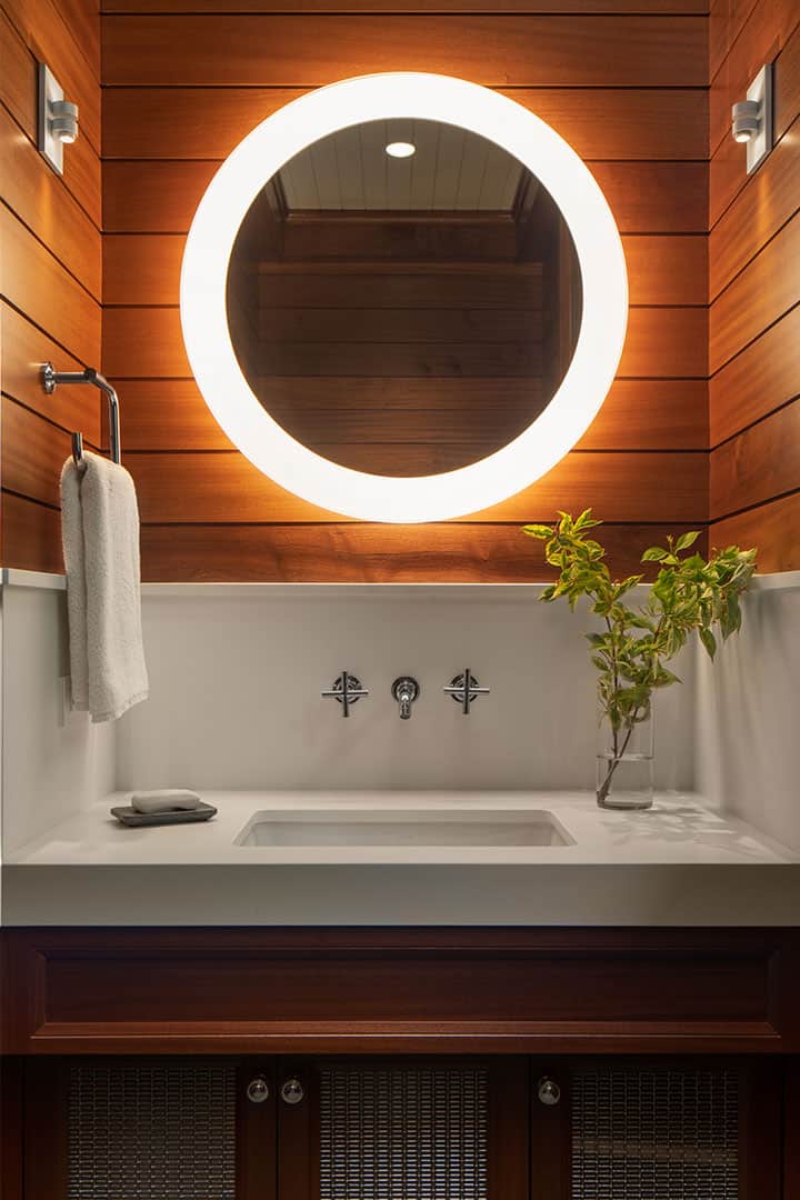 The Lake Beverage area includes a cozy corner for gaming and socializing. A full-service hospitality bar, complete with beer tap, has the functionality for easy entertaining and dining. The open connection of the floorplan creates an easy flow. The Lounge offers a swanky duet before the gas fireplace that is layered with a black granite surround. The Lake Room provides additional seating options, and a pop-up TV is concealed inside a custom console. The Lake Deck is cantilevered, an essential design element that reaches out over the water. Views are maximized as multi-slide doors open and extend the room outside. Centrally located, a nautical Powder Room is concealed in the accent wall’s horizontal wood panel. The wood panel continues within, and the circular mirror and lantern sconces relate to a ship’s porthole.