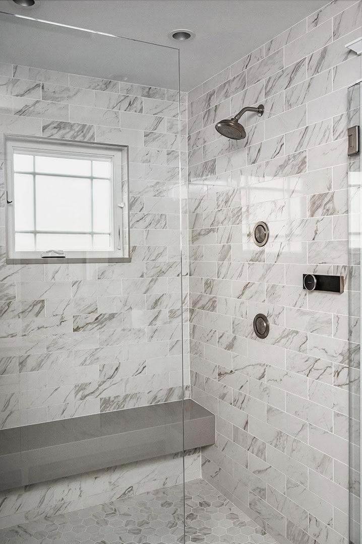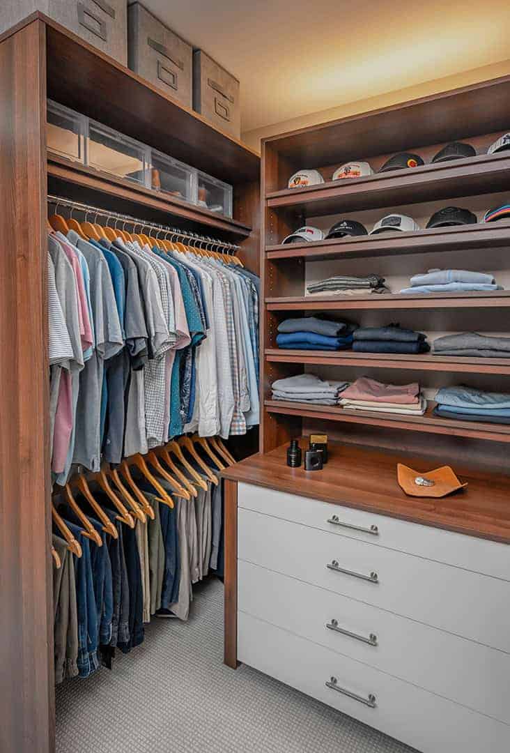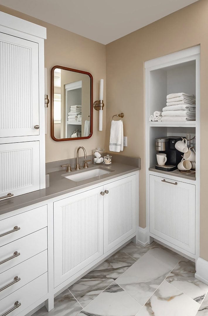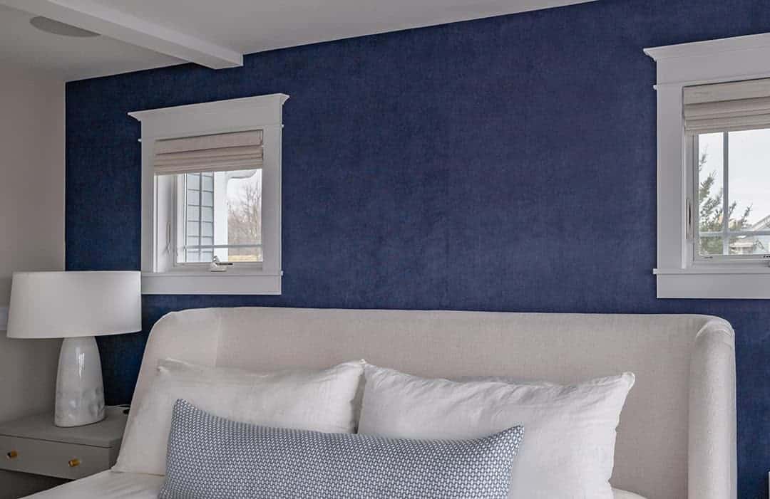 The main suite received a complete reimagining, including the bedroom, closet, and bathroom. In the bedroom, the goal was to lighten the space and introduce visual interest. A vaulted ceiling was desired, but not feasible due to existing structure constraints. Instead, a bulky soffit was removed in favor of architectural ceiling beams accented by subtle lighting bringing character and a sense of elevation. An accent wall was introduced behind the bed, featuring a navy corduroy wallcovering for a touch of texture and depth. The suite’s closet transformation addressed inefficiencies in the previous layout. What had been two separate closets flanking a narrow hall to the bath were combined into one unified, accessible space. Pocket doors now connect the bedroom to the closet and the closet to the bath, improving circulation and allowing for a streamlined daily routine.