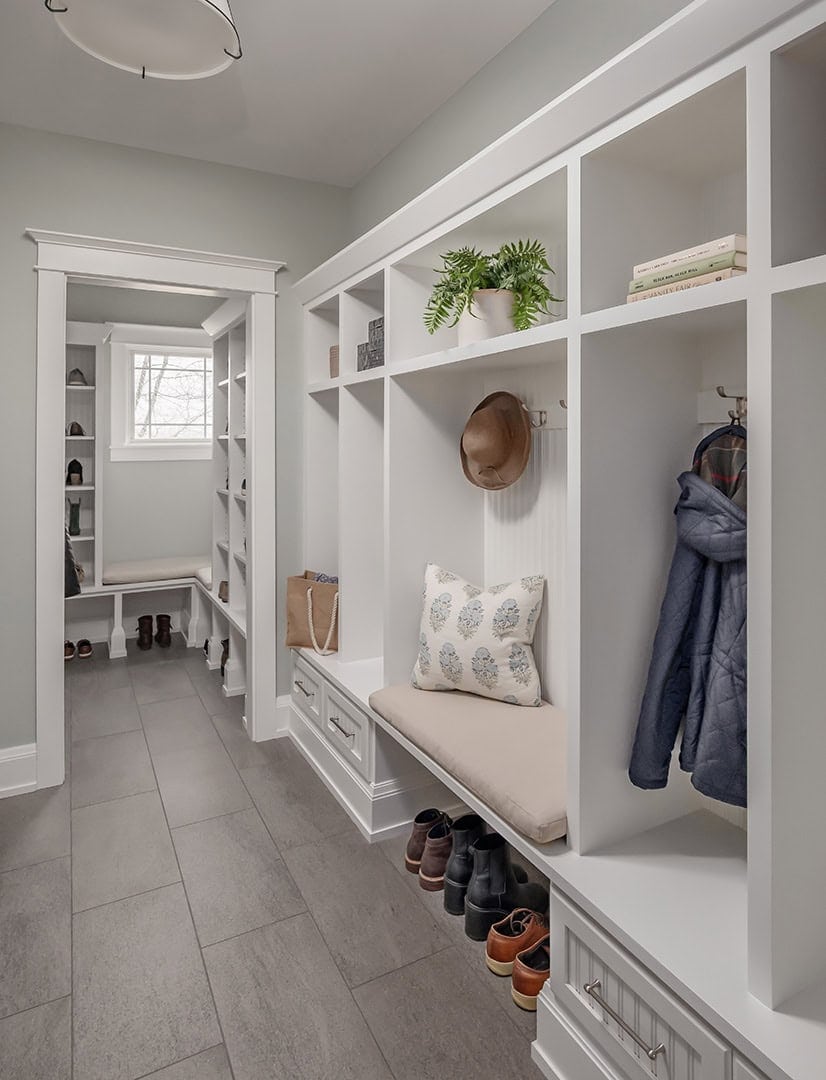 The family Room was brightened with a new paint palette for the walls and millwork, refinished wood floors, and updated lighting. Custom furnishings created new seating arrangements and new window treatments contributed to the space’s revitalized feel. The newly painted mantle better highlights the fireplace, and new wall sconces balance layered lighting for a gathering space that is more welcoming and connected to the home’s overall style. What was once a boldly colored space with only wall hooks and cramped shoe storage is now a functional Mudroom that offers an organized space for every member of the family. A custom built-in locker system and redesigned shoe room with seating create a place for everything so that each day begins with efficiency and ease.