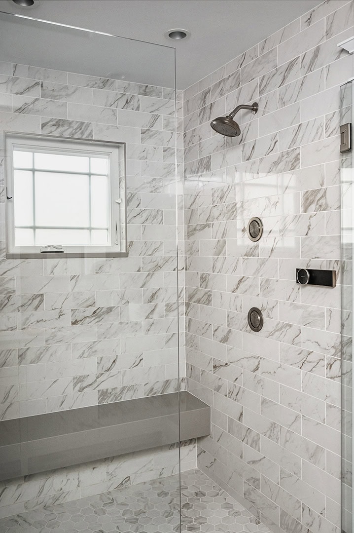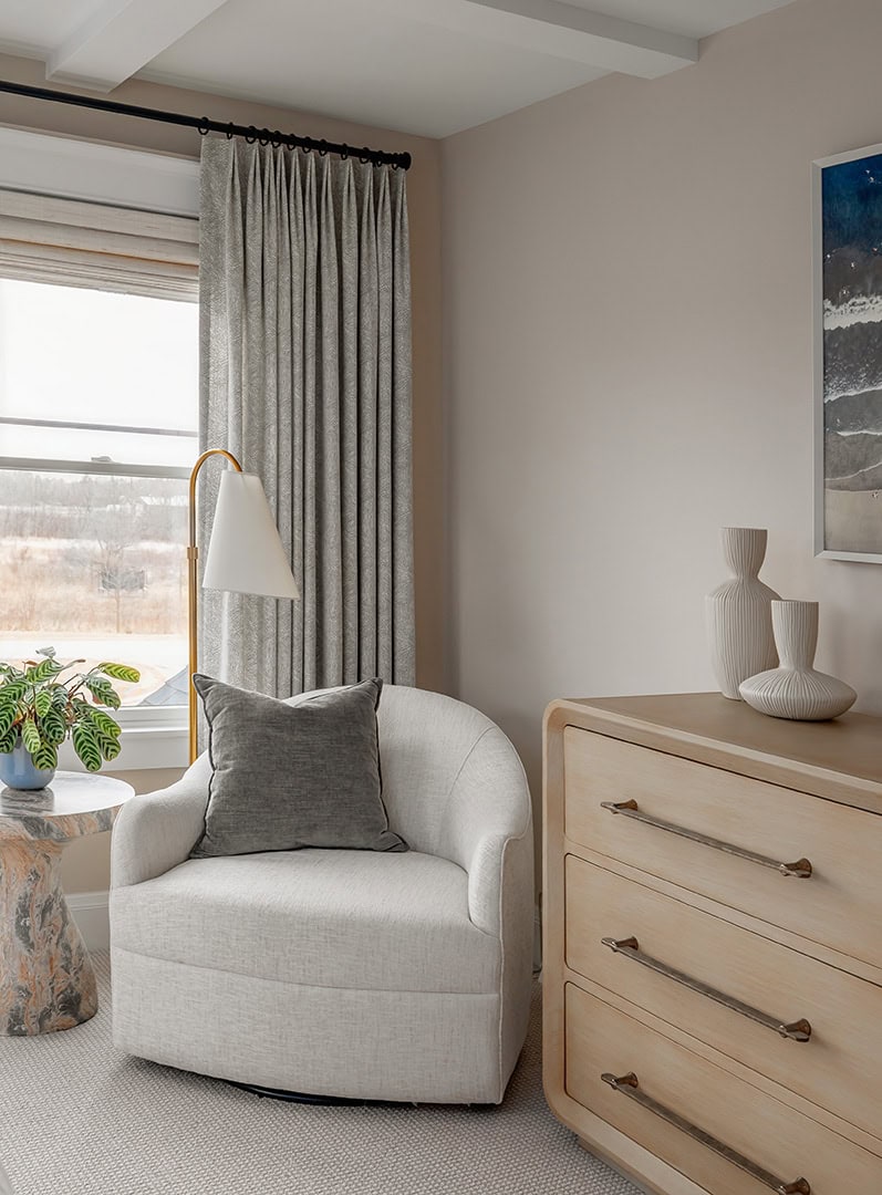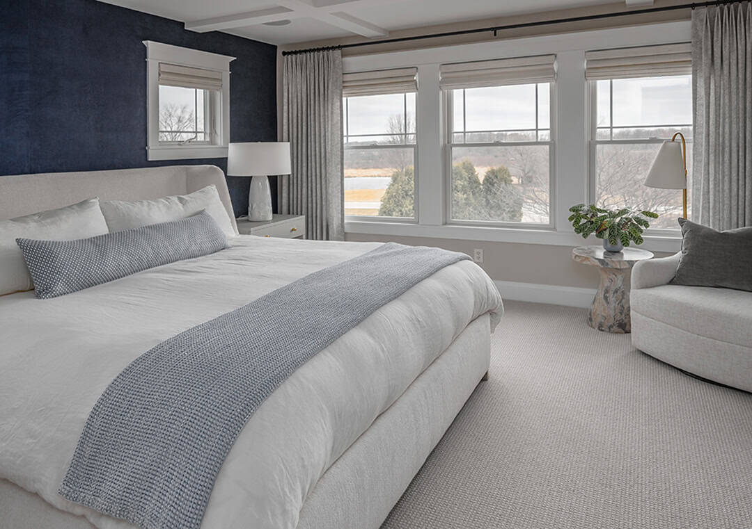 The main suite received a complete reimagining, including the bedroom, closet, and bathroom. In the bedroom, the goal was to lighten the space and introduce visual interest. A vaulted ceiling was desired, but not feasible due to existing structure constraints. Instead, a bulky soffit was removed in favor of architectural ceiling beams accented by subtle lighting bringing character and a sense of elevation. An accent wall was introduced behind the bed, featuring a navy corduroy wallcovering for a touch of texture and depth. The suite’s closet transformation addressed inefficiencies in the previous layout. What had been two separate closets flanking a narrow hall to the bath were combined into one unified, accessible space. Pocket doors now connect the bedroom to the closet and the closet to the bath, improving circulation and allowing for a streamlined daily routine.