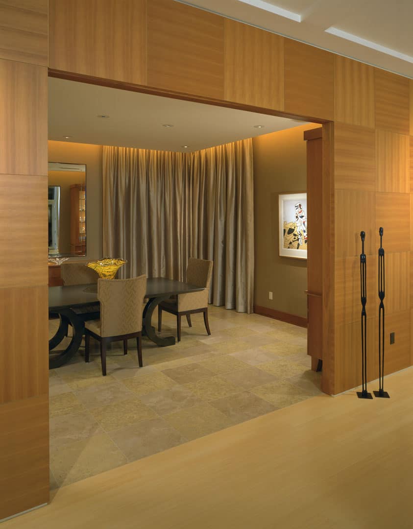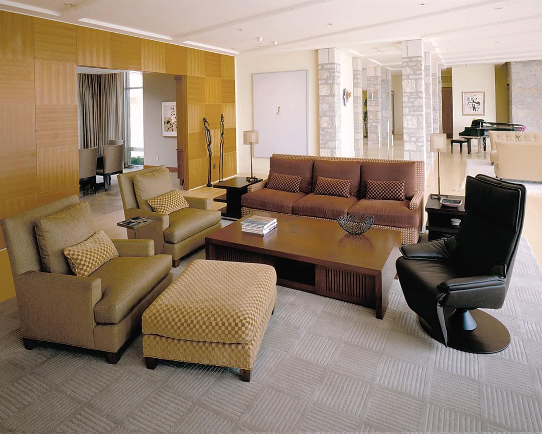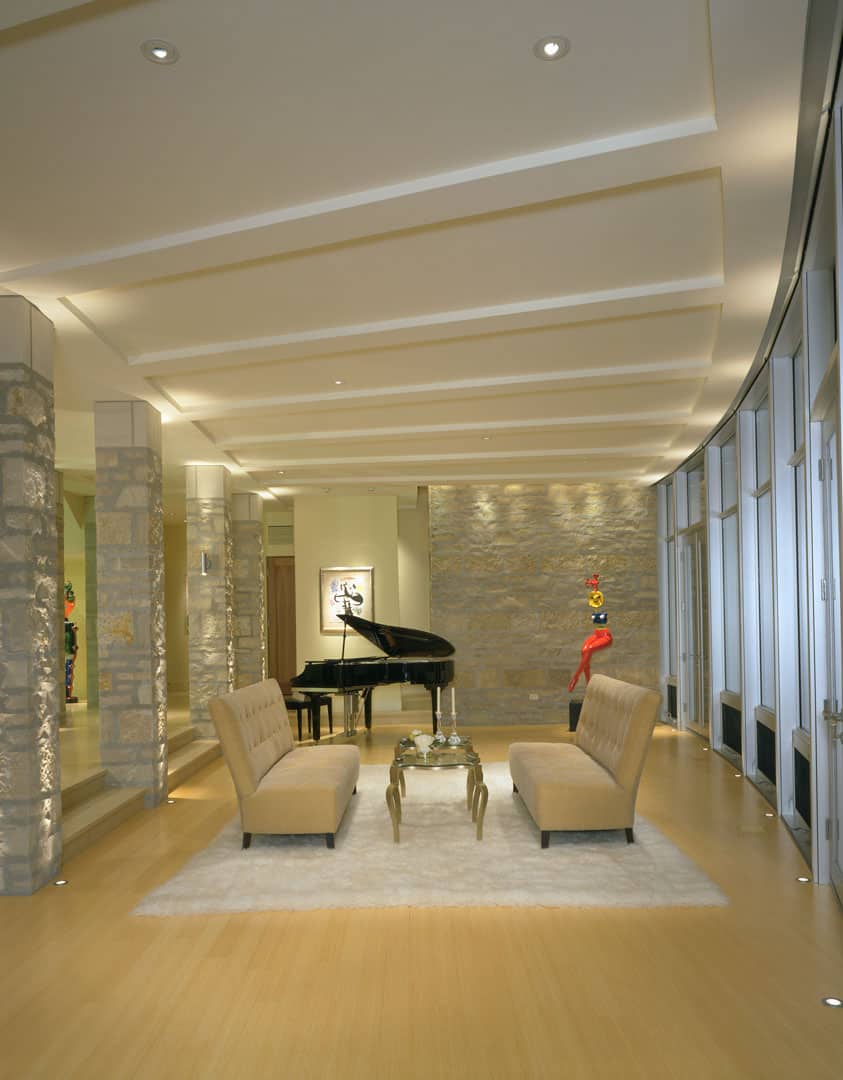 The street facade is strong and speaks of security while the lake elevation harmoniously gives way to the awesome view of the ever changing water. The curvilinear curtain wall of floor to ceiling glass provides a constant rhythm that stands in partnership with the lake. The curtain wall looks like the lake sounds.