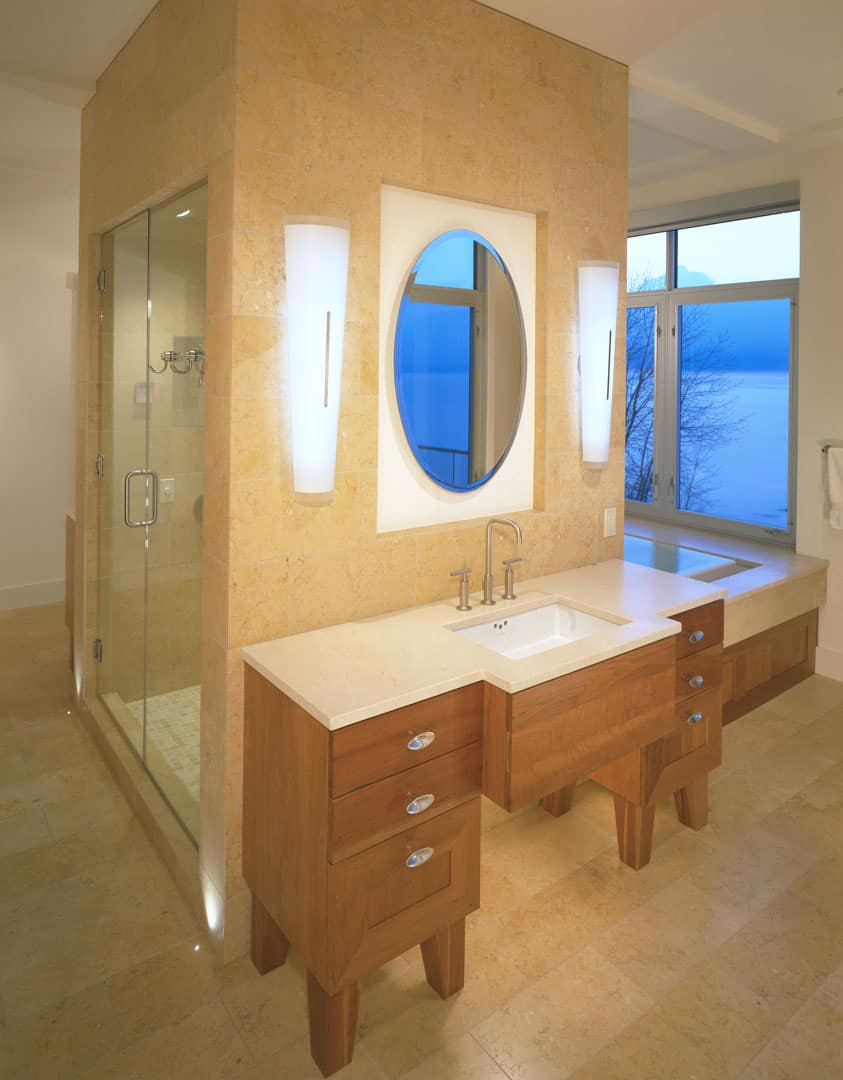 Architecturally integrated and special effect lighting enhances the purity of the natural materials that are in slight tension with the clean architectural forms. Dramatic light defines the design and provides luminous living. The main activity rooms of Kitchen, Dining, Family, and Living flow with the water front culminating with the Guest and Master Suites. The Master Suite opens to the unencumbered Roof Terrace with breathtaking views. The attached bath is the “in home spa” that caused the owner to exclaim, “We are so glad we never have to worry about check out time!”