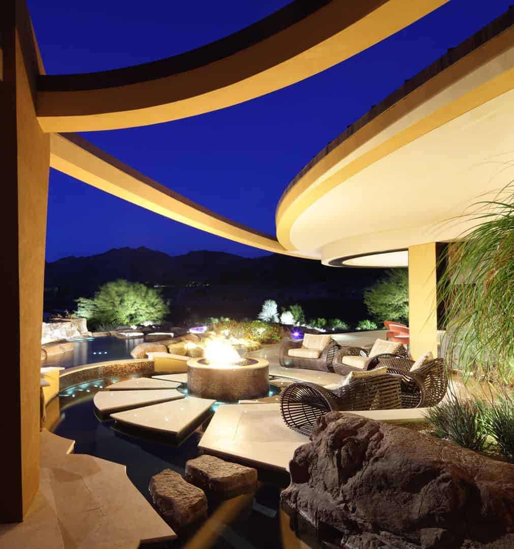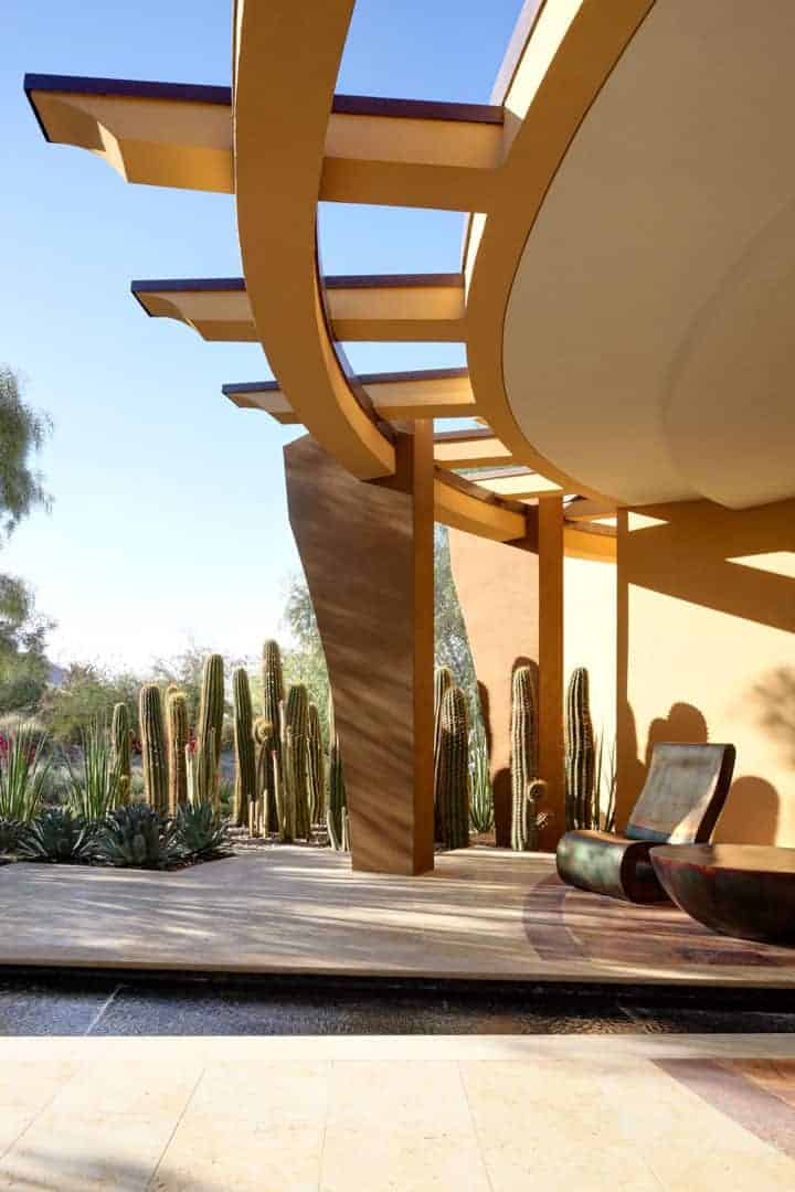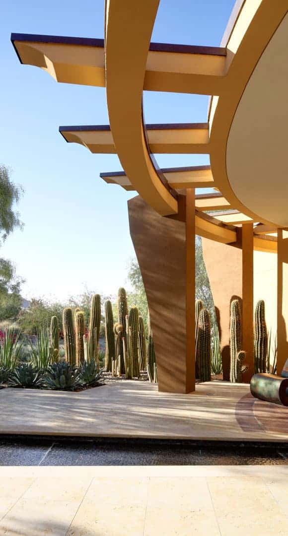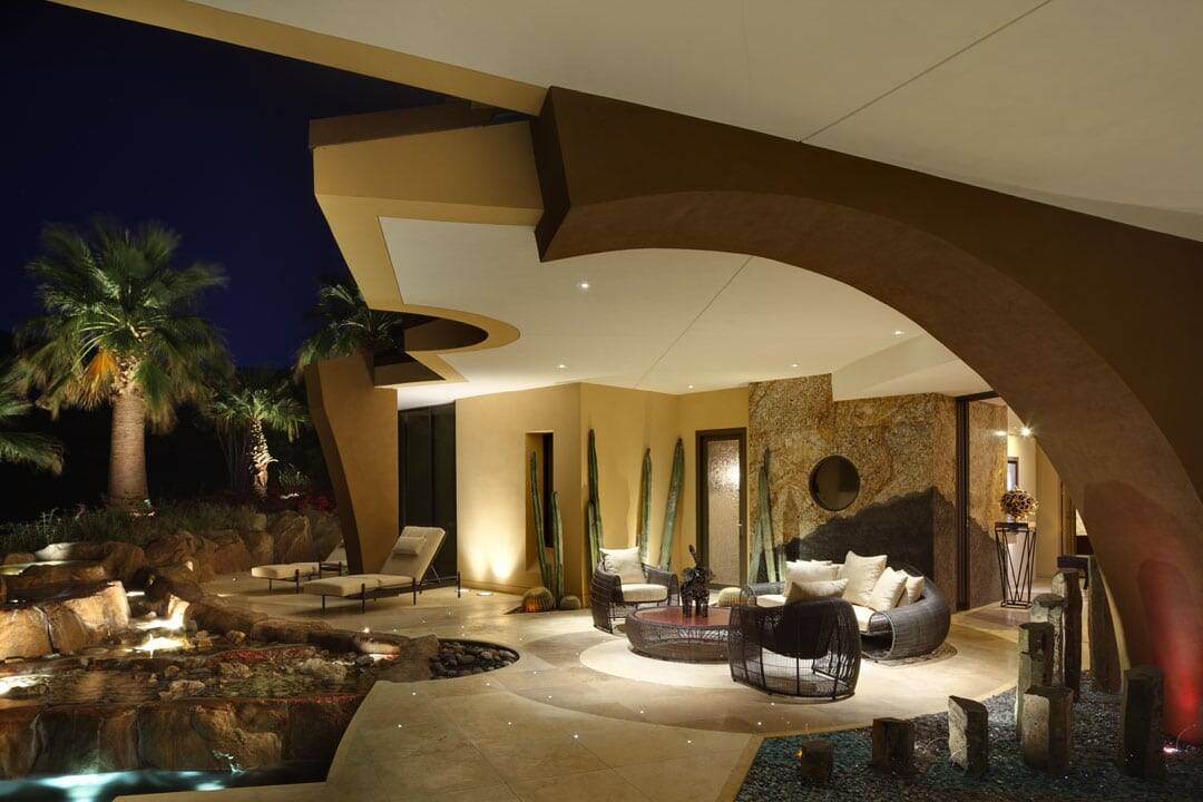 Sculpted forms control light and shadow. The integration of multiple water features defines this personal oasis. The natural earth-tone materials of the architectural forms emulate the desert stone while the bright fabric and art work recall the desert blooms.