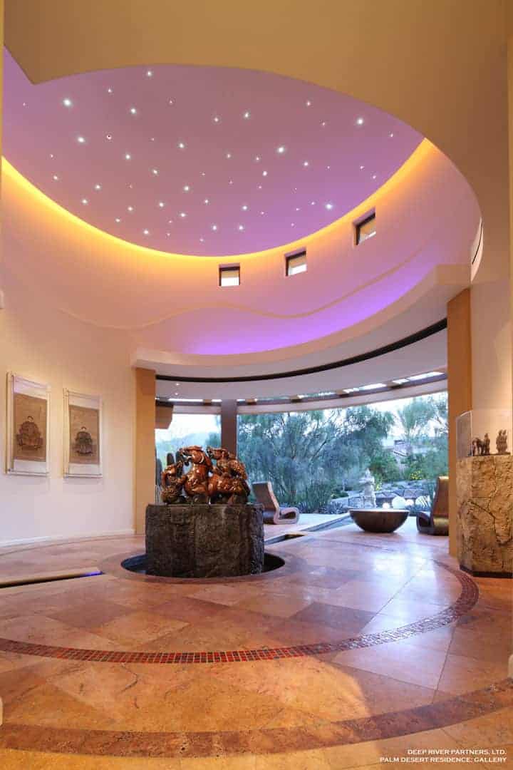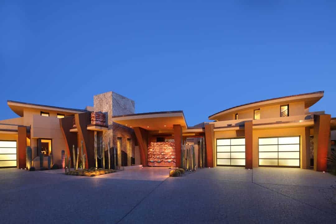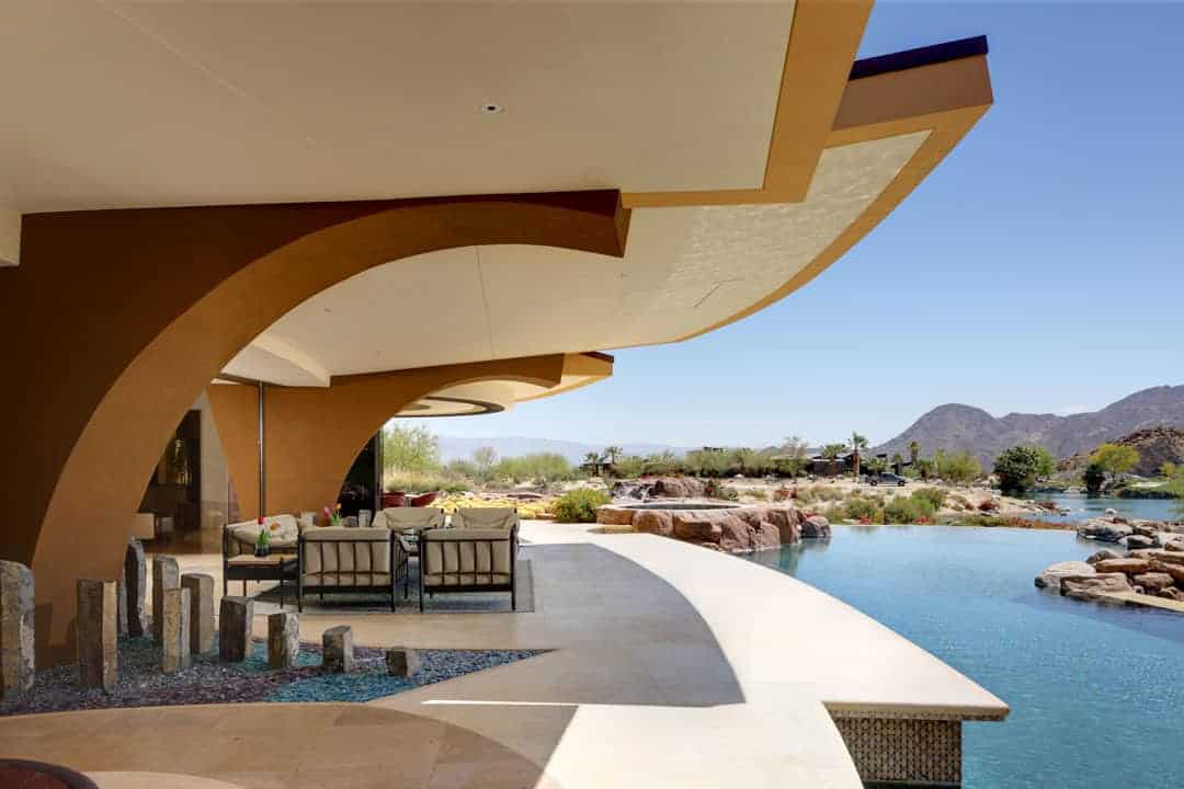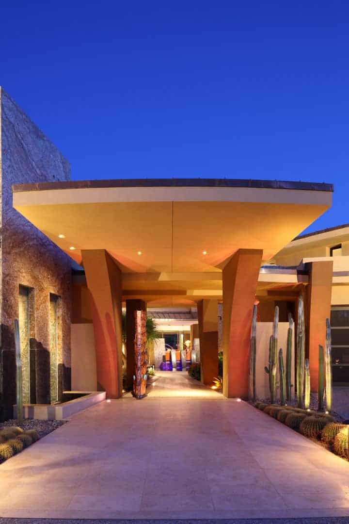 Sculpted forms control light and shadow. The integration of multiple water features defines this personal oasis. The natural earth-tone materials of the architectural forms emulate the desert stone while the bright fabric and art work recall the desert blooms.