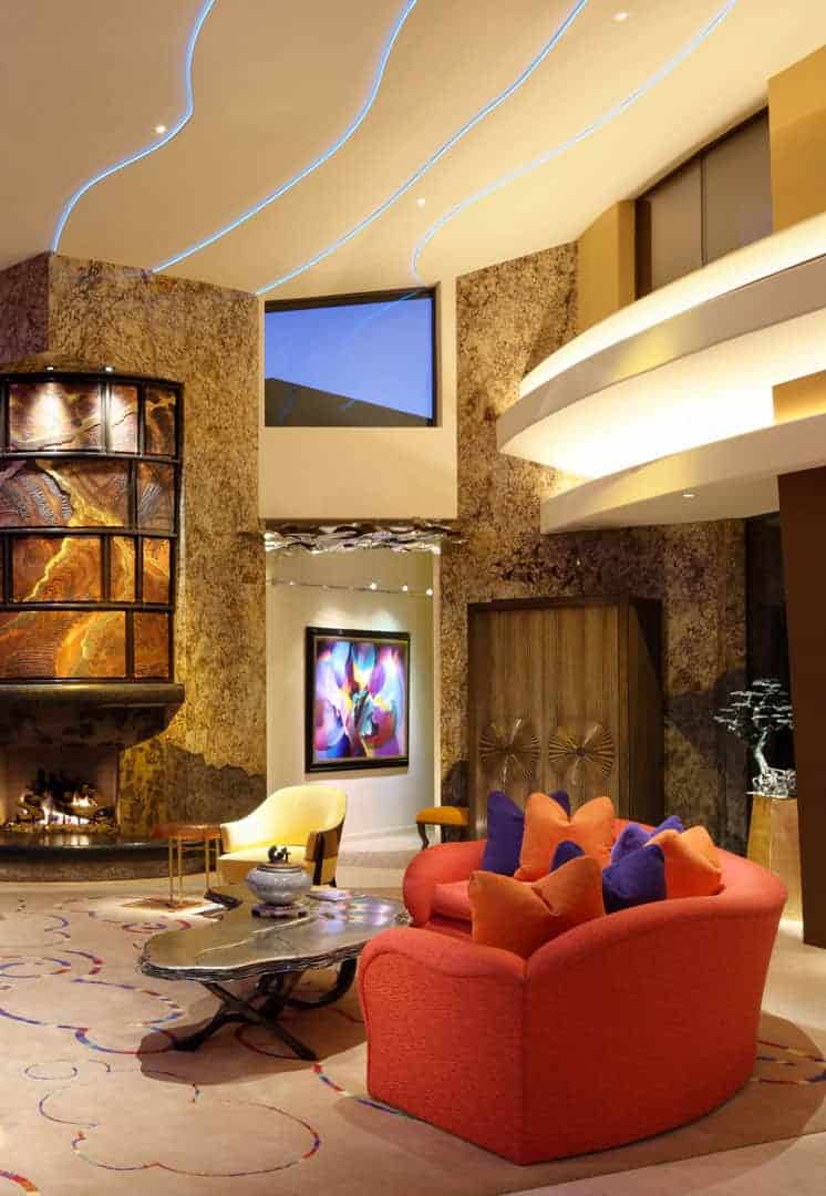 The design embodies the owner’s love of nature, art, and architecture as living sculpture. The results are flowing spaces and curvilinear forms that evoke feelings of calm and serenity.The boundaries between inside and outside are diminished with disappearing glass walls that reveal the stunning mountain views.