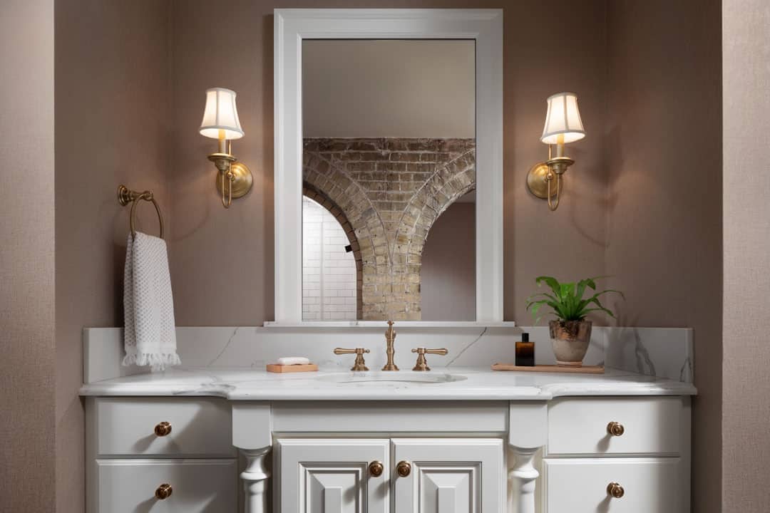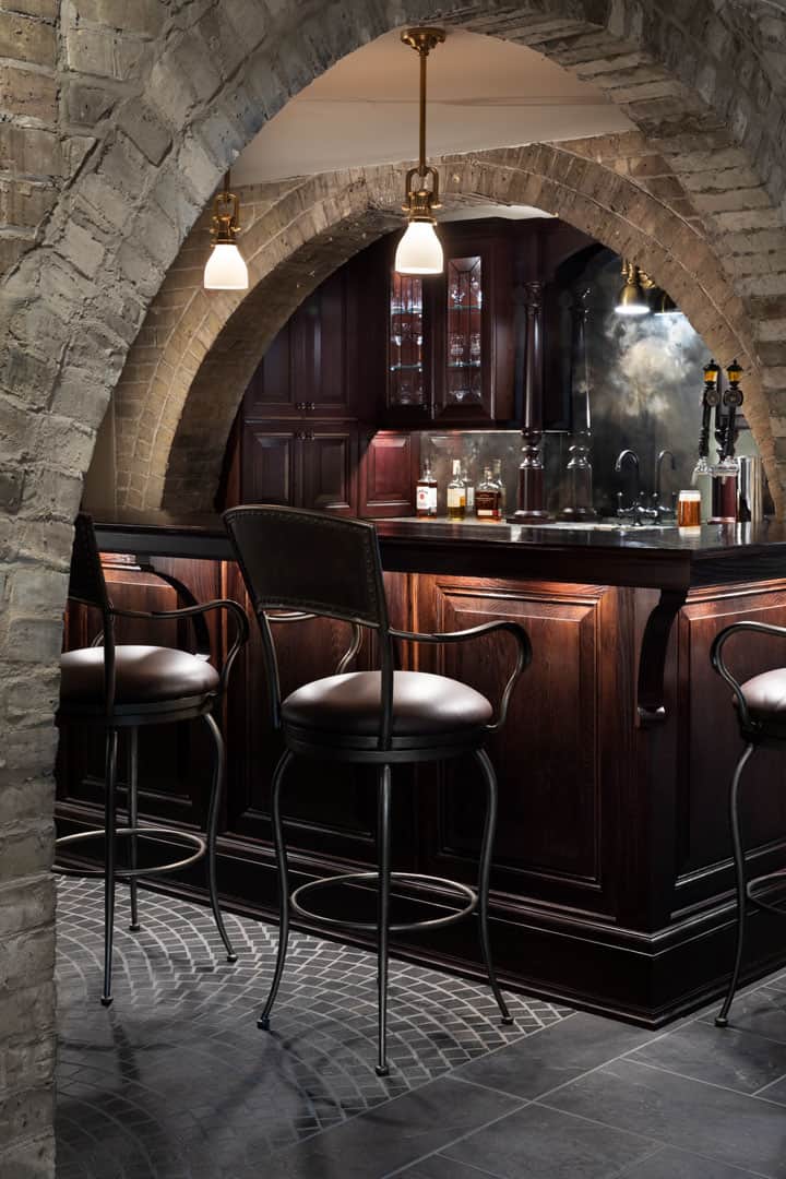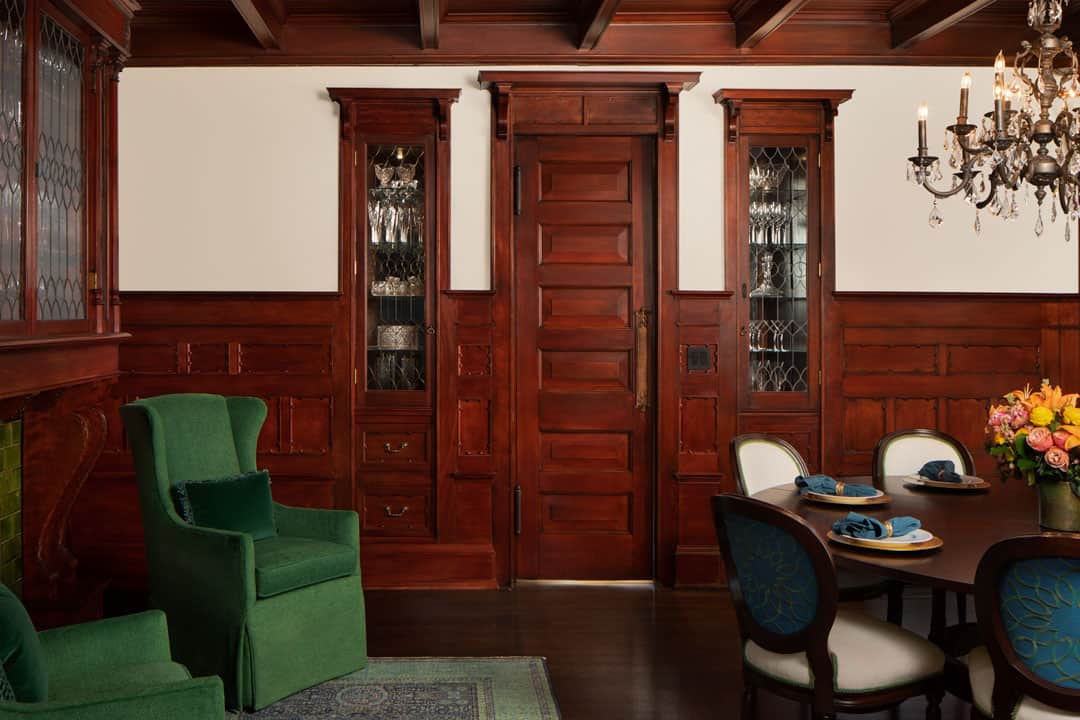 Original woodwork, leaded glass, and finishes were design inspirations for a solution that complements these details with a cleaner transitional style. The design seamlessly blends the remodeled areas into the existing context and creates a cohesive and compelling whole. The main bedroom suite layout allows for a gracious sleeping environment including seating space to celebrate the renovated fireplace. In the bath, space is maximized with mirrors doubling as medicine cabinets, and wood pilasters that pullout for storage at the dual vanity areas. Updated plumbing fixtures give the bath a modern appeal. The kitchen was original to the house, so quite dated and not functional for a modern working kitchen. The floorplan of that era was compartmentalized into a kitchen, pantry, and butler’s pantry. These areas were combined to deliver a modern semi-professional kitchen and casual dining space with better flow to the entertainment areas of the home. The garage was improved, and a new rear hall created a modern mudroom. A new outdoor roof terrace was created atop the garage to function as a private backyard space that features a custom metal work stairway, green roof, grilling zone, plus dining and seating areas. In its original form the unfinished basement was a diamond in the rough. In line with Milwaukee’s beer baron heritage, the homeowners are also beer enthusiast with ties to the modern microbrew industry. The space was transformed with a home pub, entertainment area, exercise space and a full bath. The design was inspired by the Cream City brick arches, a mark of Milwaukee, that were preserved as a design feature. With a blending of old and new, the resulting design presents a compelling whole to support the owners’ lifestyle. The fresh style respects the home’s historic elements with a transitional aesthetic.