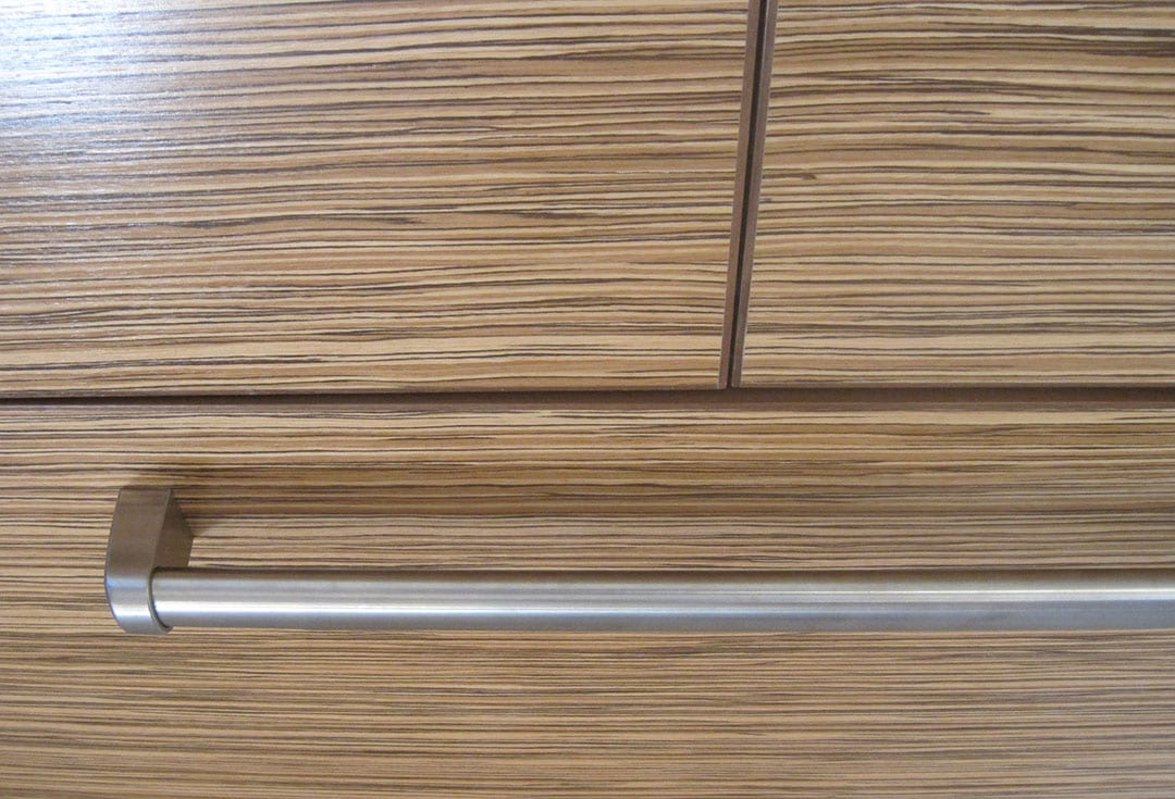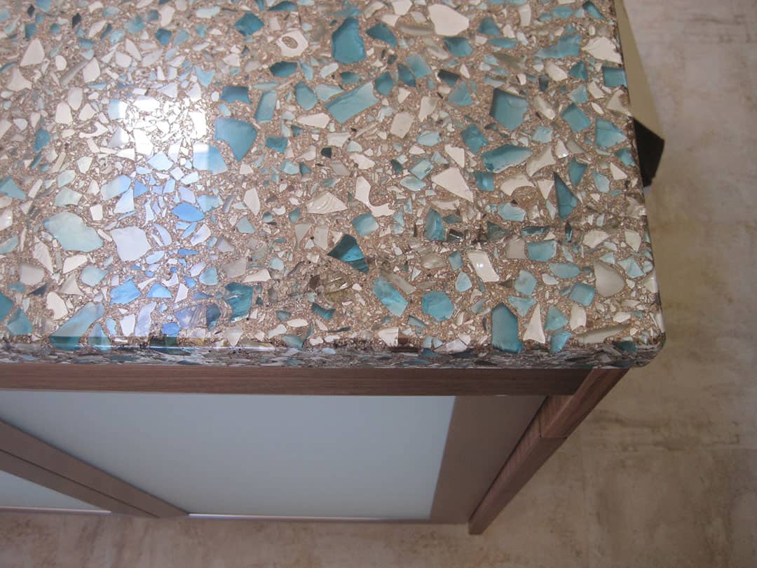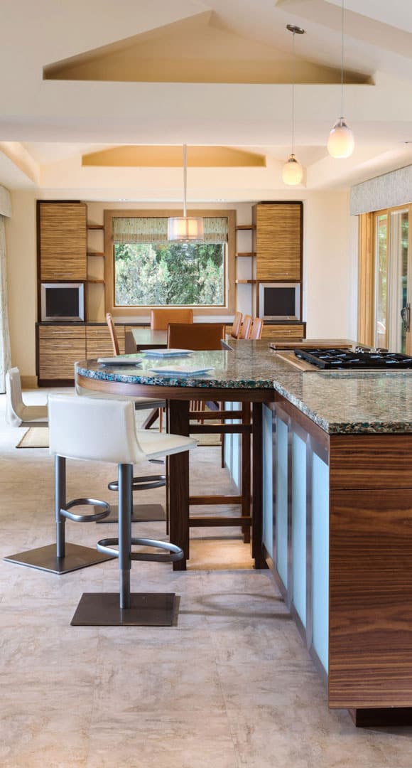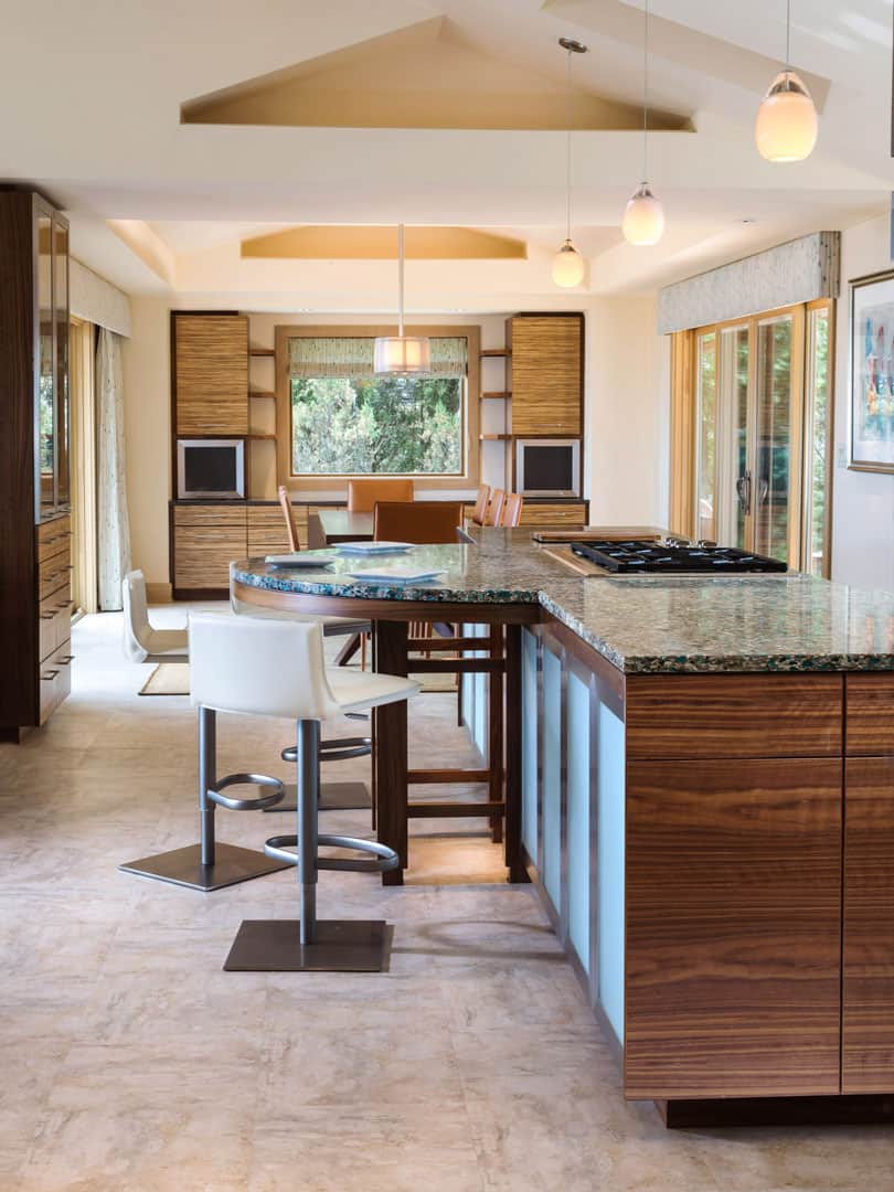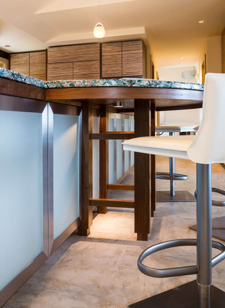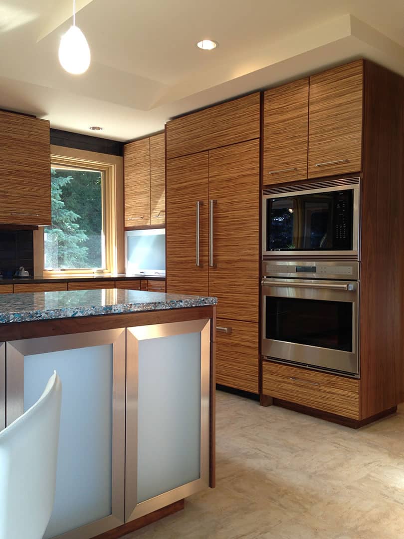 This kitchen remodeling expanded into an adjacent dining room to increase its size, connect it to the existing living room, and feature the lake view in this new open plan. A new addition adjacent to the kitchen expansion provides a new dining area. Sliding glass doors on both sides of the room allow for an open for feel. A covered grilling area on one side opens to the woodland view while the other side accesses the deck with the beach and lake view beyond. The central island features reclaimed glass aggregate reminiscent of beach walk treasures. The clean aesthetic, achieved using metal and glass cabinet doors, metal backsplash tile, and a flush door style is tempered and warmed by zebra veneer and walnut cabinet fronts. Aging in place techniques were employed to ensure ease of use extending the design relevance. Ergonomic product selections, such as wide cabinet pulls that allow easy gripping and wall ovens that reduce bending, make the Kitchen easy to use. Contrasting colors visually define surfaces, and the commercial grade vinyl floor adds foot and joint comfort.