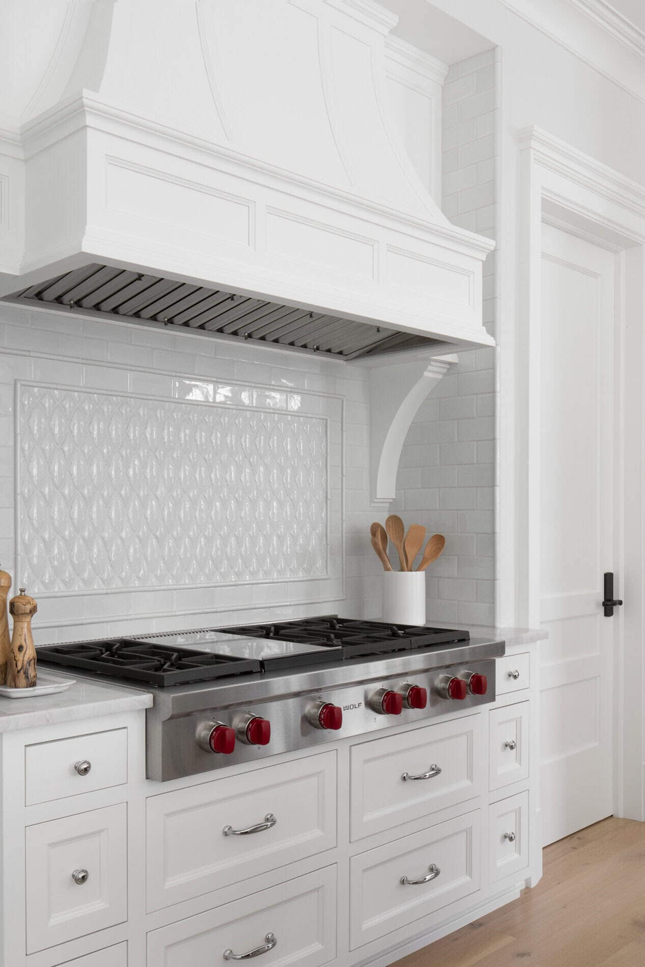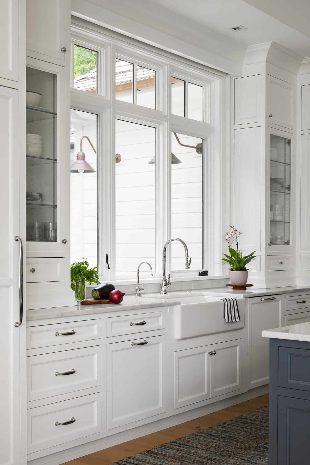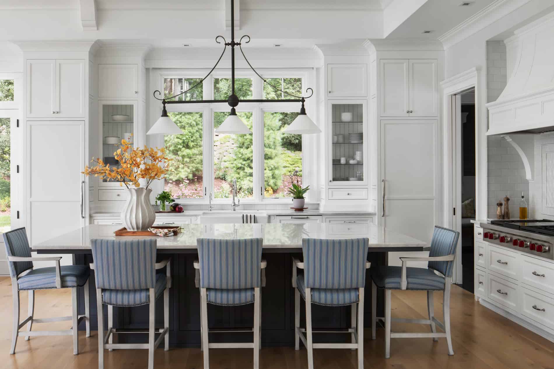 Vaulted ceilings are highlighted by the beautiful rhythm of the beams, giving the Kitchen a bright and spacious feeling. High end appliances, a farmhouse sink, wall ovens, and a walk-in pantry are arranged for efficient cooking and cleanup. A custom hood and tile backsplash bring beautiful traditional detail and character. The island takes center stage with an uninterrupted solid quartzite countertop, giving the island a clean, table-like feel that is perfect for casual meals and conversation.
