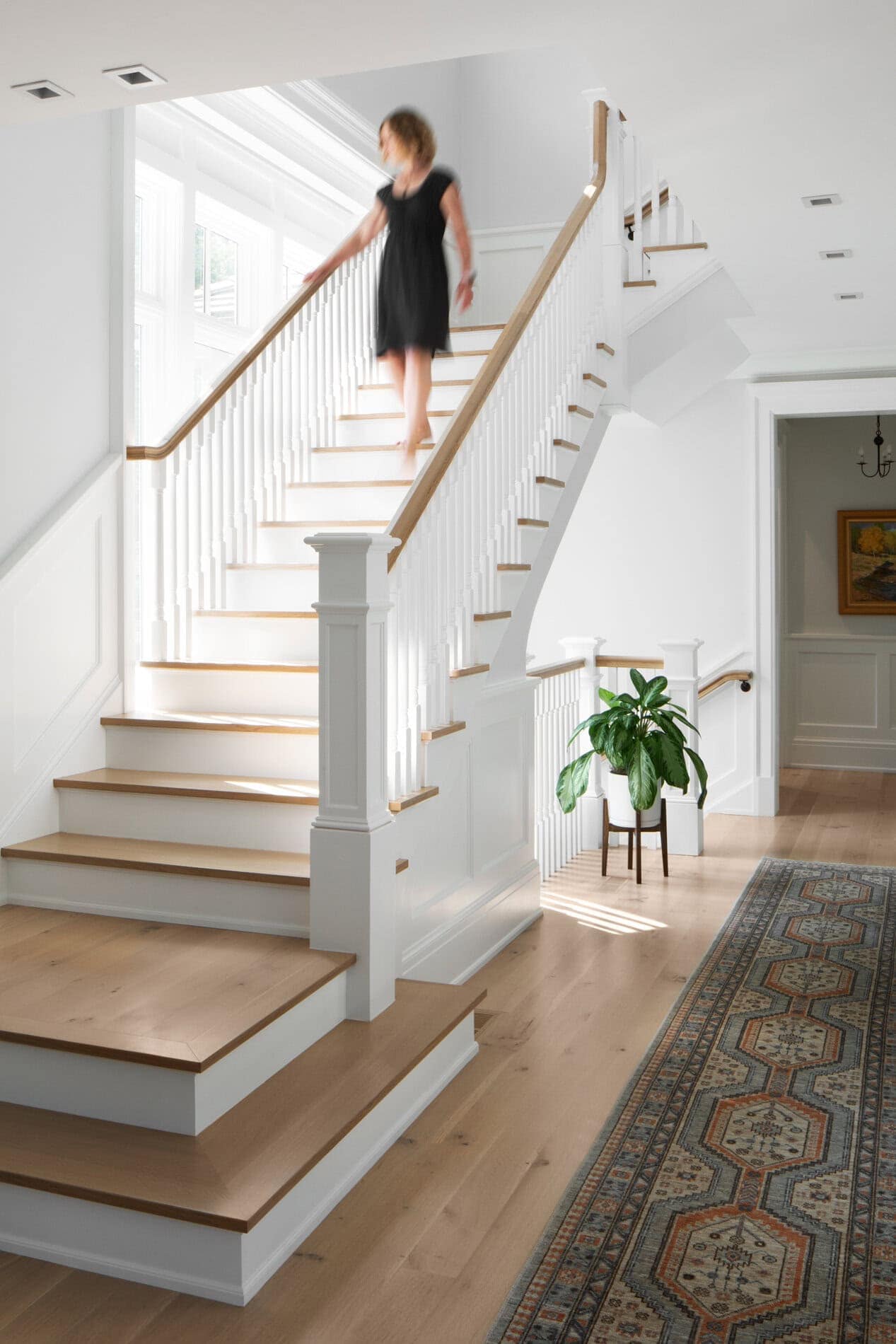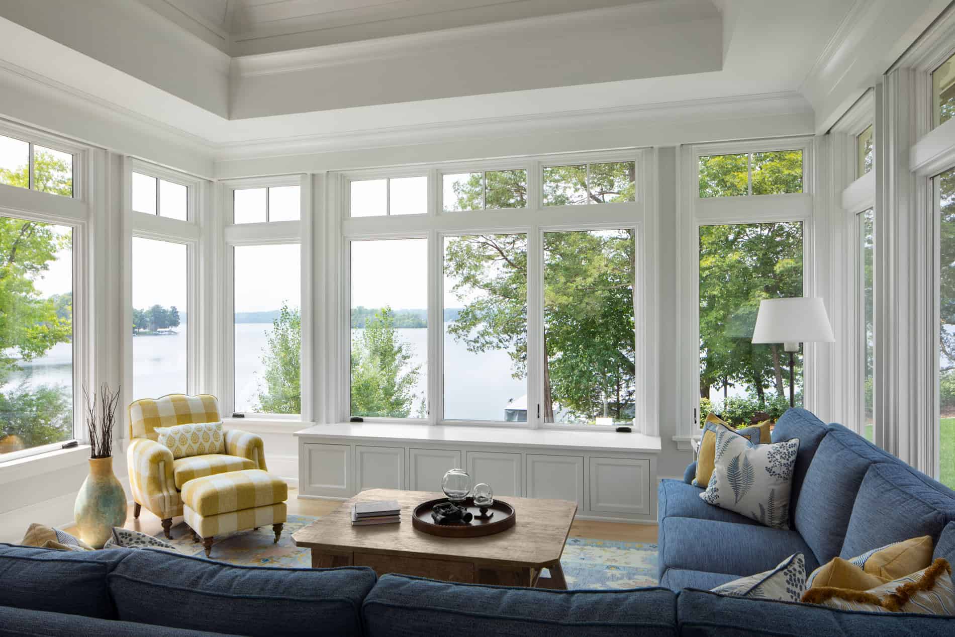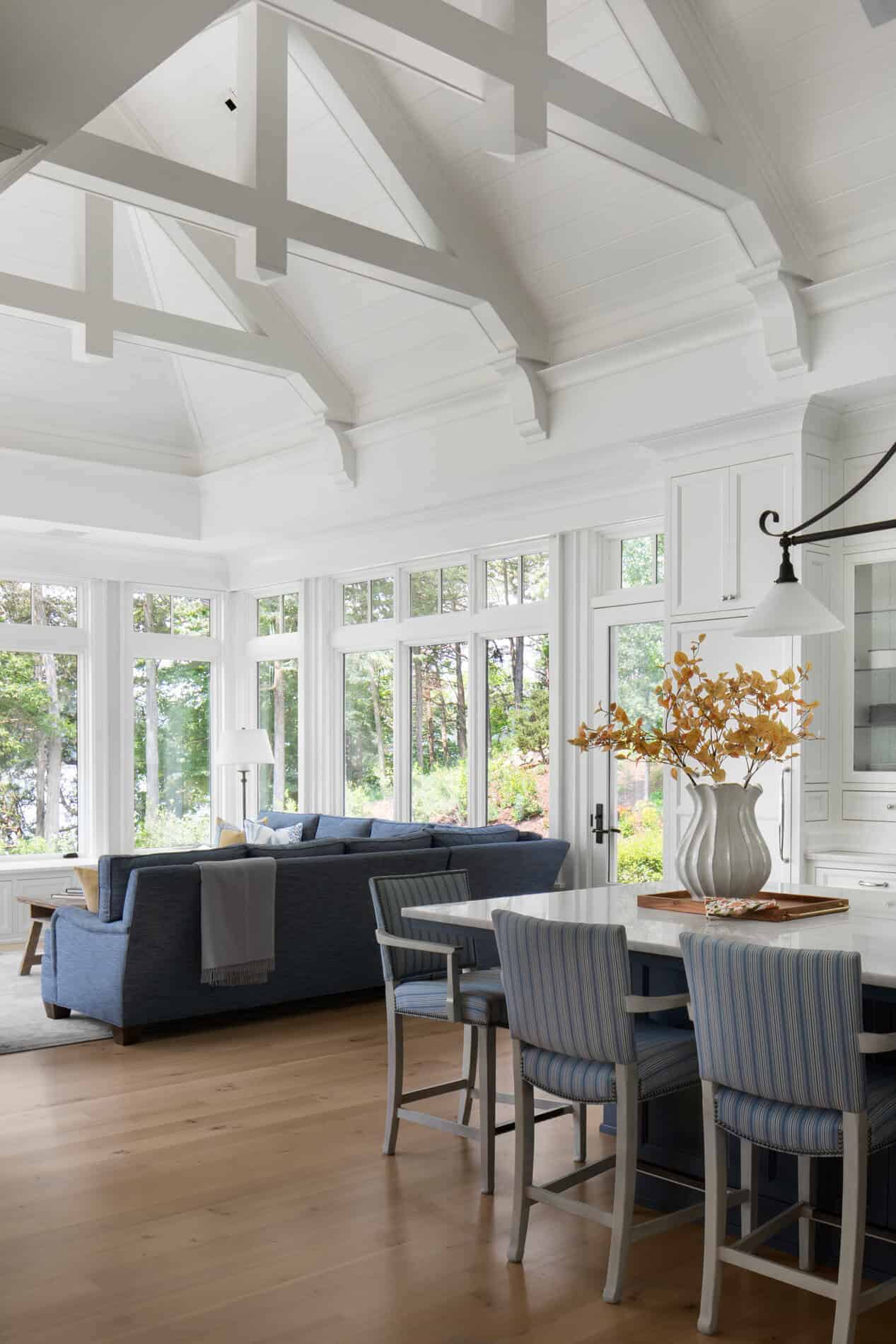 Stepping into the Foyer, the design themes set the tone for elegance with traditional millwork, crisp white paneling, and expansive windows that flood the space with natural light. Natural white oak floors, a stacked staircase design, and an elevator provide easy circulation across three levels, completing a timeless design built for generations. Airy, open, and connected to the lake, the Great Room captures the spirit of coastal living with bright white tongue and groove ceiling panel framed by beams to set the design theme throughout. Each space is defined, yet the floorplan’s open sightlines create a seamless sense of connection and maximize the lake views from every angle. A unique three-sided Sunroom creates panoramic views to soak up the lake from sunrise to sunset. A pop-up TV hidden in the window bench and concealed automated shades transform the space from a relaxed lounge to a comfy viewing room.
