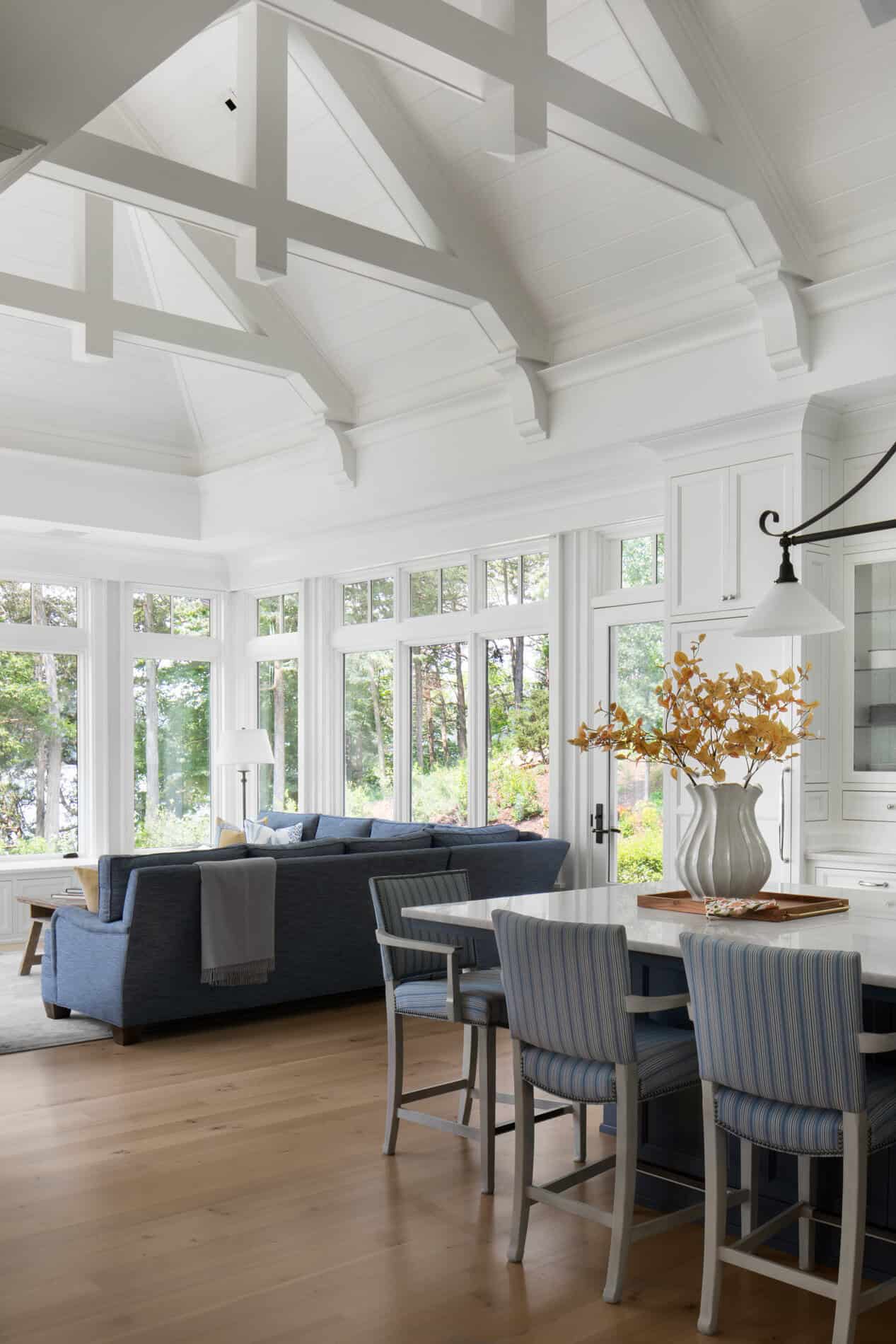 Stepping into the Foyer, the design themes set the tone for elegance with traditional millwork, crisp white paneling, and expansive windows that flood the space with natural light. Natural white oak floors, a stacked staircase design, and an elevator provide easy circulation across three levels, completing a timeless design built for generations. Airy, open, and connected to the lake, the Great Room captures the spirit of coastal living with bright white tongue and groove ceiling panel framed by beams to set the design theme throughout. Each space is defined, yet the floorplan’s open sightlines create a seamless sense of connection and maximize the lake views from every angle. A unique three-sided Sunroom creates panoramic views to soak up the lake from sunrise to sunset. A pop-up TV hidden in the window bench and concealed automated shades transform the space from a relaxed lounge to a comfy viewing room.