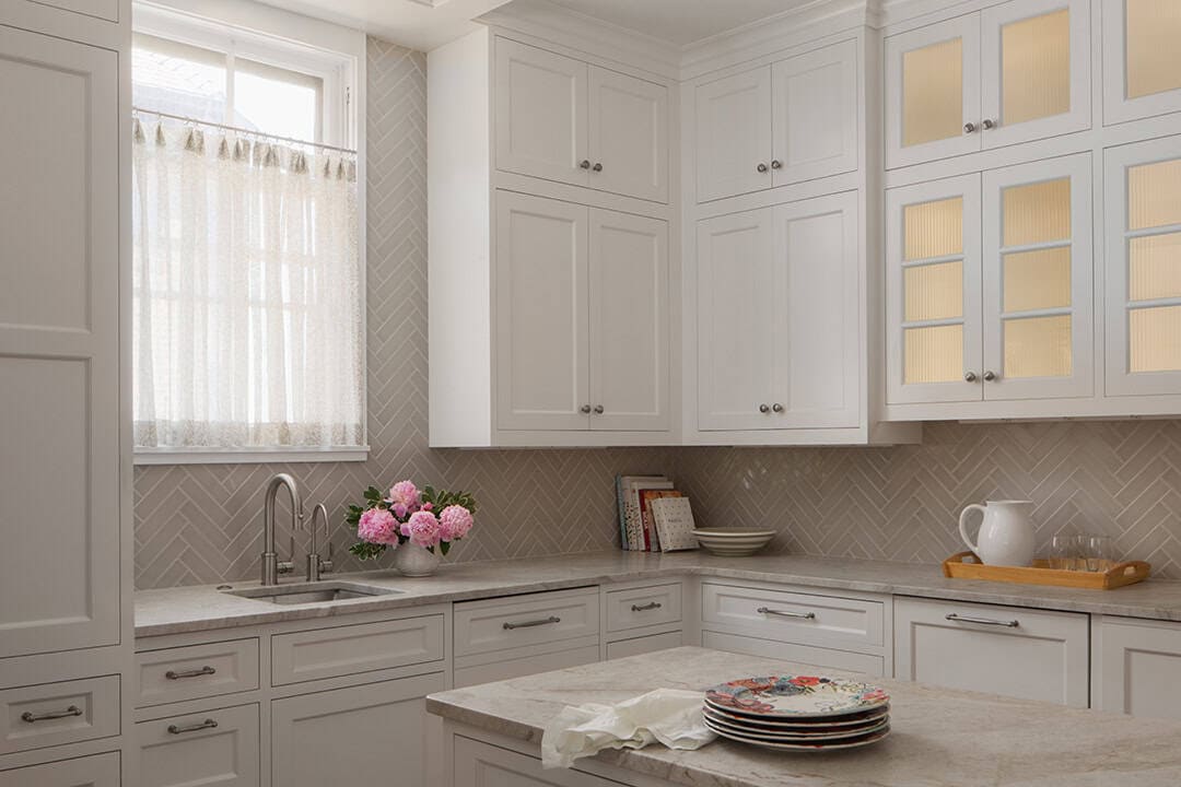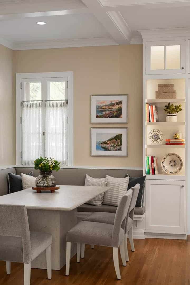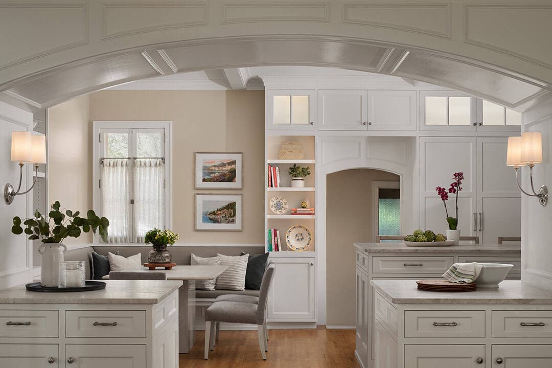 As a central focus of the project, the Kitchen remodel addresses both the challenging flow of the rooms and outlines a seamless connection to the existing interior character. The original Kitchen entrance from the back hall featured a central set of stairs that divided the room. The new design removes these stairs opening up the Breakfast Banquette, Kitchen, and Butler’s Pantry into one expansive, flowing space. To accommodate the homeowners’ love of entertaining, the Kitchen is now equipped with multiple seating areas and additional surfaces for food prep and service to support both casual gatherings and catered events. The wall separating the Kitchen and Dining Room was removed, revealing the stunning lake views, framed through the new paneled archway.