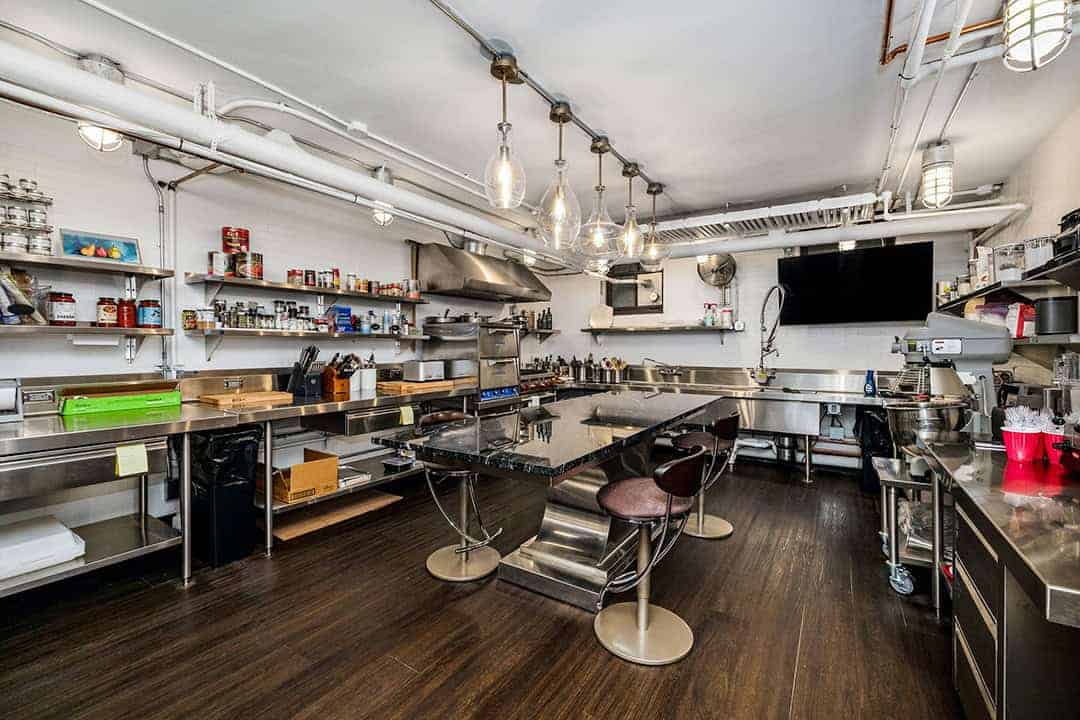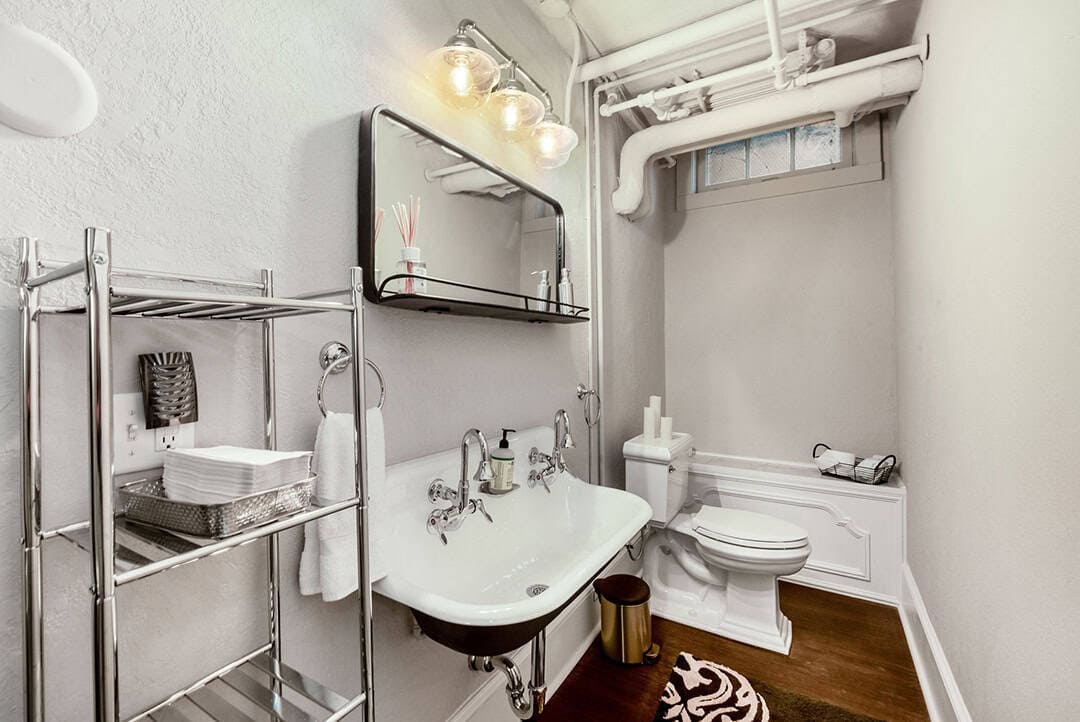 The lower level was transformed by repurposing unused storage into a Wine Room, featuring exposed Cream City Brick, a sleek and moody bar, and a traditional tin ceiling that nods to the home’s historic character. The addition of a professional catering Kitchen and bathroom complete this entertainment space.