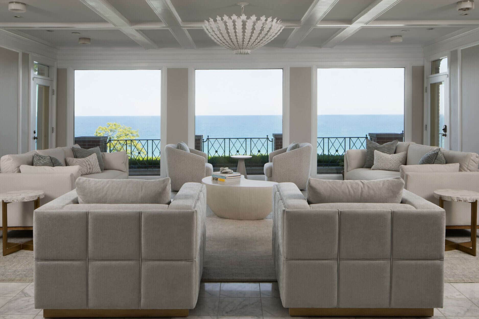 In the Living Room, new ceiling beams were designed to align with the existing columns and windows, creating a sense of rhythm and flow. The addition of alabaster light fixtures in each coffer and a plaster chandelier carries these materials through the design and further stylized the room.