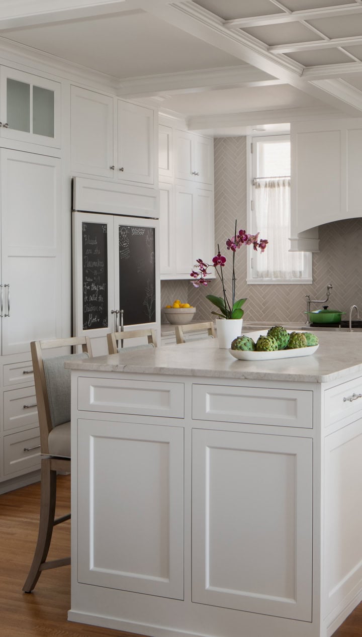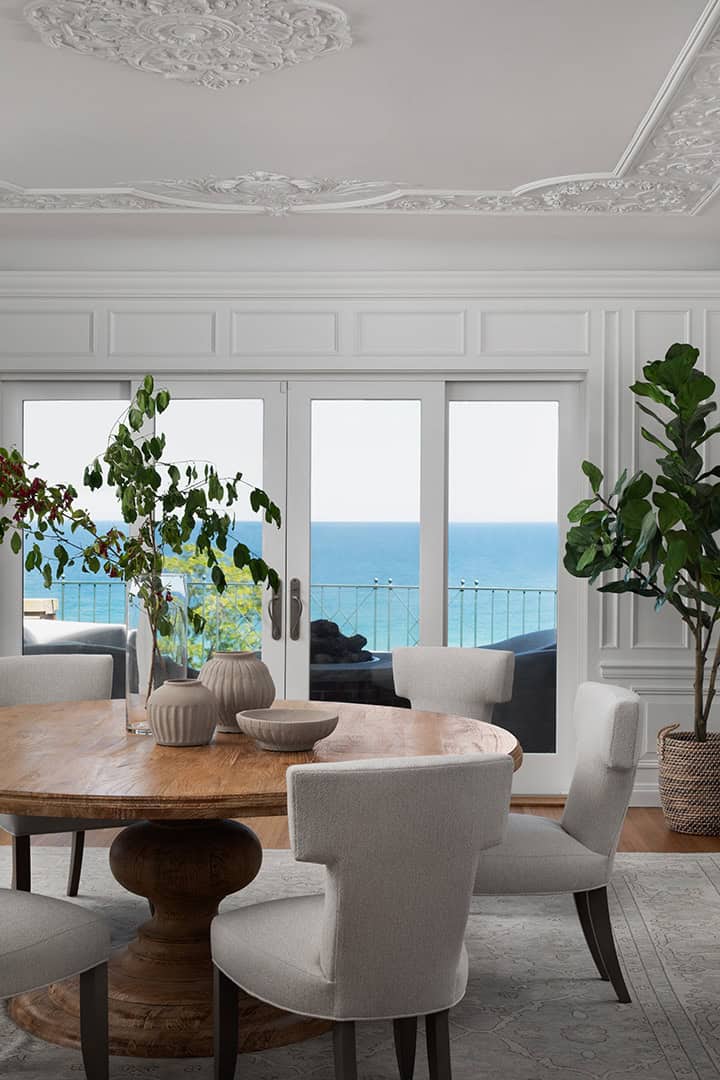 As a central focus of the project, the Kitchen remodel addresses both the challenging flow of the rooms and outlines a seamless connection to the existing interior character. The original Kitchen entrance from the back hall featured a central set of stairs that divided the room. The new design removes these stairs opening up the Breakfast Banquette, Kitchen, and Butler’s Pantry into one expansive, flowing space. To accommodate the homeowners’ love of entertaining, the Kitchen is now equipped with multiple seating areas and additional surfaces for food prep and service to support both casual gatherings and catered events. The wall separating the Kitchen and Dining Room was removed, revealing the stunning lake views, framed through the new paneled archway.