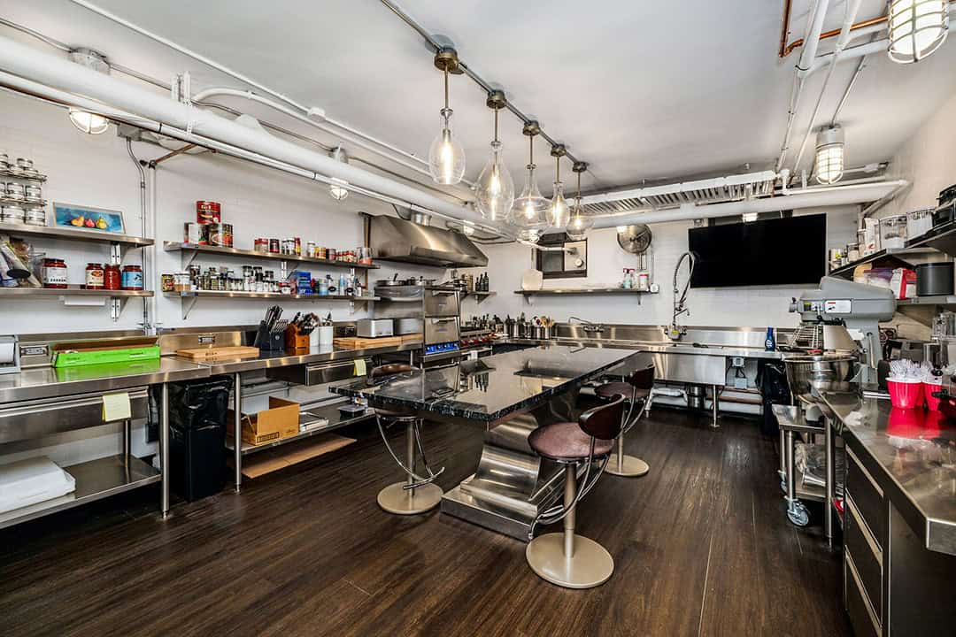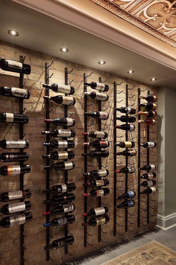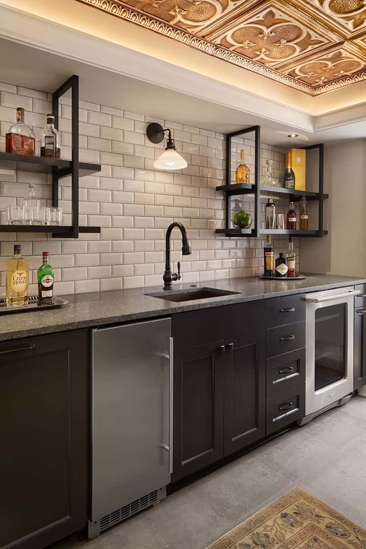 The lower level was transformed by repurposing unused storage into a Wine Room, featuring exposed Cream City Brick, a sleek and moody bar, and a traditional tin ceiling that nods to the home’s historic character. The addition of a professional catering Kitchen and bathroom complete this entertainment space.