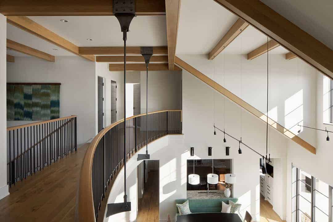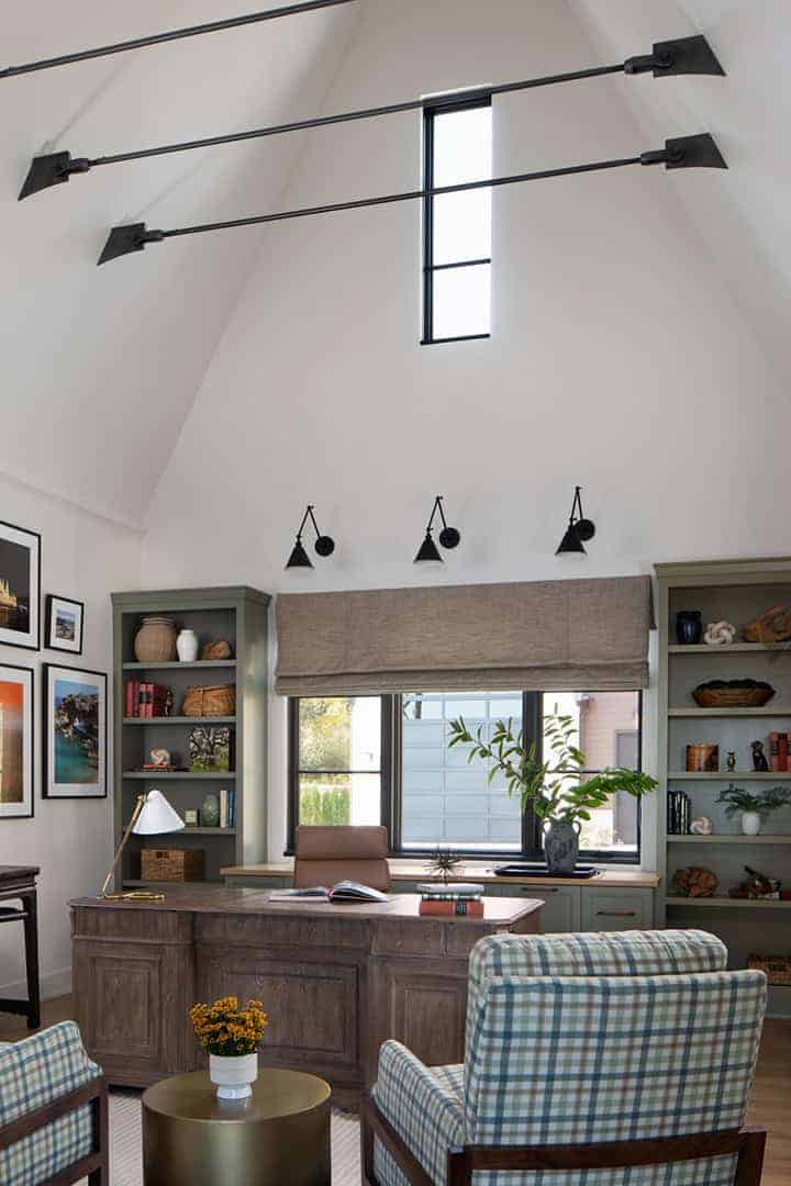 Inside, the aesthetic remains intentionally streamlined with trim-free drywall returns, the absence of crown molding, and light-stained white oak floors, keeping the interior architecture feeling fresh and uncluttered. Overhead, expressed metal collar ties define the interior peaks and visually anchor the expansive volumes, emphasizing ceiling heights that soar beyond 20 feet in the office, dining, and pavilion.