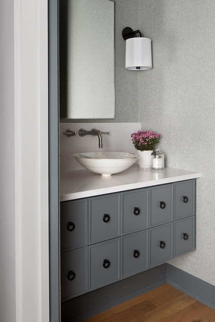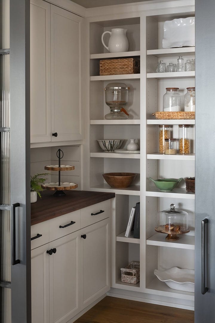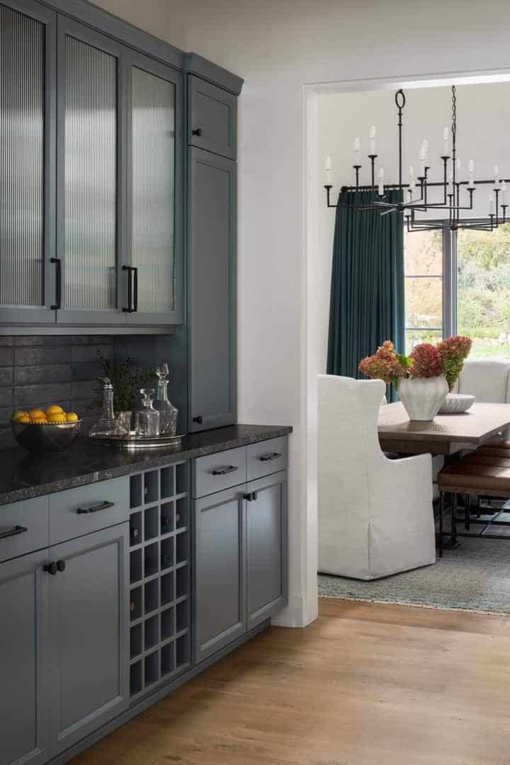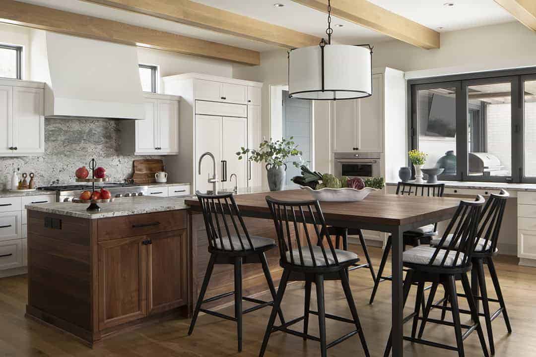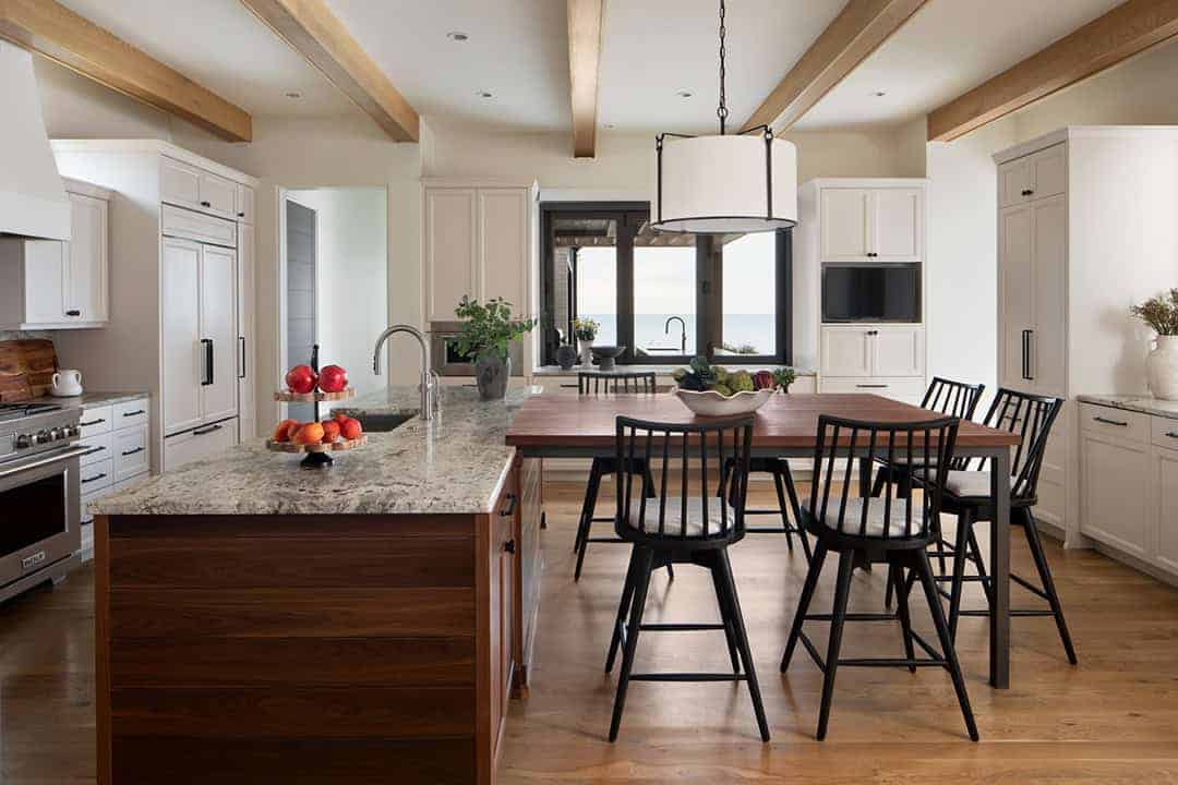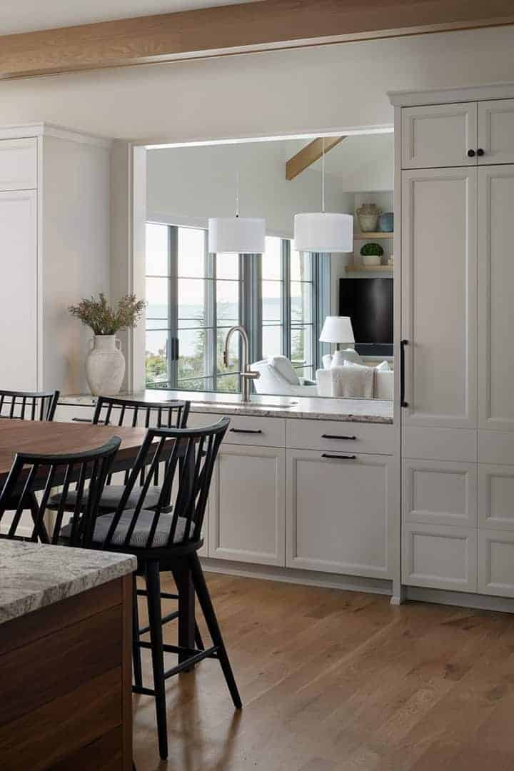 The open floor plan encourages an effortless flow from the kitchen to the great room and dining room; spaces created with lakefront entertaining in mind. Multiple kitchen zones, including the walk-in showcase and butler’s pantries, support large gatherings, from beverage prep and baking to indoor-outdoor grilling through a pass-through window. The kitchen opening provides a direct connection to the banquette in the great room for a cozy place to linger over morning coffee or casual meals.