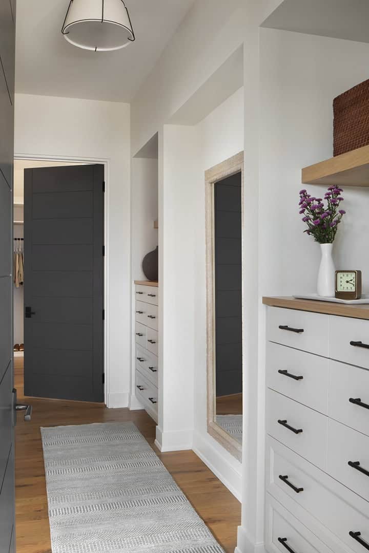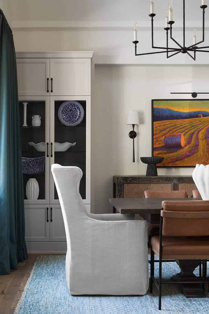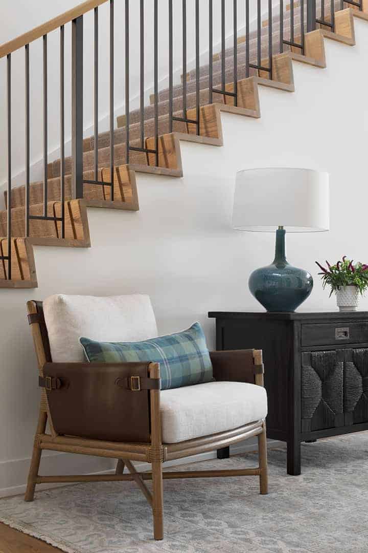 From the moment you enter, the home is designed to connect you both visually and emotionally to its surroundings. Modern and vintage elements are thoughtfully layered throughout. The foyer offers a clear view through to the lake beyond, with welcoming seating, lantern-inspired sconces, woven textures, and custom commissioned art setting a relaxed, camp-meets-luxury style.