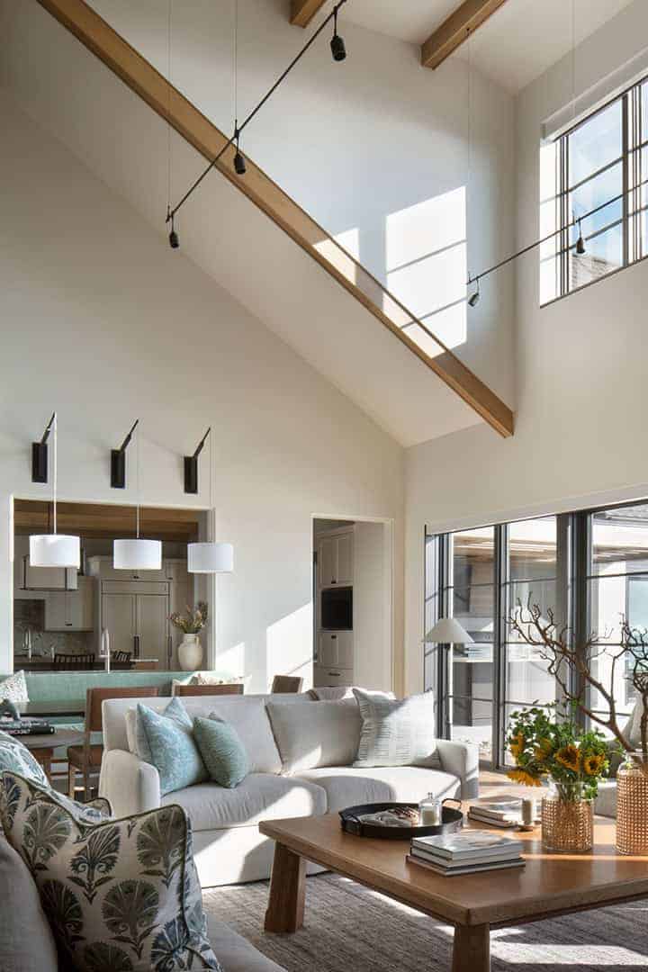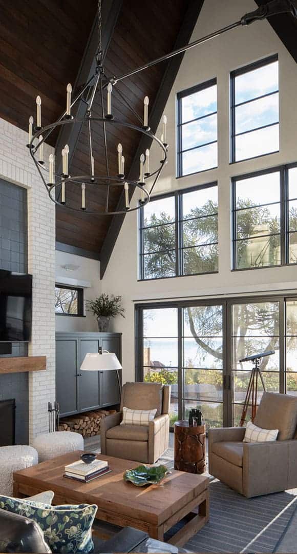 Great room seating is oriented toward the lake, with layered lighting – from wall-suspended pendants, to recessed, rail, and accent lights that allow the home to shift seamlessly from lively gatherings to quiet evenings.