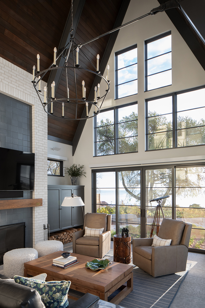 Great room seating is oriented toward the lake, with layered lighting – from wall-suspended pendants, to recessed, rail, and accent lights that allow the home to shift seamlessly from lively gatherings to quiet evenings.