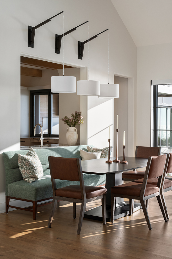 The open floor plan encourages an effortless flow from the kitchen to the great room and dining room; spaces created with lakefront entertaining in mind. Multiple kitchen zones, including the walk-in showcase and butler’s pantries, support large gatherings, from beverage prep and baking to indoor-outdoor grilling through a pass-through window. The kitchen opening provides a direct connection to the banquette in the great room for a cozy place to linger over morning coffee or casual meals.