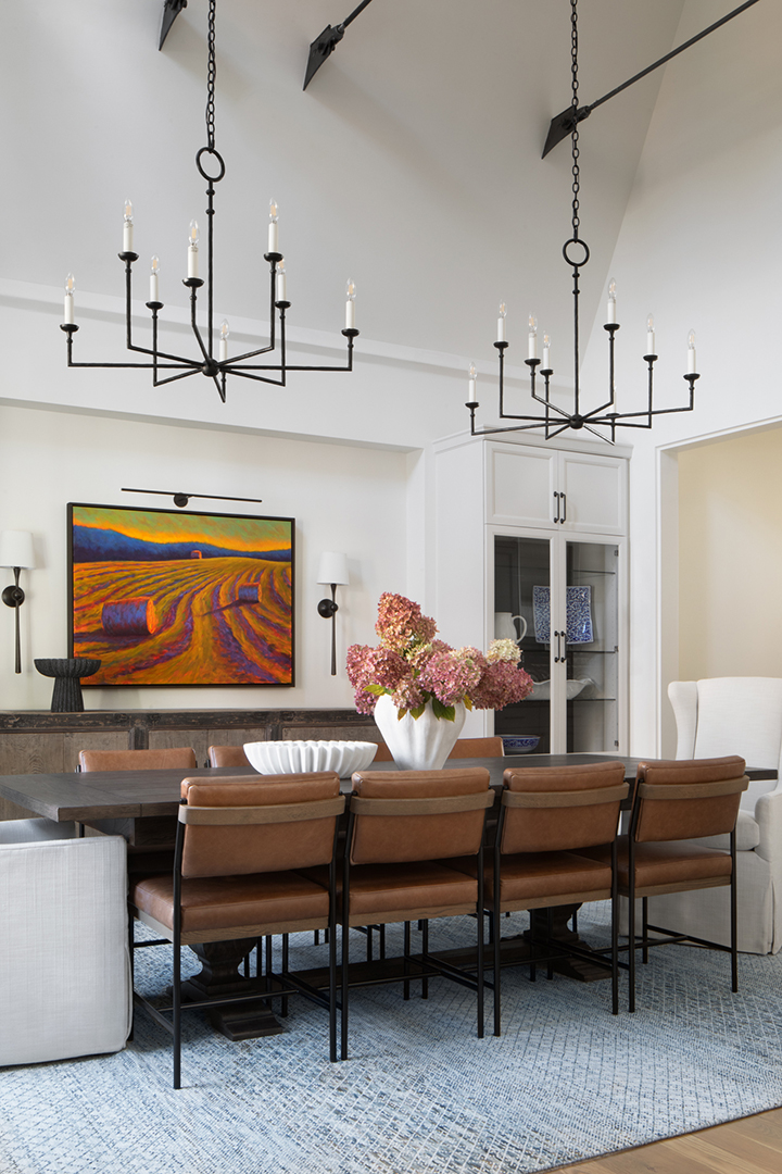 From the moment you enter, the home is designed to connect you both visually and emotionally to its surroundings. Modern and vintage elements are thoughtfully layered throughout. The foyer offers a clear view through to the lake beyond, with welcoming seating, lantern-inspired sconces, woven textures, and custom commissioned art setting a relaxed, camp-meets-luxury style.