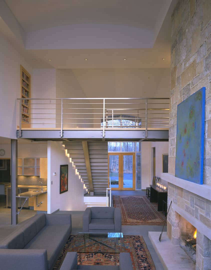 The entry to the home opens on a diagonal to the floating stone and steel stair inviting one through to the pond and forested view beyond. The core of family living, the Kitchen, is then revealed, around which the Dining, Living, and Screen Porch radiate. The bridge above the Living Room connects the girls’ and boys’ sleeping lofts. The Master Suite opens to the meditation deck where the warmth of fire and the sound of water spilling out of the spa complete this tranquil experience.