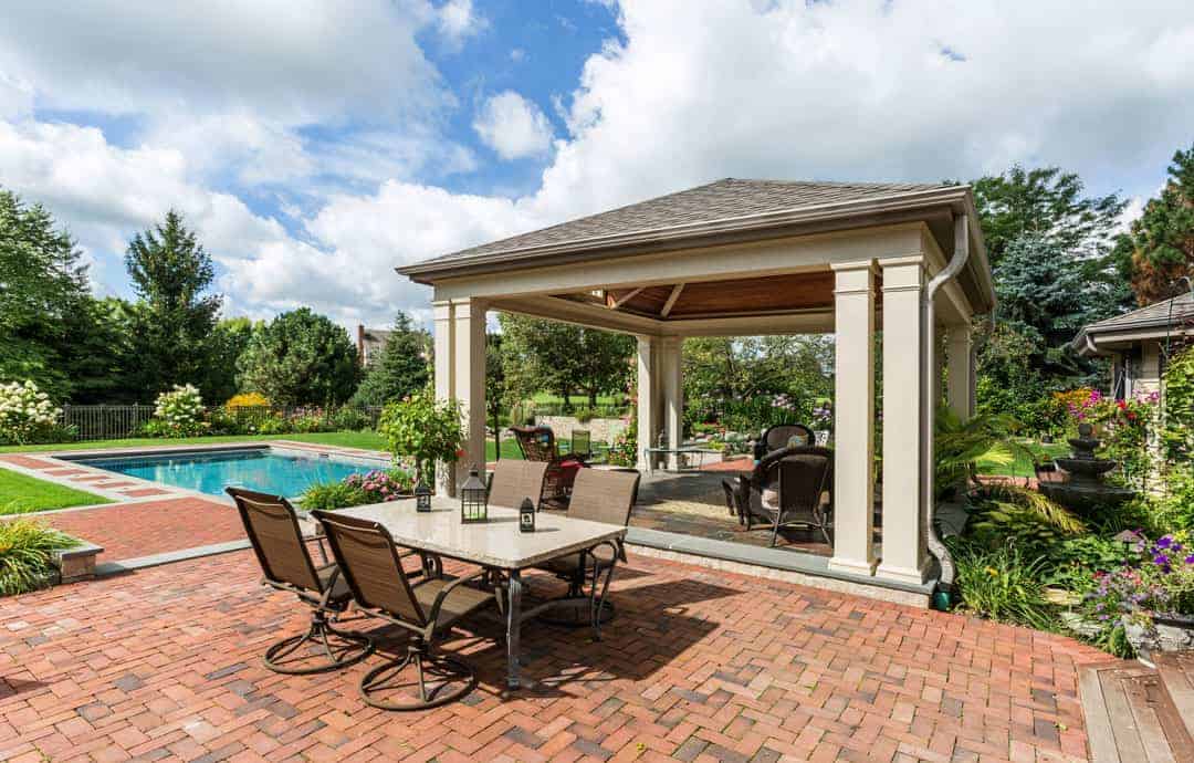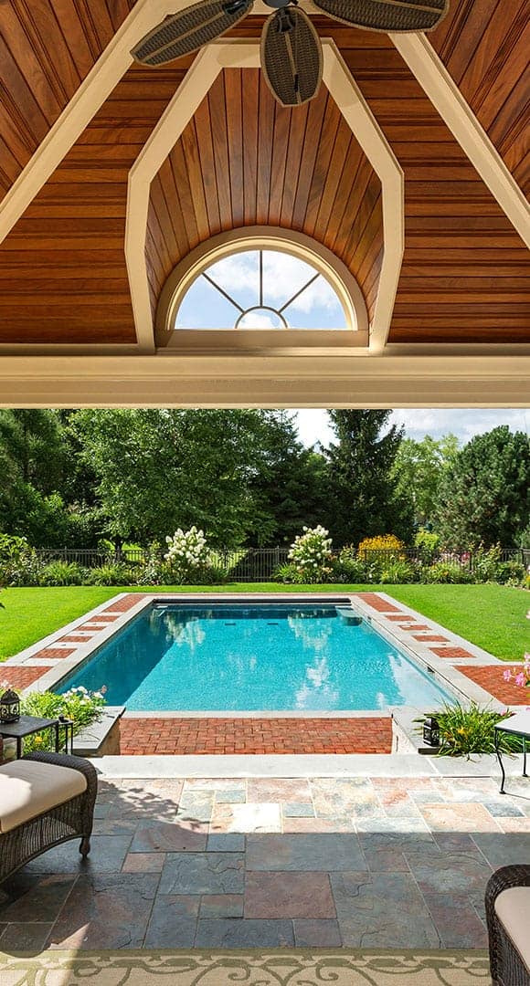The pool and pavilion center on the rear facade of the home to set up a traditional feel to the rear yard. This central organization creates a springboard for other symmetrically designed features like retaining walls with planter beds, steps to the pool, pathways and pavers, water jets on both sides of the pool, and gardens. The pavilion overlooks the pool and furthers the classic look by being supported with traditional columns at its corners. Warm paint color selections along with a stained mahogany ceiling panel create coziness and intimacy in this space. Natural light floods into the pavilion with a centrally located half-round window, which focuses the users’ view to the pool and vistas overlooking the whole rear yard.