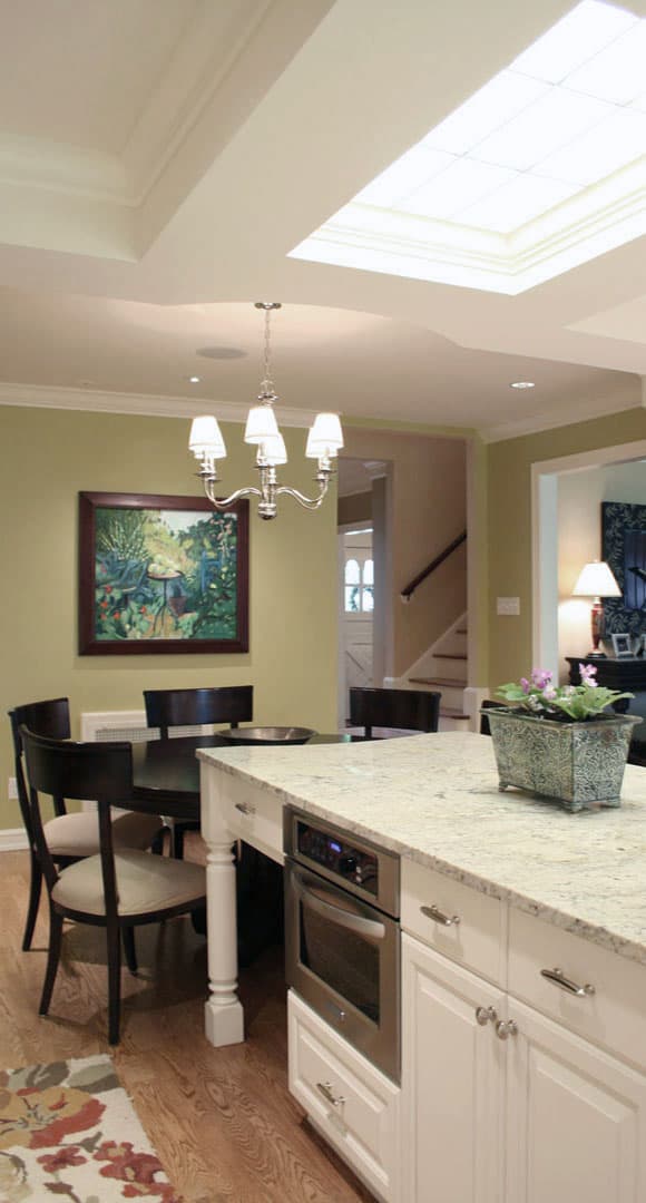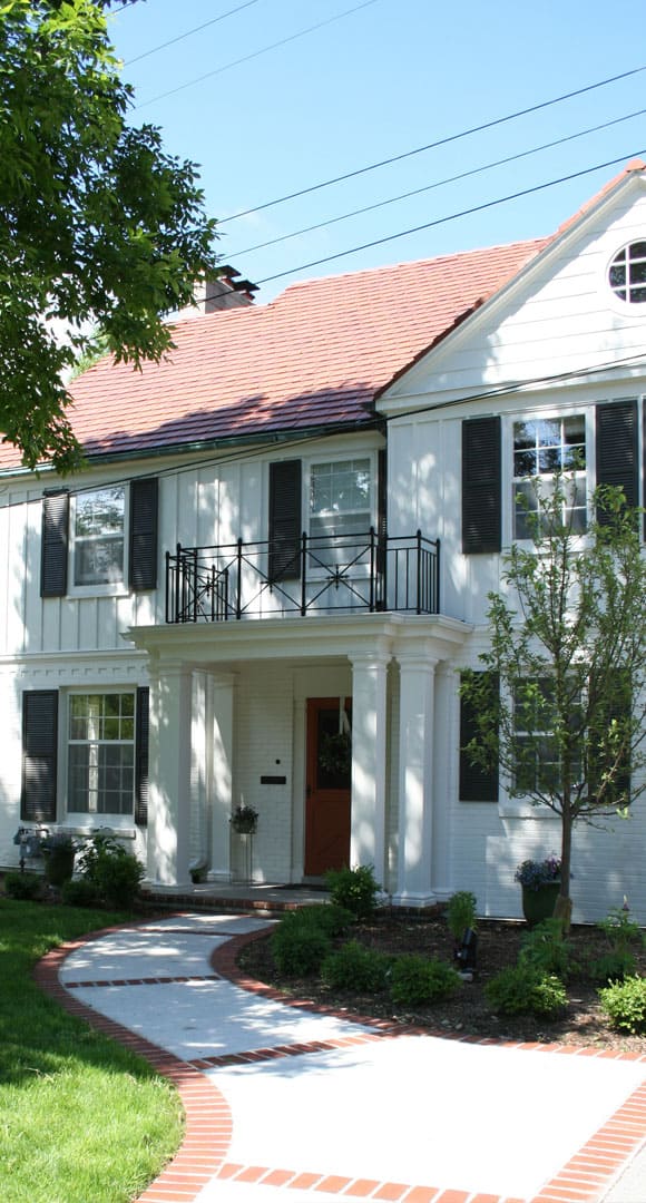 The new Kitchen now has a view of the parkway and is flooded with natural light from the over-sized box window. The built-in dining table, while connected to island, is designed as a separate furniture piece for the family dining experience. The off-white tones of the painted millwork enlarge the space and complement the existing painted trim of the ear. The new rear door connects to the grilling terrace and the expansive view of the Parkway.The new Front Porch at the street side marks the new entry sequence and welcomes the visitor as it provides shelter. Reuse of the original front door beckons the home’s historical roots. By connecting the new Foyer to the existing Stair and new Kitchen beyond, circulation was improved and expands the visual size of the interior.