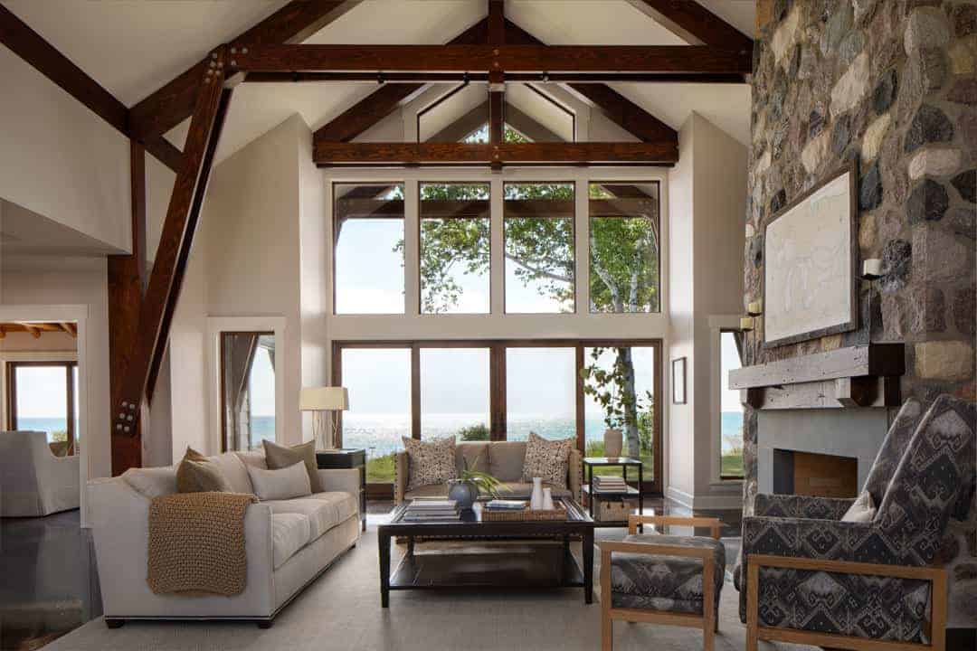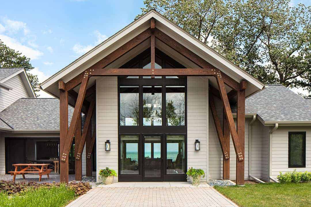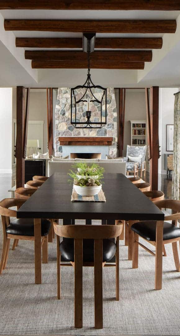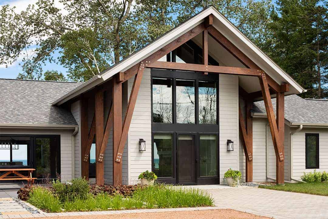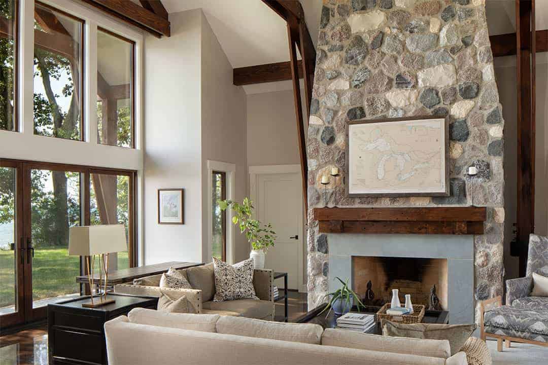 The first impression at the new Entry is influenced by contemporary Douglas Fir column beam trusses and tall windows that create a rhythm and connection between inside and outside. Concrete flooring over radiant heating is coated in a colored, glossy finish to reflect fluidity and light. To create the new chimney, stones were hand selected for an authentic appearance to those collected on the beach for the Hearth Room’s original. The mantle is a token taken from their previous Victorian home in Saint Paul, repurposed from a support beam that now serves as the fireplace anchor. Log ceiling beams in the new Dining Room are crafted from existing knotty pine. Sliding doors stack to open the front of the house, naturally joining to the exterior Grill Patio and Rain Garden.