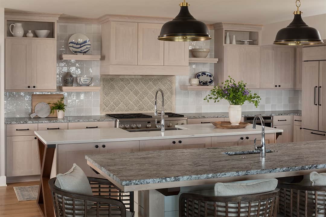 A larger Kitchen design with a double island floor plan defines entertaining for crowds. The primary island is the chef’s island, and functions for food preparation and cooking. It has a contrasting countertop and houses a sink and dishwasher with cross beams on either end. The second island is a hosting island designed for entertaining and beverage service to move the crowd away from the cooking area. This island features a shiplap base and beam detail with a trough sink, ice maker and undercounter beverage refrigerator. The Kitchen cabinets are Amish made in Wisconsin with a hand applied whitewash finish. The new Kitchen is situated next to the original Hearth Room, which provides a connected overflow space for additional guests.