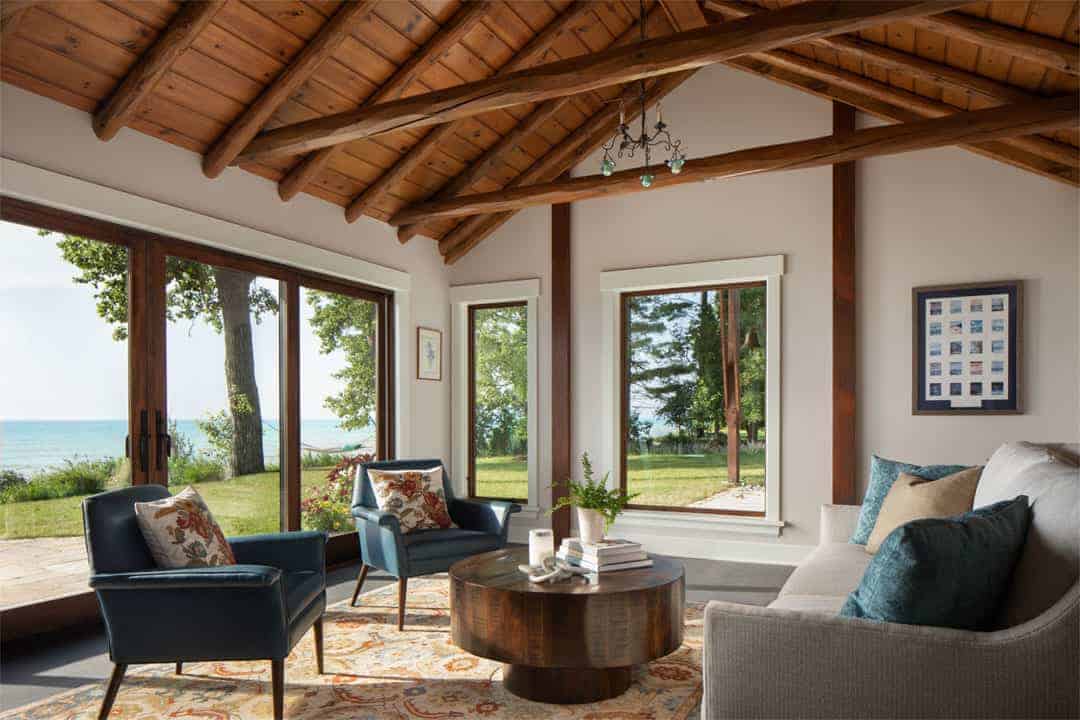 The existing Lake Room had part of the roof removed and preserved, while the structure beneath was modified with sliding doors to open to the lake. The roof was then re-set, and the existing hand-hewn logs were repurposed.