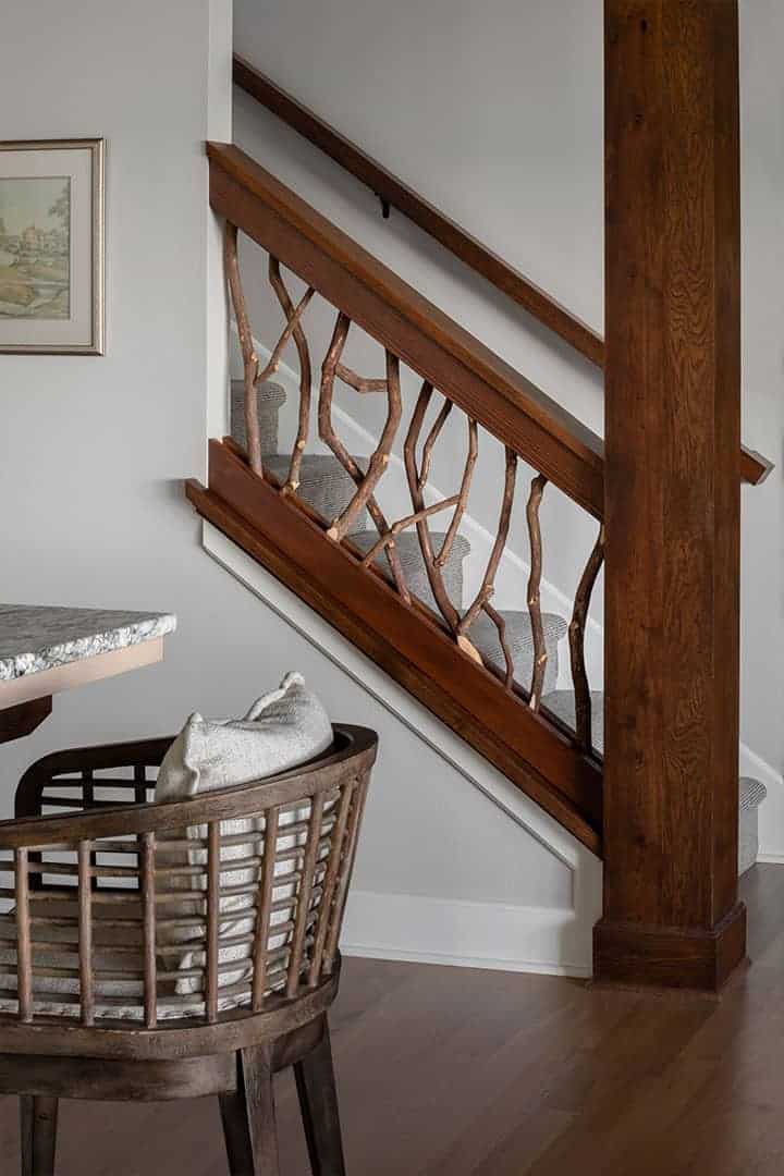 To better accommodate visitors, expanded sleeping rooms were a must. Accessible only by a tight spiral stair, the existing second floor’s log structure and roofline was modified to accommodate the addition of a Bedroom, Loft, and full bathroom. A new staircase now ascends to the upper floor and features a hand assembled stick railing.