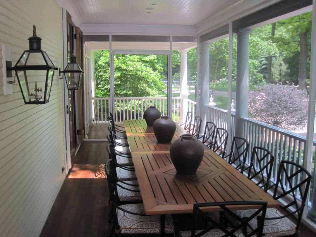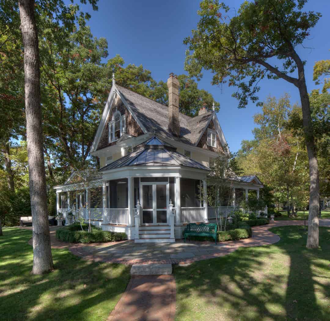 A large wrap-around screen porch addition furthers the Queen Anne style of the original house while defining distinct zones for outdoor enjoyment.