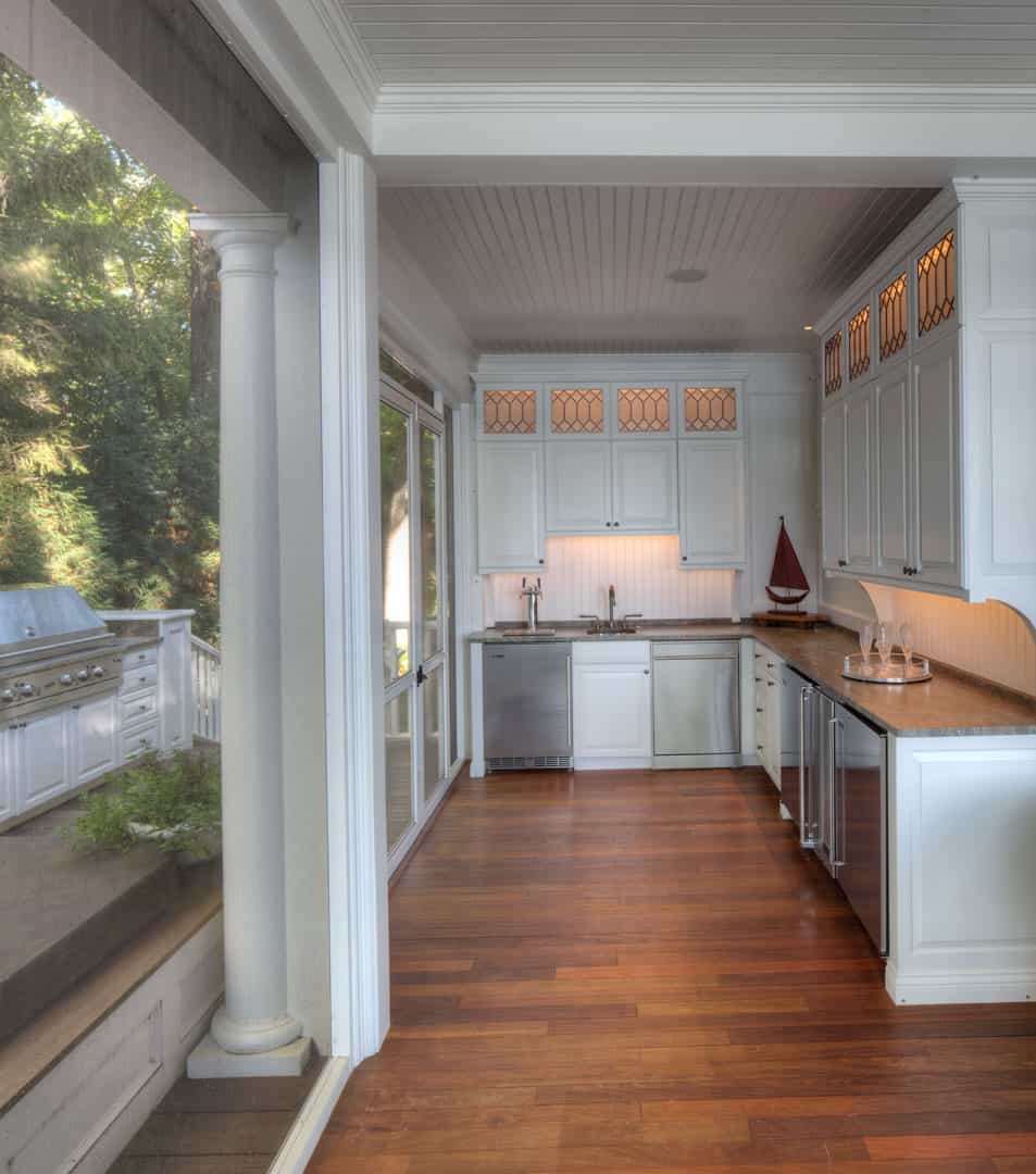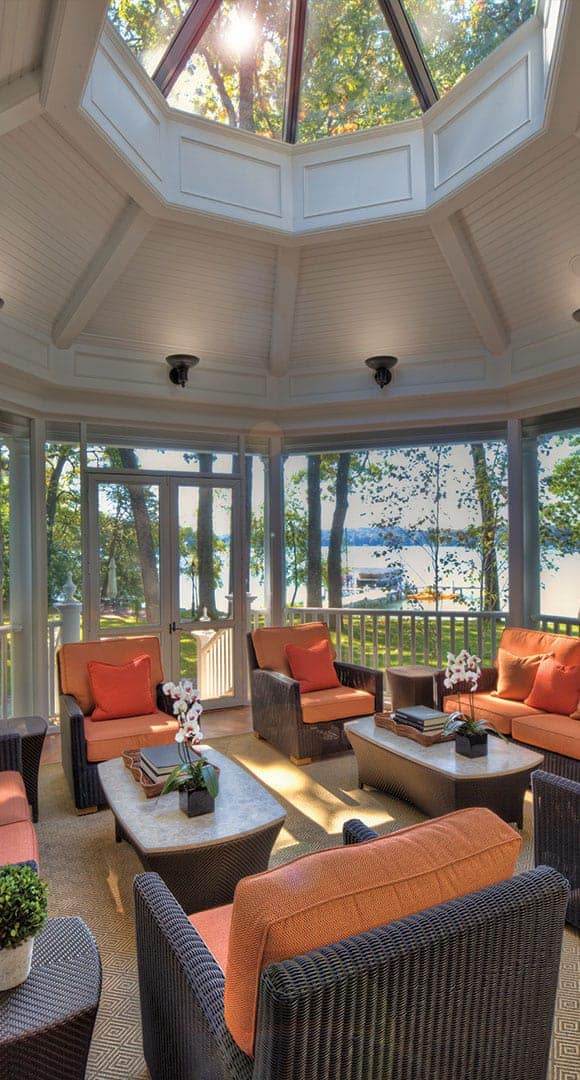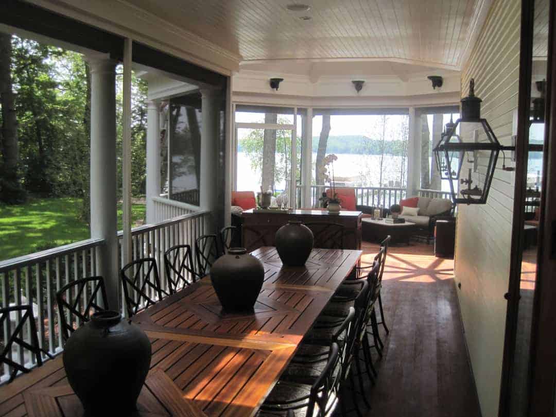 The deck on the screened porch is made of sustainable tropical hardwood. It has the look of a traditional wood deck but has enhanced performance characteristics one would expect in a luxury home. The screen windows and doors are designed to have a minimal presence to maintain an open porch feel, take on lake breezes, and maximize panoramic waterfront views.
