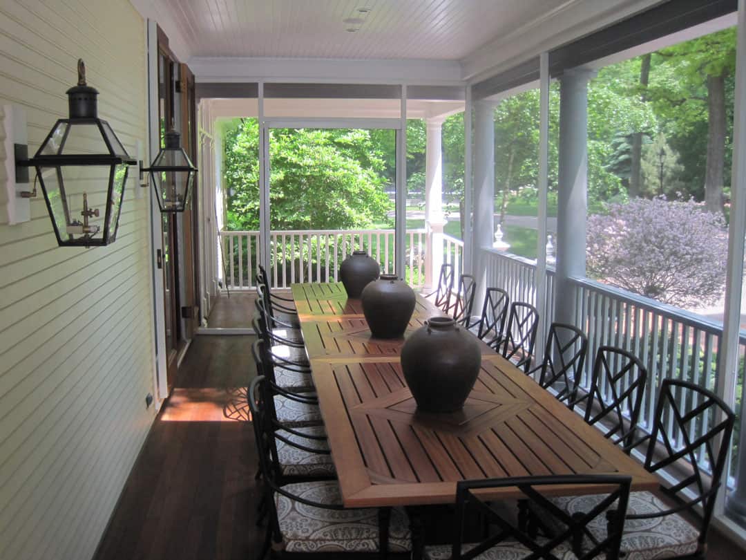 The deck on the screened porch is made of sustainable tropical hardwood. It has the look of a traditional wood deck but has enhanced performance characteristics one would expect in a luxury home. The screen windows and doors are designed to have a minimal presence to maintain an open porch feel, take on lake breezes, and maximize panoramic waterfront views.