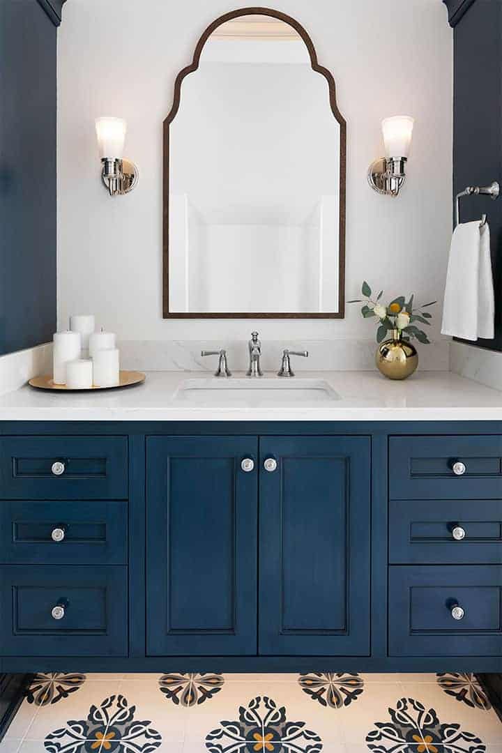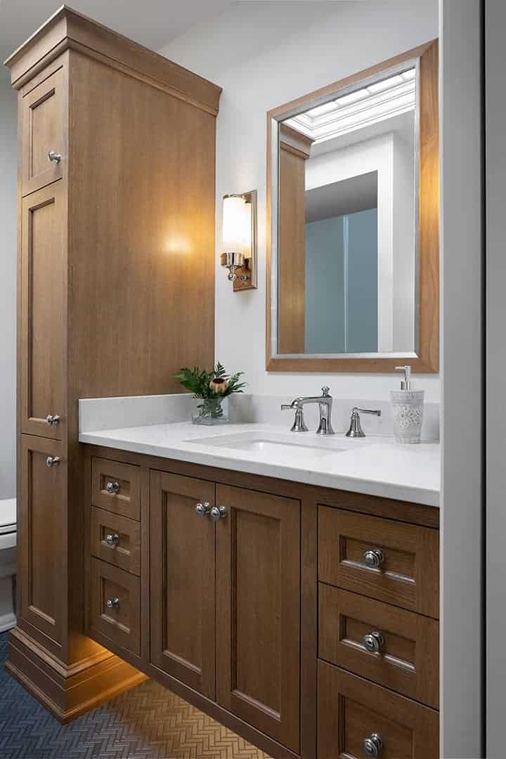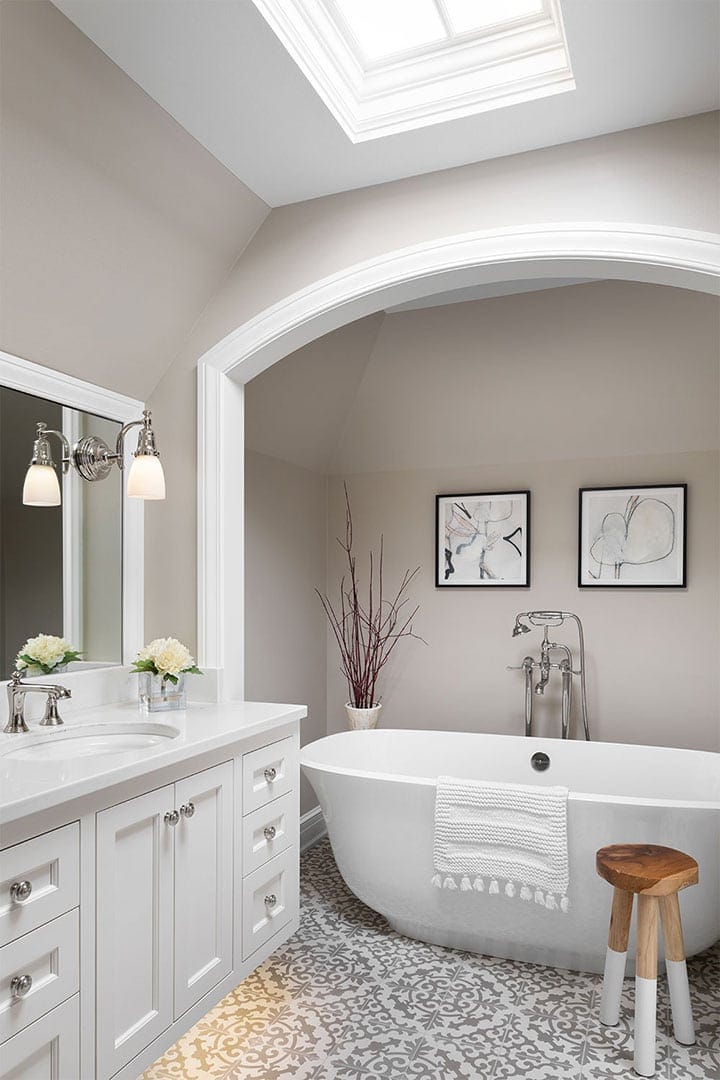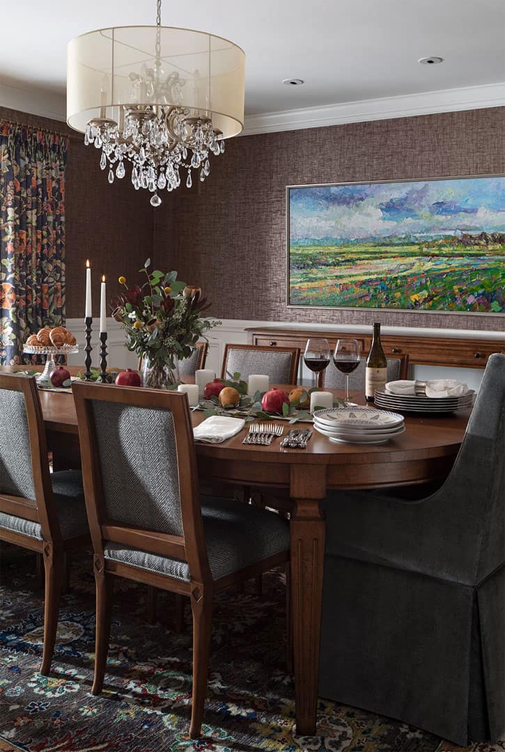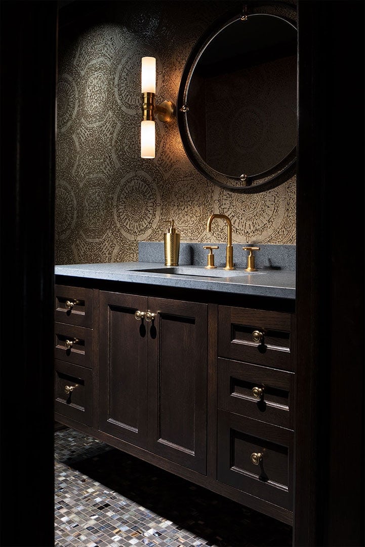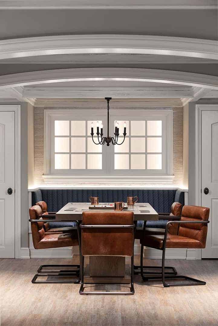 Updating the main level Master Suite began with recognizing the En Suite was undersized and inefficient relative to the scale of the home. The Bedroom and Closet were also in need of improvement. Window locations were changed to reorient the bed, creating improved Feng Shui, and beam work and lighting enhanced the existing tray ceiling. Arched openings frame the Shoe Closet designed with glass doors and silver leaf wallpaper, creating separation from the enlarged Dressing Room.The barrel-vaulted ceiling in the Bathroom addition culminates at the freestanding tub before an arched window. The makeup vanity, flanked by tall cabinets, provides an area to style for the day. A center cabinet grounds two floating vanities appointed with medicine cabinets designed into a custom backsplash detail.In the Dining Room, silver metallic backed grass cloth and new wainscot transformed the existing fuchsia walls that distracted from a formal dining experience. The dining table, upholstered seating, window treatments, and area rug were custom selections to provide a transitional style.Upstairs, two en suites were in need of updates, and a third was added into unused attic space. Again, floating cabinetry and arched openings were consistent design features. Faux skylights create an element of natural light in these under roof baths. In Bath #2, expansion into existing attic space allowed for the addition of a soaking tub, which organized the room into three zones. In Bath #3, pocket doors replaced swinging doors for better function. Expansion into a bedroom provided space for floating vanities and a larger shower. The connection was simplified to the added Bath #5 with a hallway where a mirror conceals attic access. The cement tile compliments existing wallpaper in the bedroom.The lower level transformed into a Gaming and Lounge area, Media Room, Powder Room, and Exercise Room. A Scrabble board surrounded by swivel chairs provides a unique way to host game night. New ceiling beams and arched cased openings separate the Lounge from the Game area. The custom Banquette’s faux window anchors the space and illuminates the room.In the Media Room and Powder Room, a darker stain creates an elegant and moody style. A coffered ceiling conceals structural beams and features a fiber optic lighting element. Textured wallpaper and sconces elevate this sophisticated theatre. The Powder Room’s metallic patterned wallpaper plays off the gold fixtures, sconces, and tile floor. The floating vanity matches the style now found throughout the home.The design concept pays tribute to the home’s French Traditional features, while reflecting the homeowner’s desire for a cleaner transitional aesthetic. The striking results of this basement remodel brought new life to a previously seldom used space, making it a family favorite.